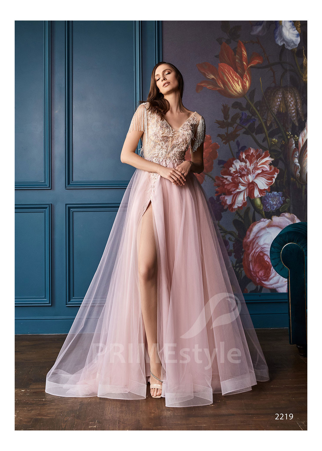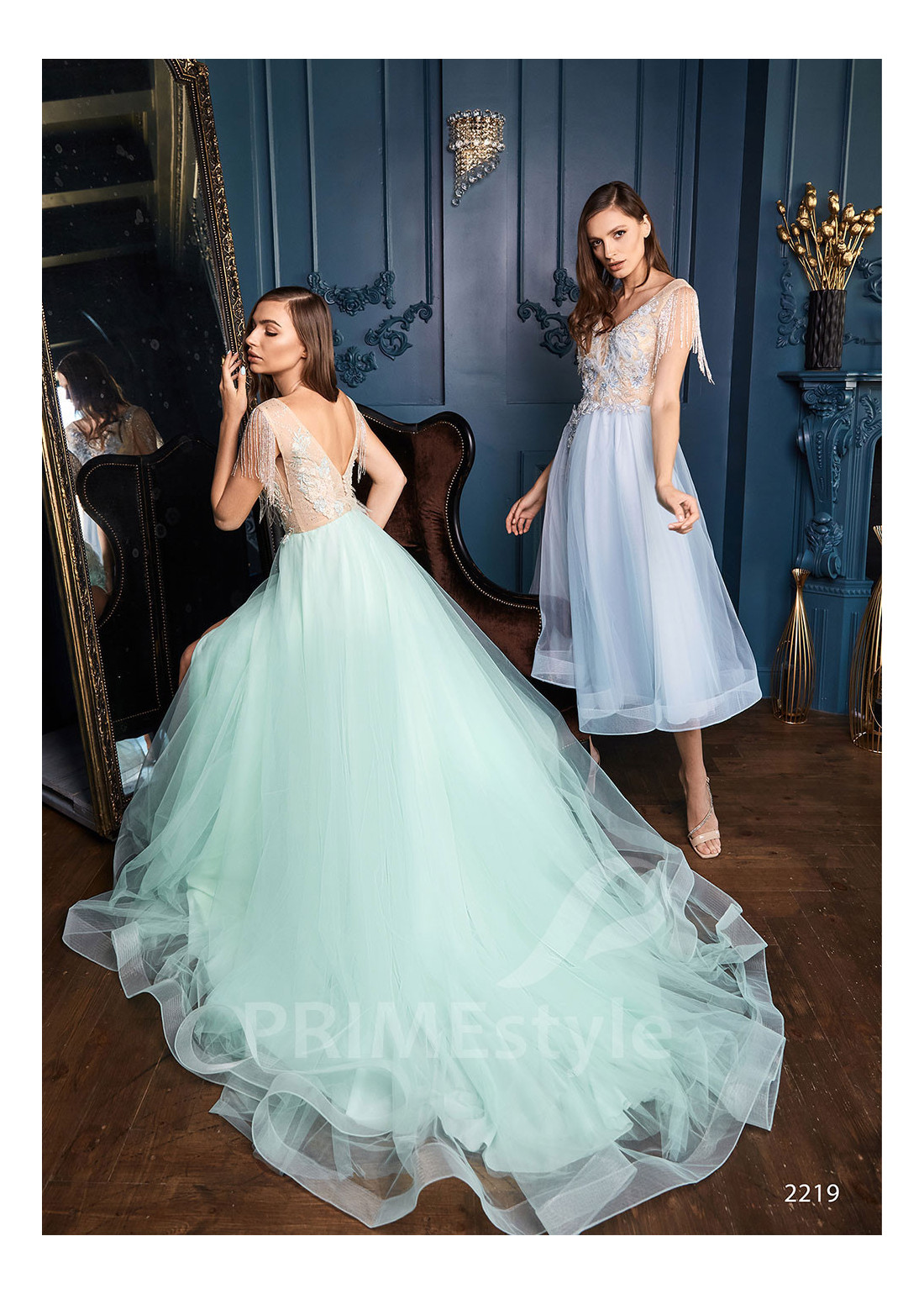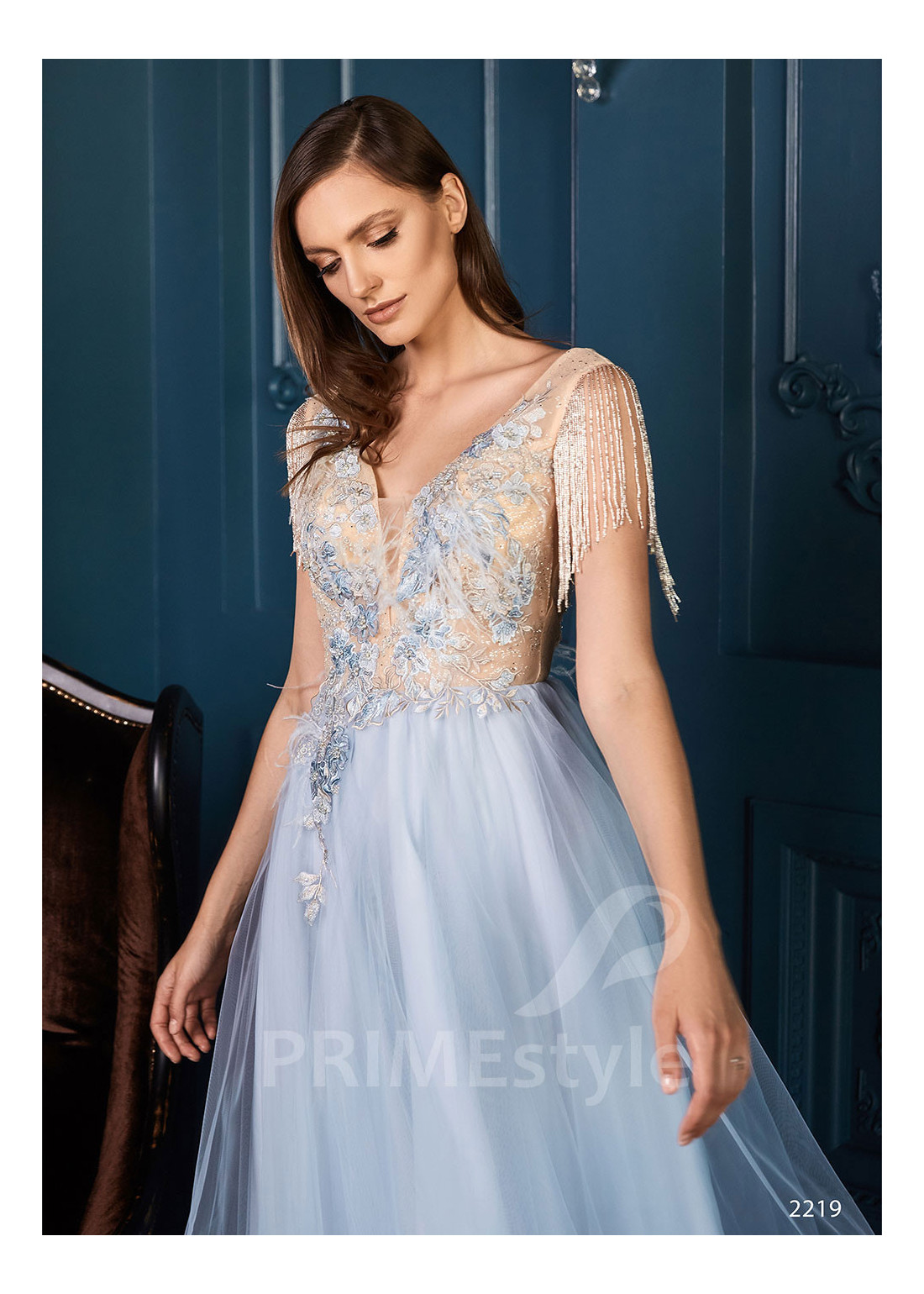 Graciózne tylové spoločenské šaty s otvoreným dekoltom, hlbokým výstrihom do V-čka, mierne odhaleným chrbtom a s ľahkou padavou tylovou sukňou s rázporkom. Možnosť ušitia s midi alebo maxi sukňou.