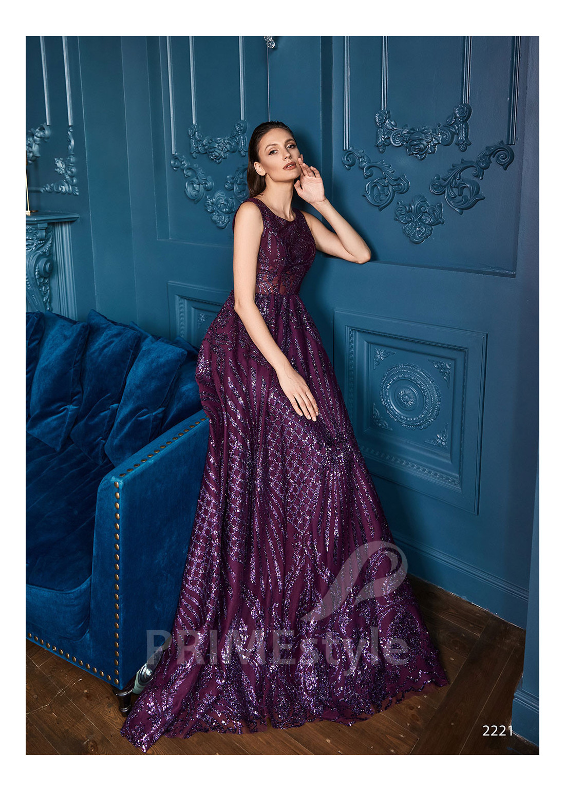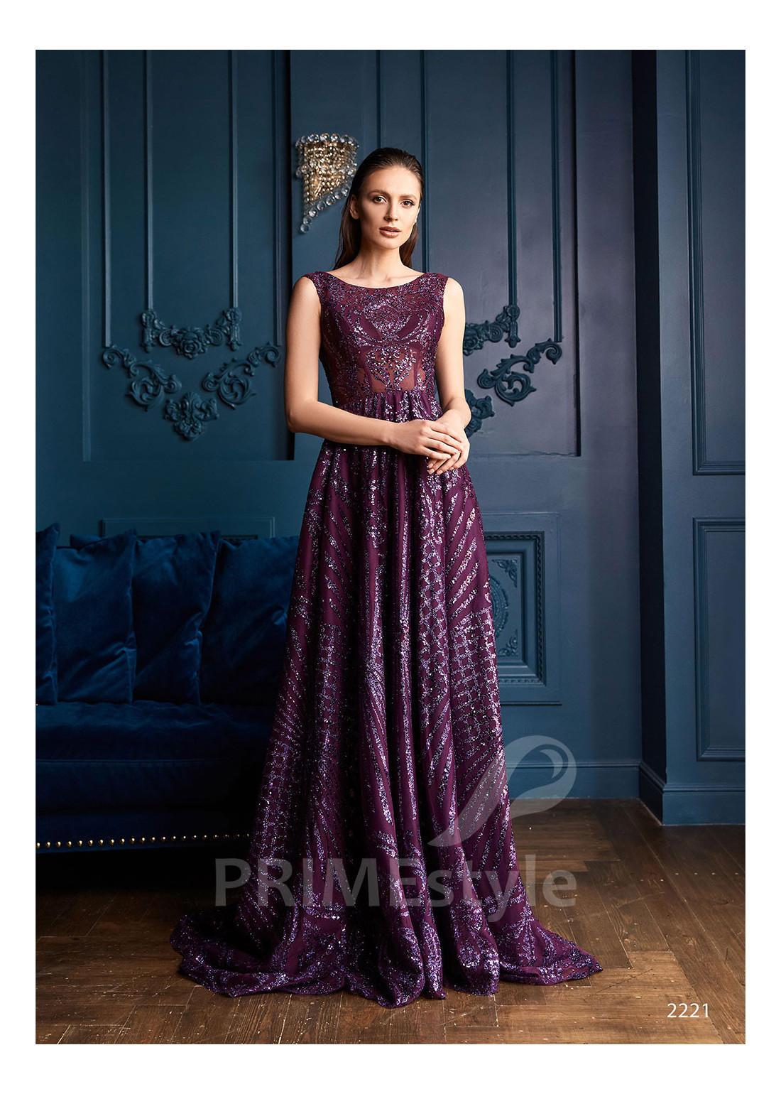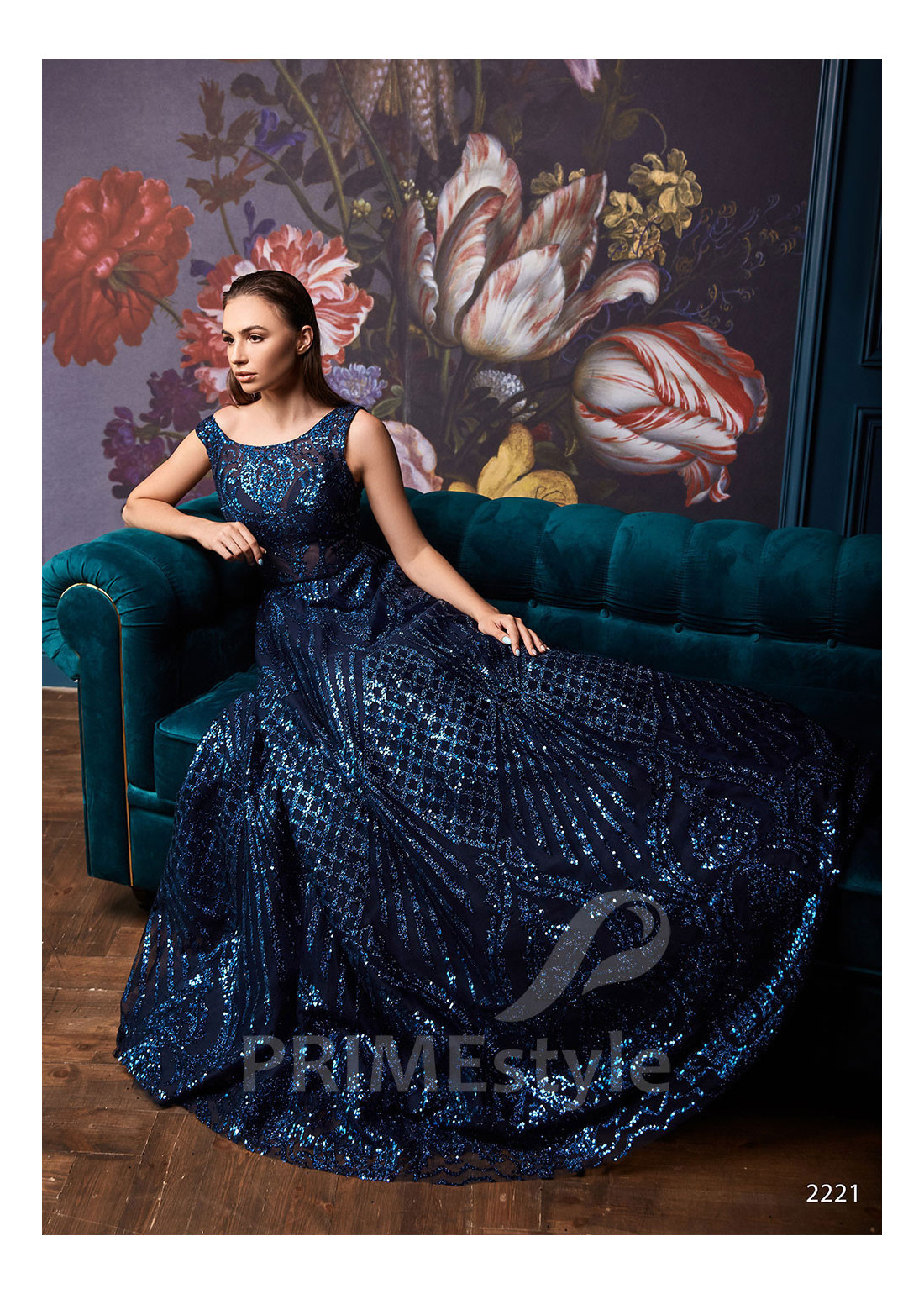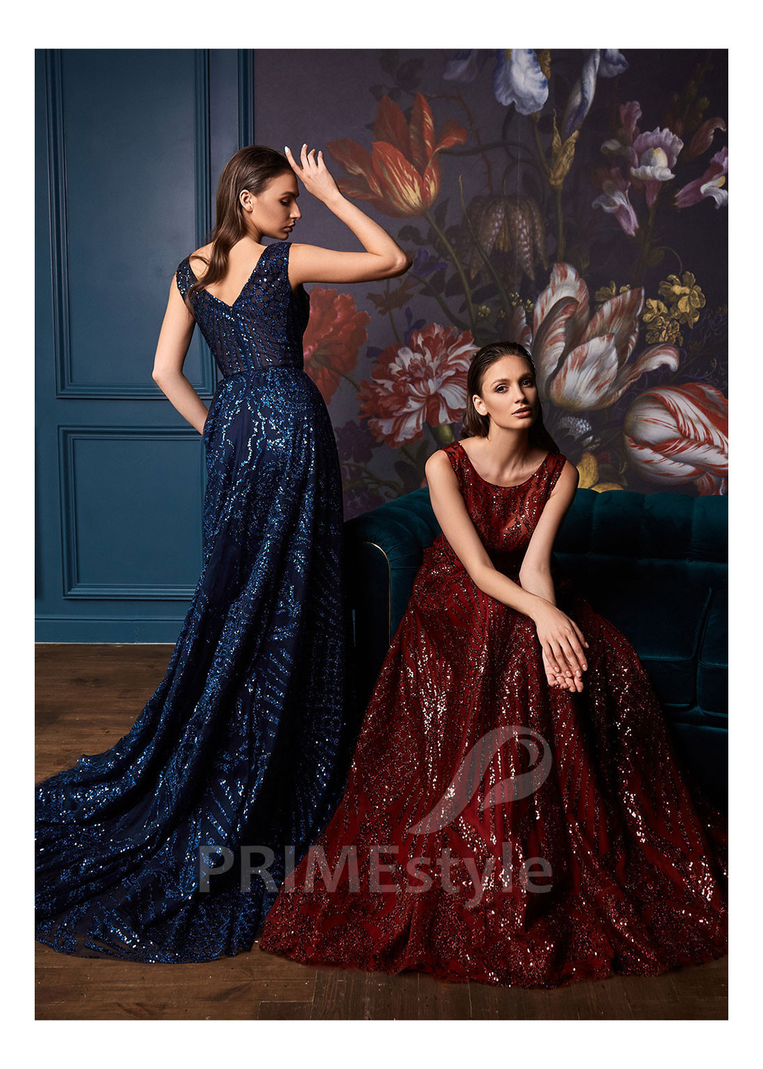 Slávnostné celotrblietavé spoločenské šaty s lodičkovým výstrihom na hrudi, mierne odhaleným chrbtom a objemnou A-čkovou sukňou. Vhodné ako šaty na ples a šaty na stužkovú.