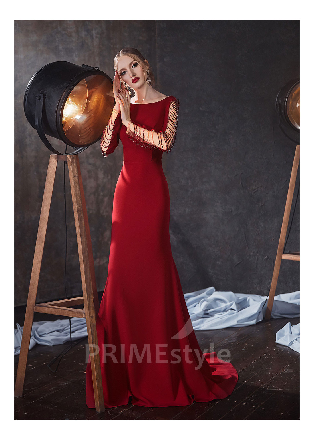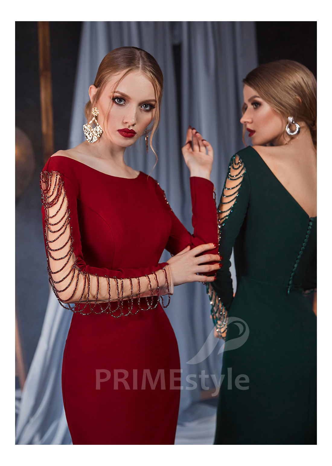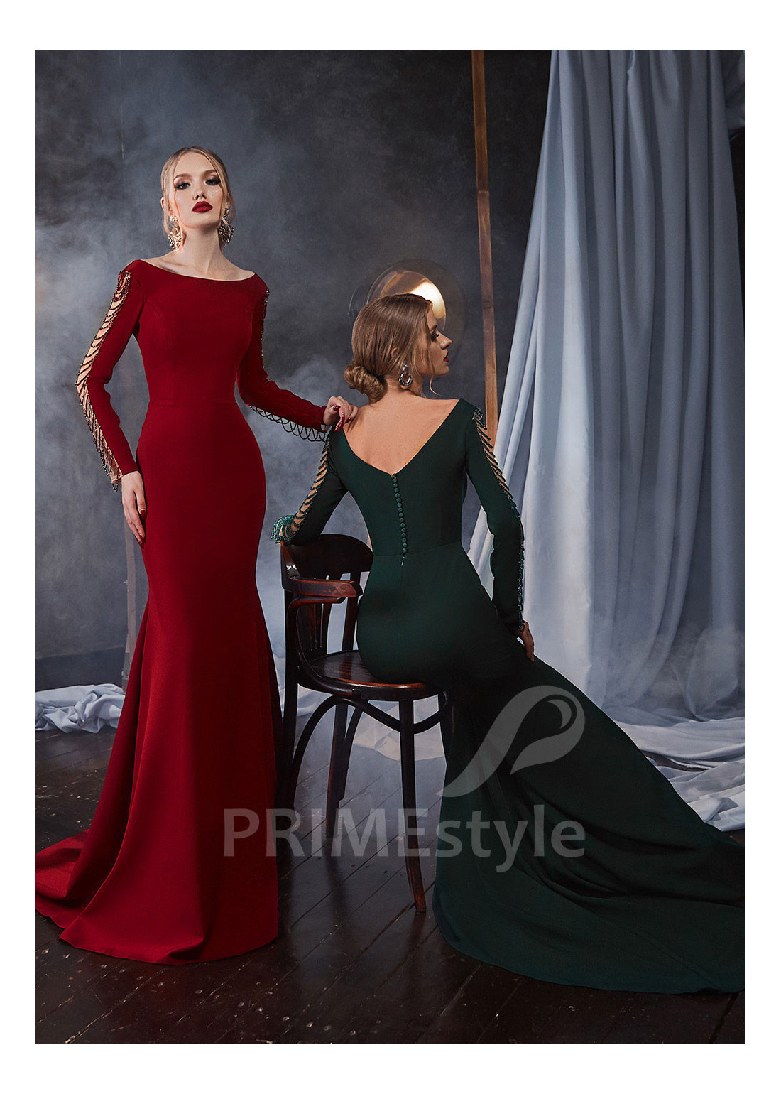 Elegantné úzke spoločenské šaty lodičkovým výstrihom an hrudi, mierne odhaleným chrbtom, originálnymi zaujímavo tvarovanými rukávmi a priliehavou sukňou. Vhodné ako šaty na ples, šaty na stužkovú a šaty na svadbu.