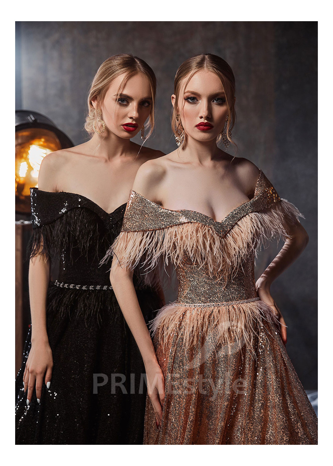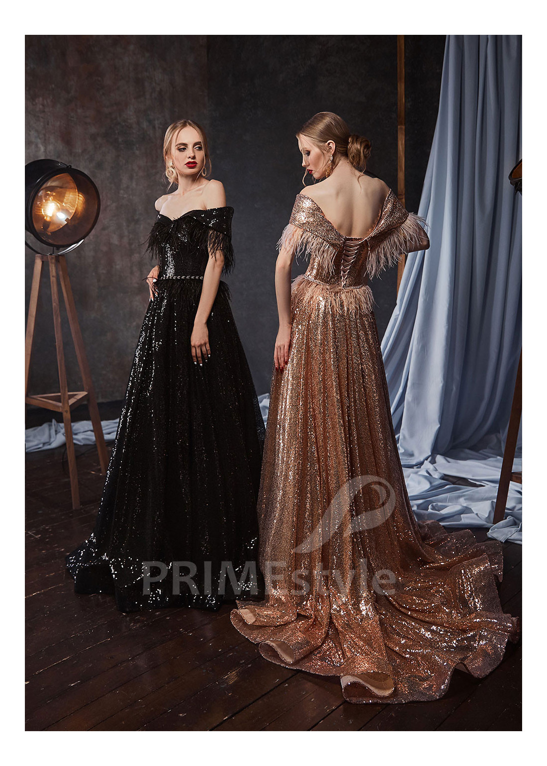 Slávnostné celotrblietavé spoločenské šaty s padnutými ramienkami s otvoreným dekoltom, odhaleným chrbtom a s efektnou padavou sukňou. Okraj korzetu, ramienka a pás sú dekorované pierkami. Vhodné aj ako šaty na stužkovú a popolnočné šaty.
