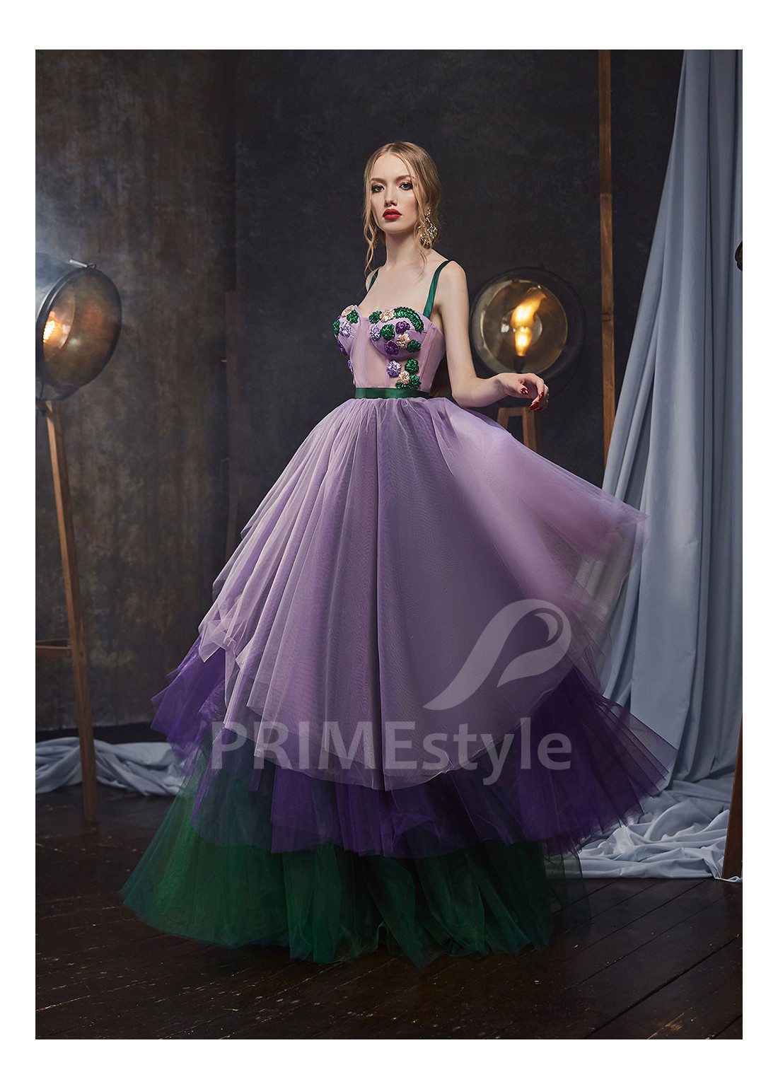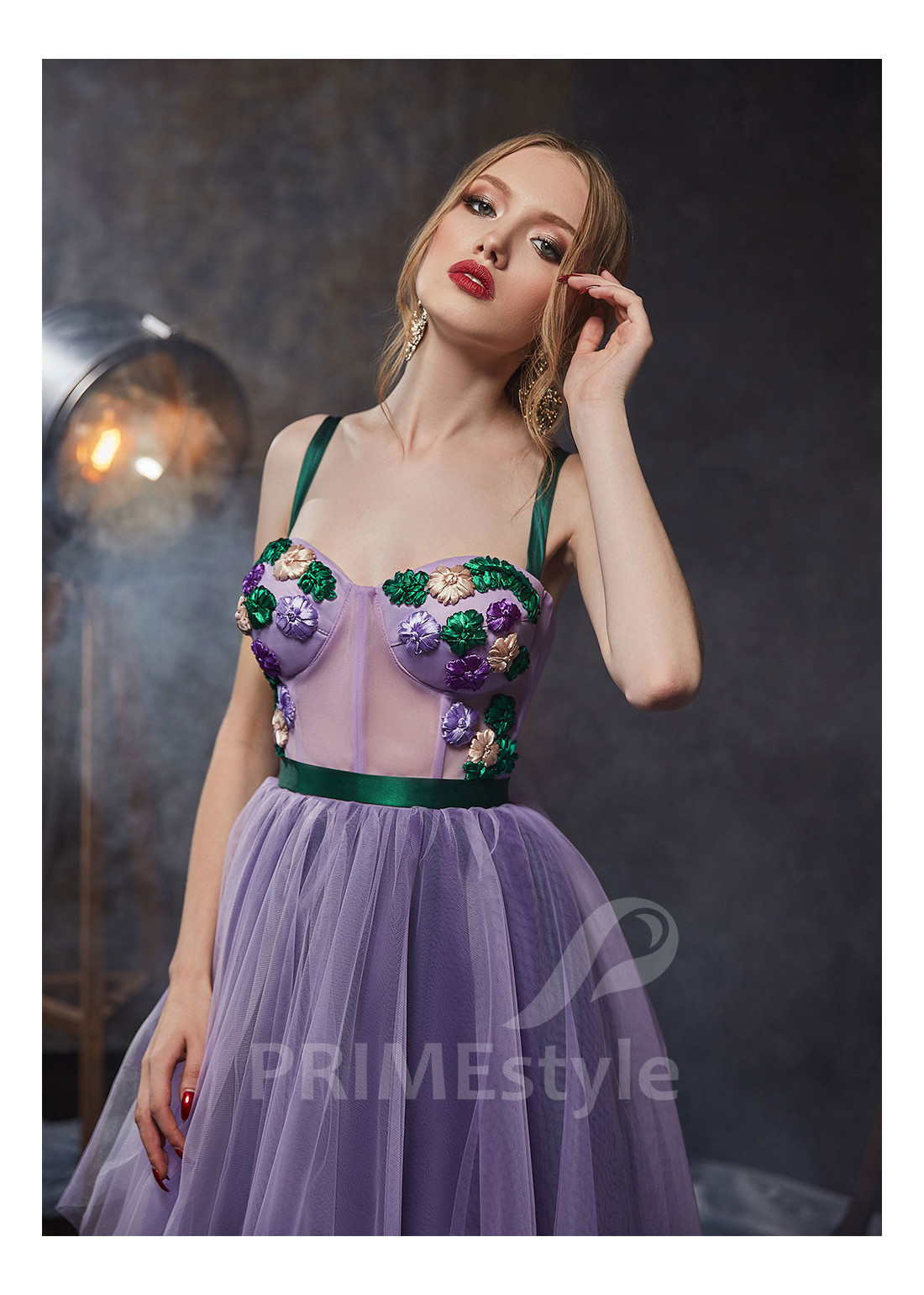 Originálne tylové spoločenské šaty na ramienka s trendovým srdiečkovým výstrihom an hrudi, priesvitným korzetom a s zaujímavo tvarovanou vsrtvenou sukňou. Korzet je zdobený farebnými 3D kvetmi. Vhodné ako šaty na ples, šaty na stužkovú, šaty na svadbu a popolnočné šaty.