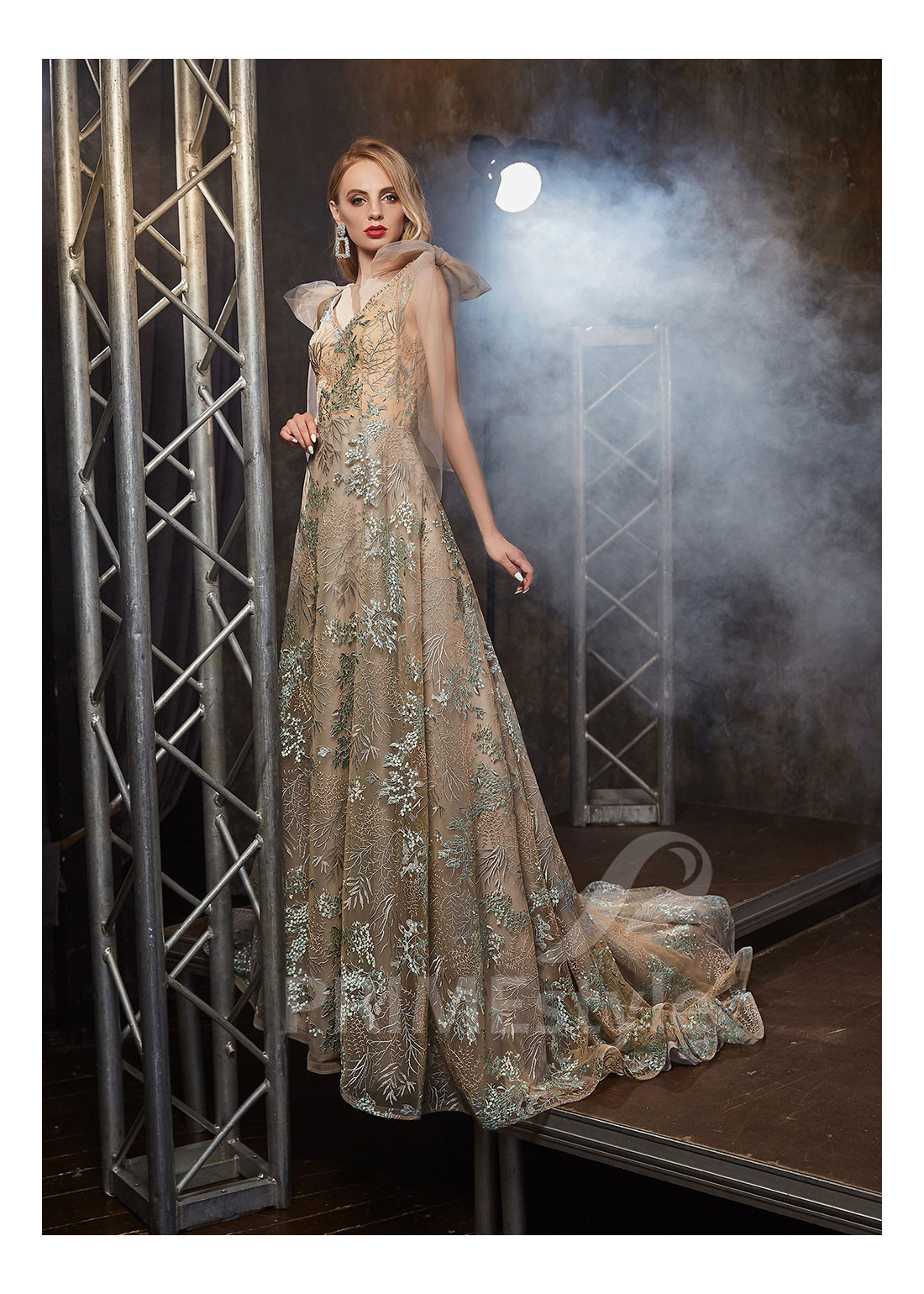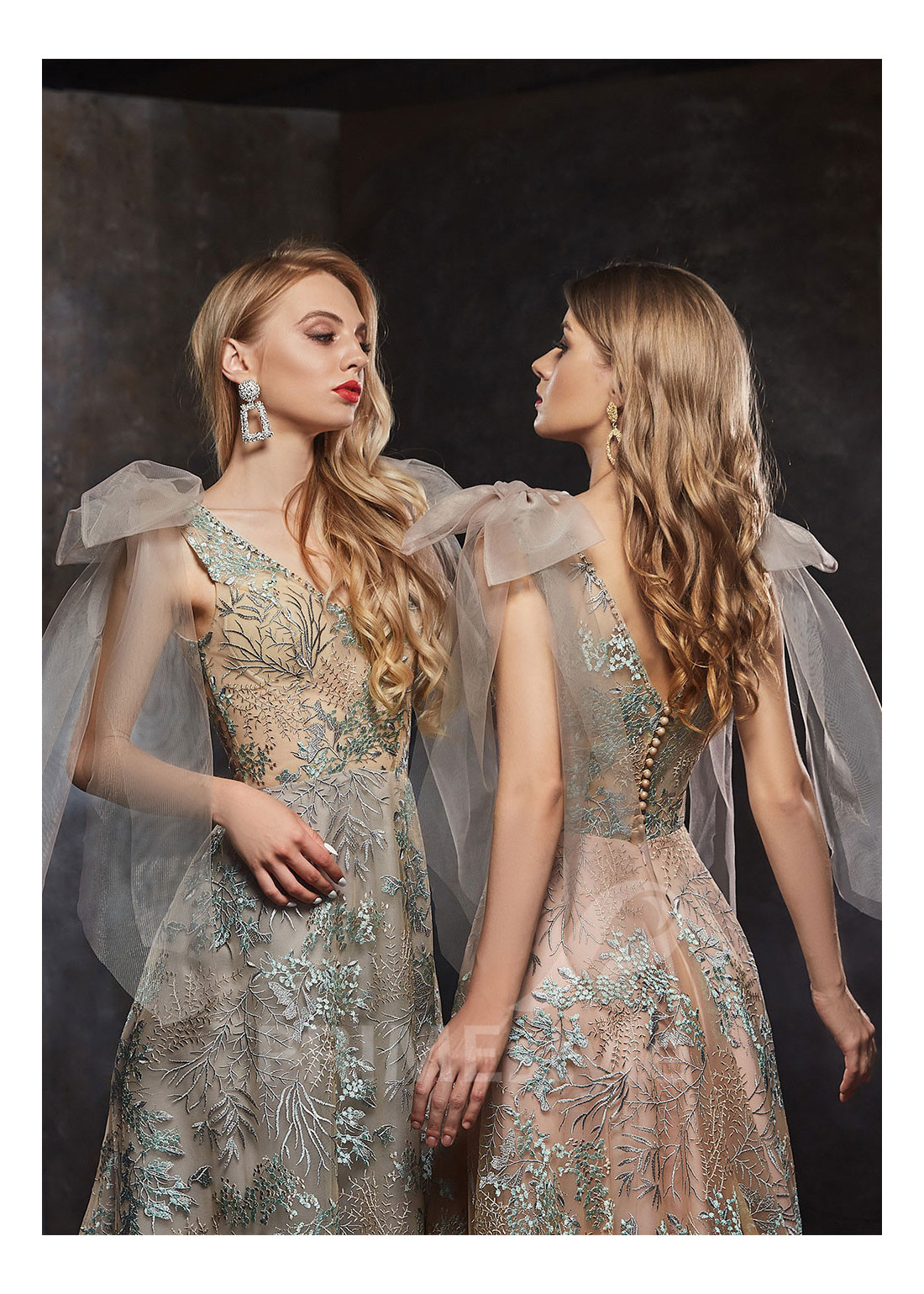 Moderné celočipkované spoločenské šaty s výstrihom do V-čka, odhaleným chrbtom a pekne tvarovanou bohato zdobenou A-čkovou sukňou. Vhodné aj ako šaty na stužkovú a popolnočné šaty.