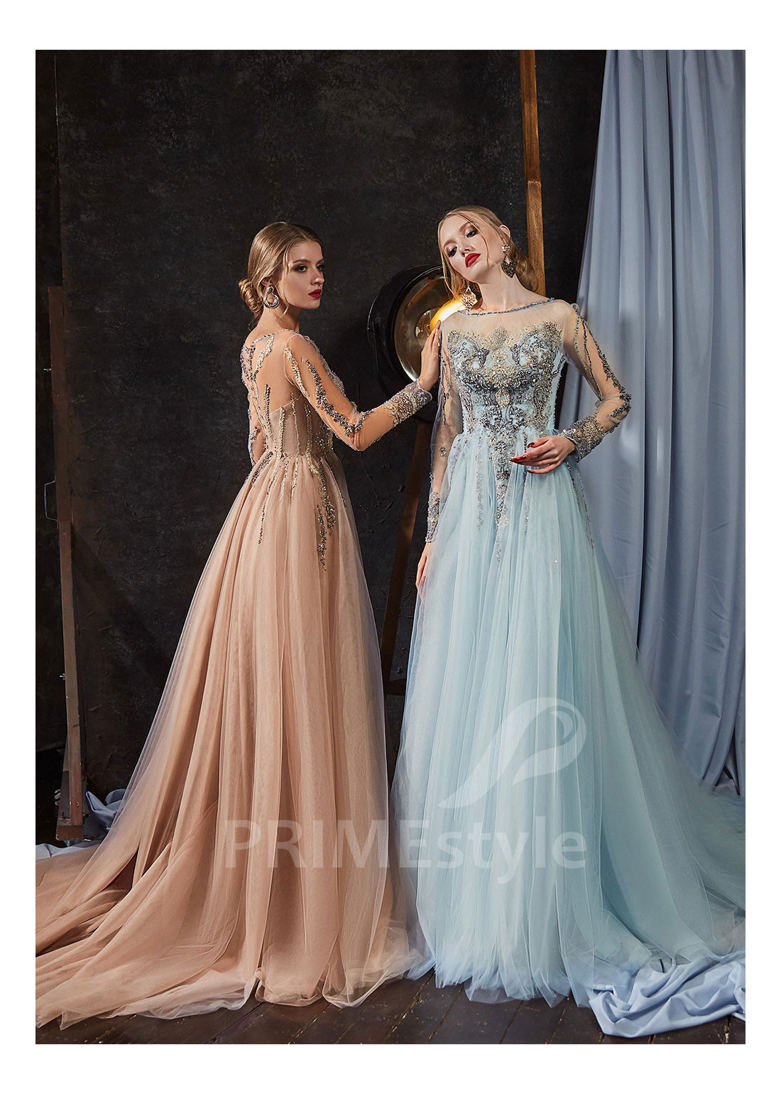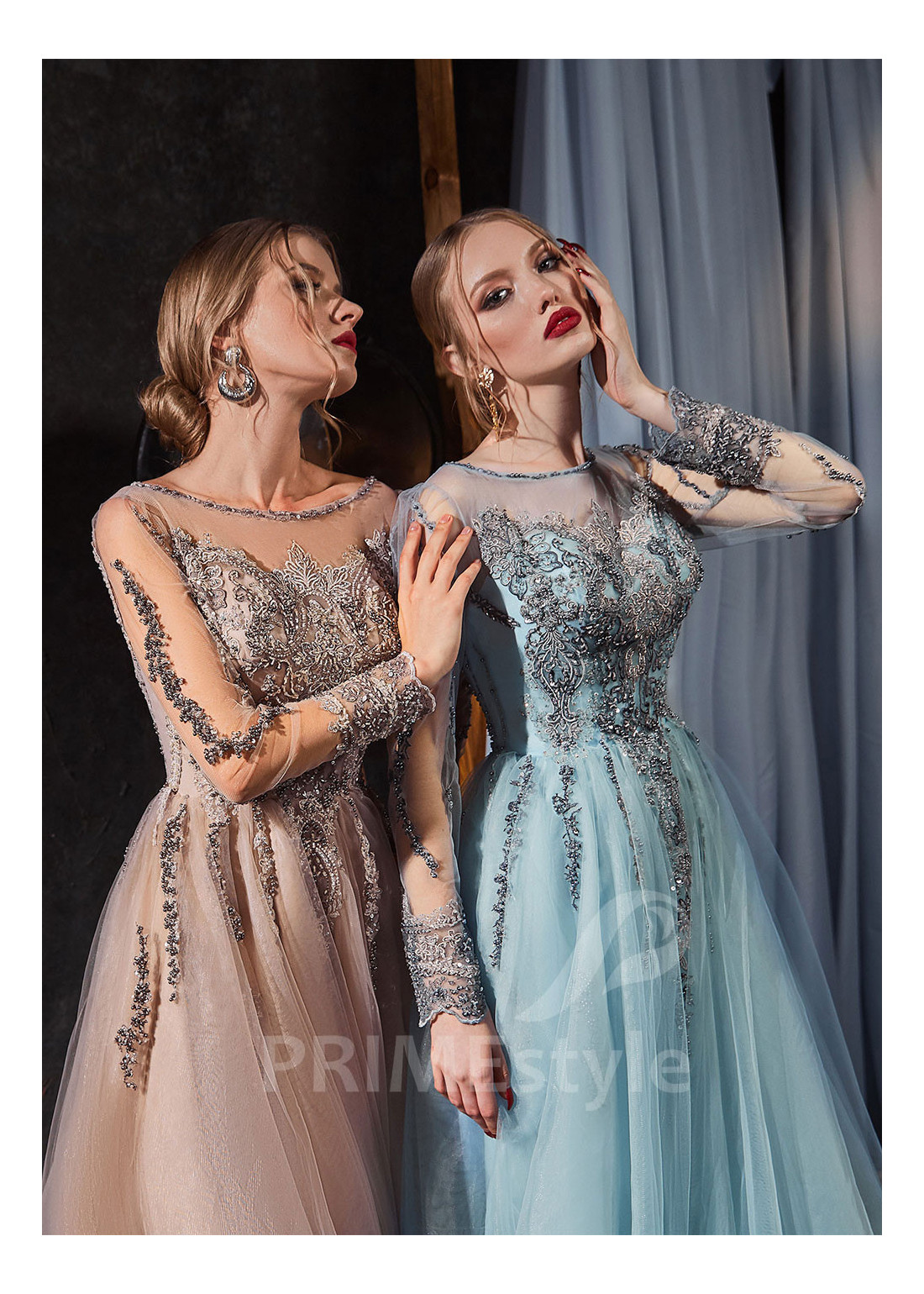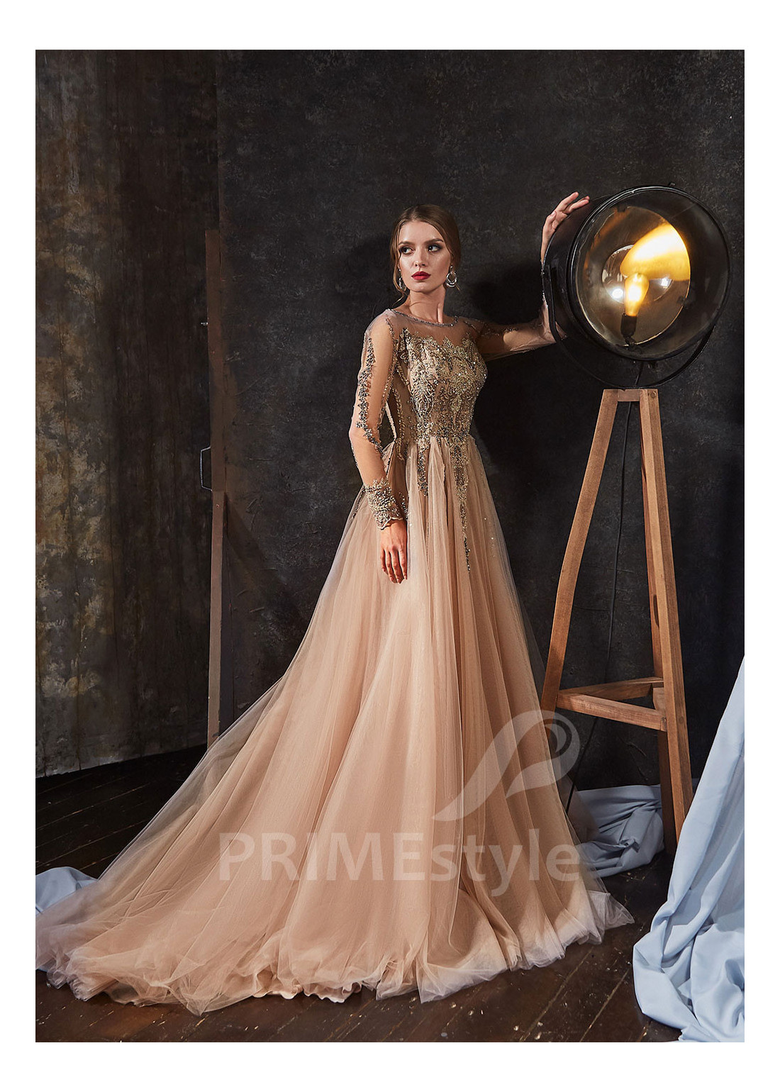 Vkusné tylové spoločenské šaty s dlhými rukávmi, lodičkovým výstrihom na hrudi, prekrytým chrbtom a s ľahkou padavou tylovou sukňou. Korzet, rukávy a horná časť sukne sú zdobené bohatou vyšívanou čipkou. Vhodné aj ako šaty na ples a luxusné šaty na stužkovú.