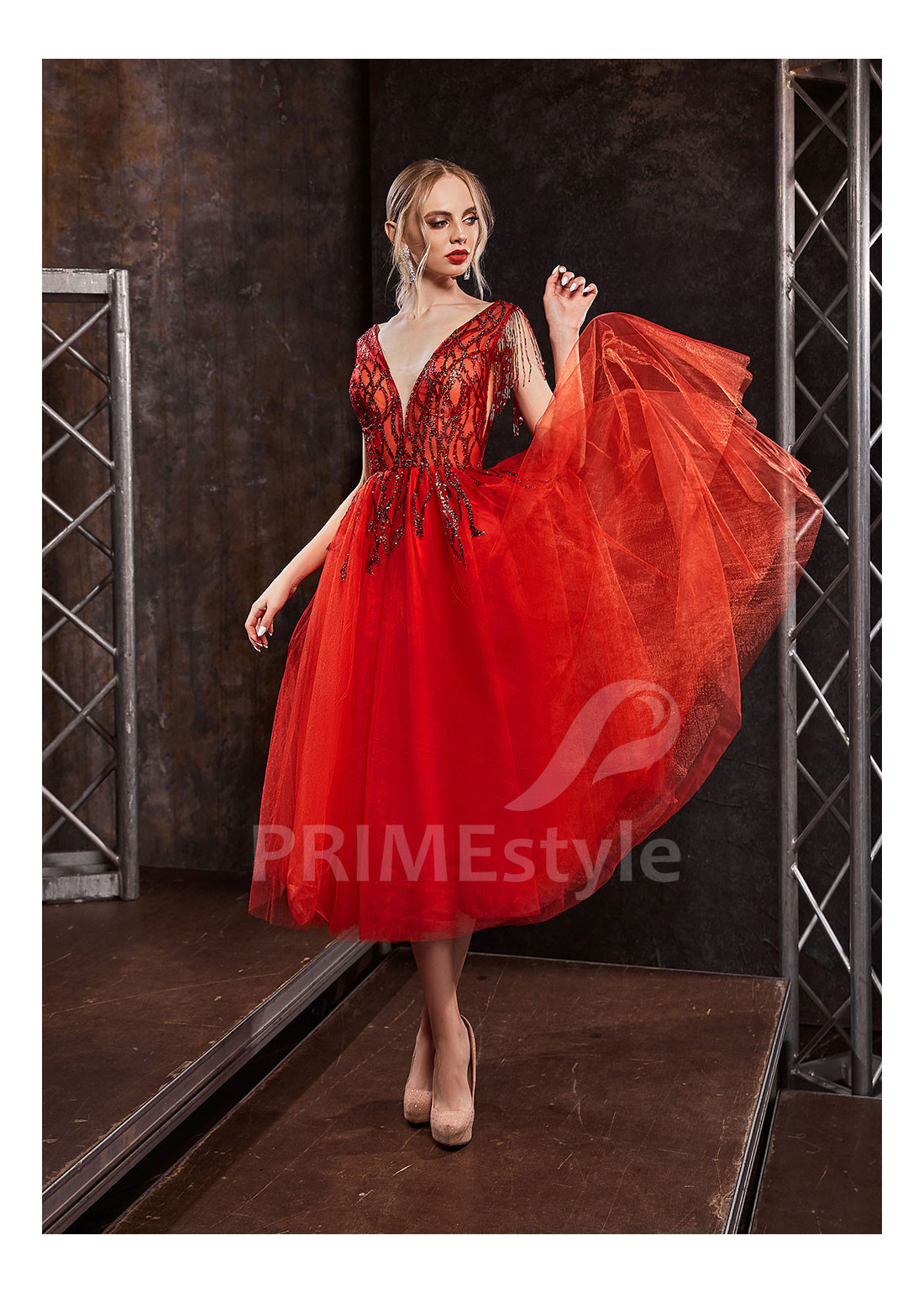 Spoločenské midi šaty s otvoreným dekoltom, hlbokým V-výstrihom na hrudi, odhaleným chrbtom a ľahkou tylovou sukňou. Korzet a horná časť sukne sú zdobené aplikáciami trblietavej čipky. Možnosť ušitia s midi alebo maxi sukňou. Vhodné aj ako šaty na ples, šaty na stužkovú a popolnočné šaty.