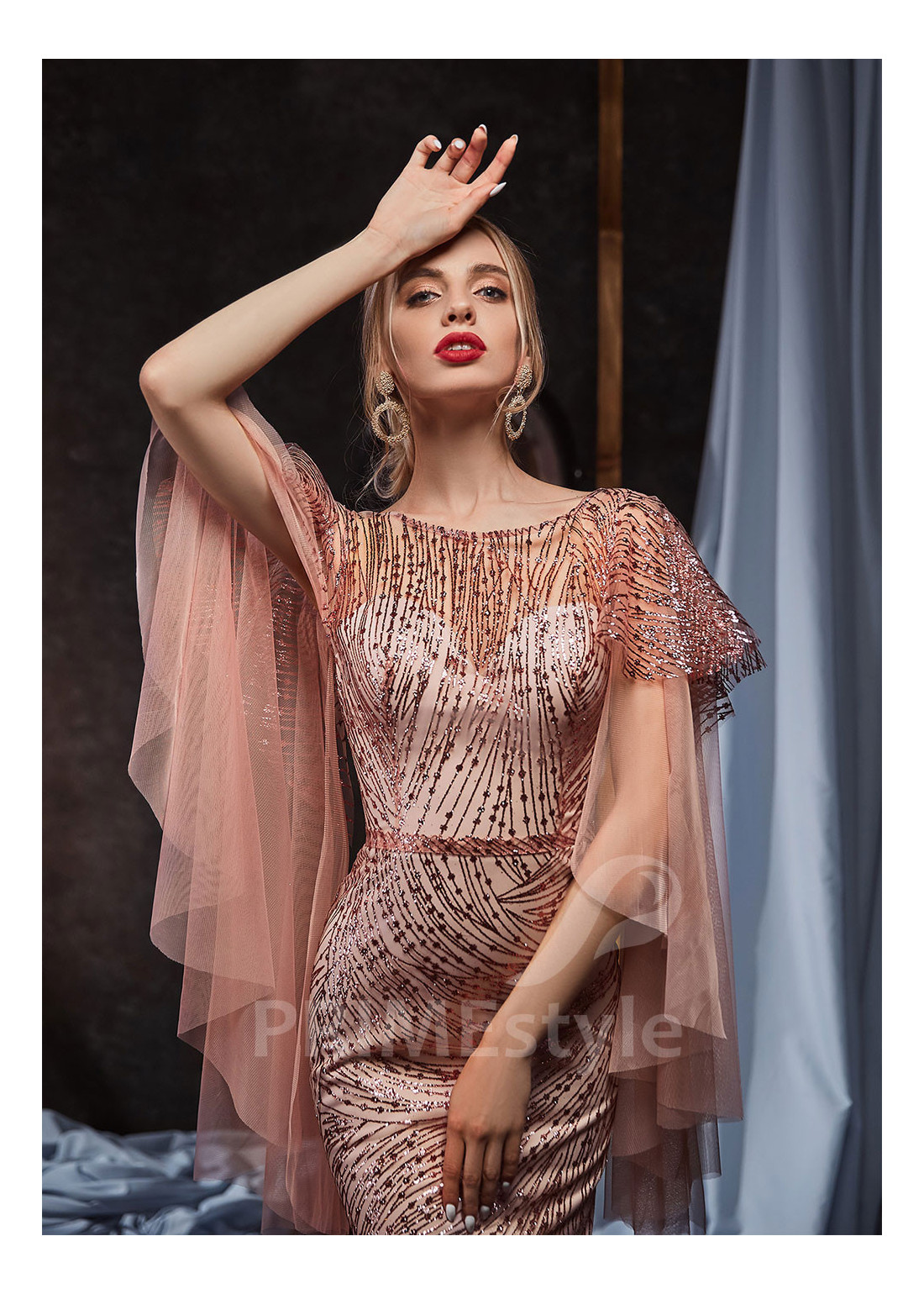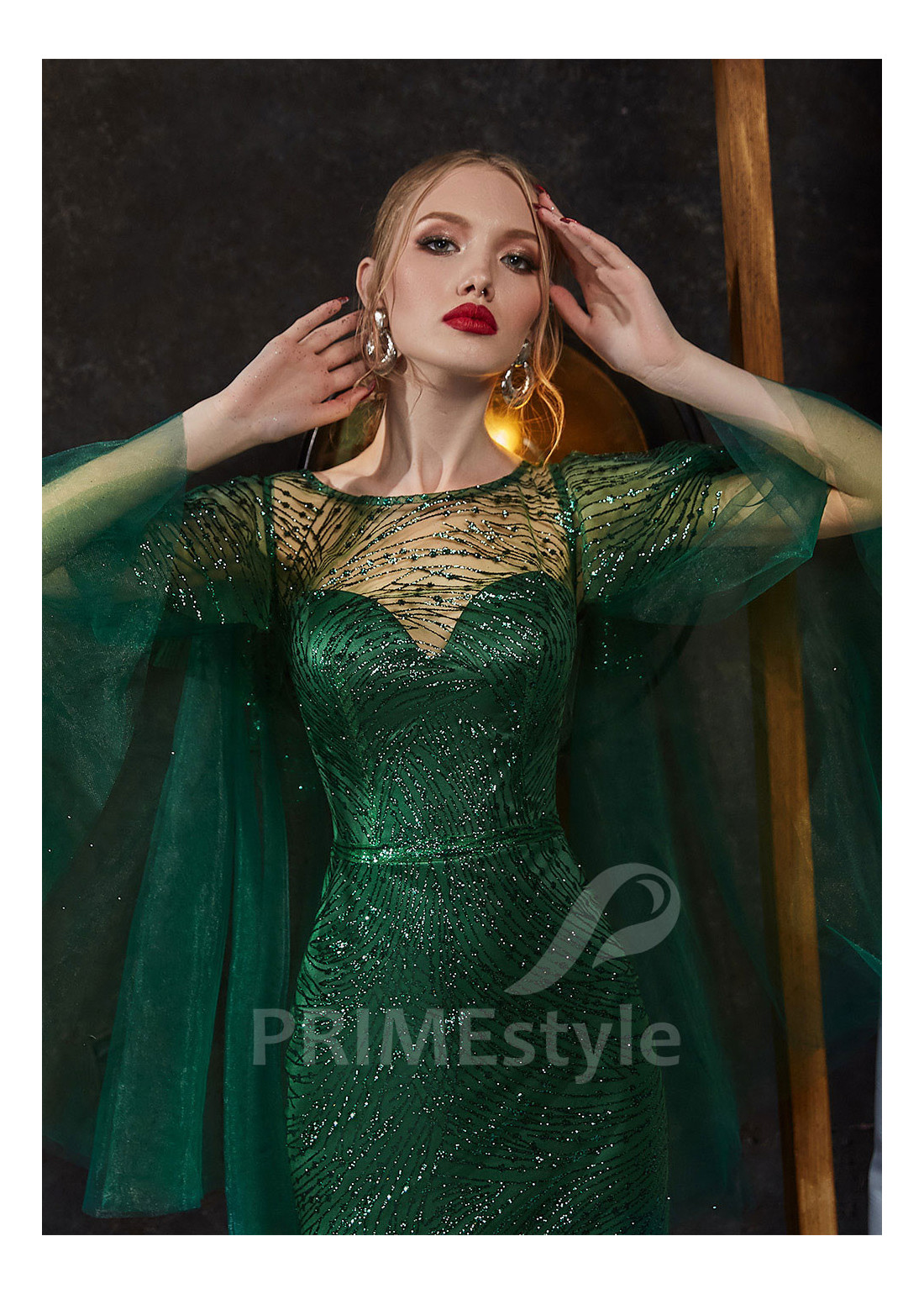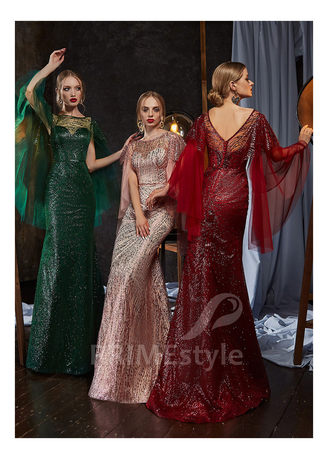 Luxusné úzke celotrblietavé spoločenské šaty s trendovým srdiečkovým výstrihom na hrudi, odhaleným chrbtom a dlhými voľnými rukávmi v tvare vlečky. Vhodné aj ako šaty na stužkovú.