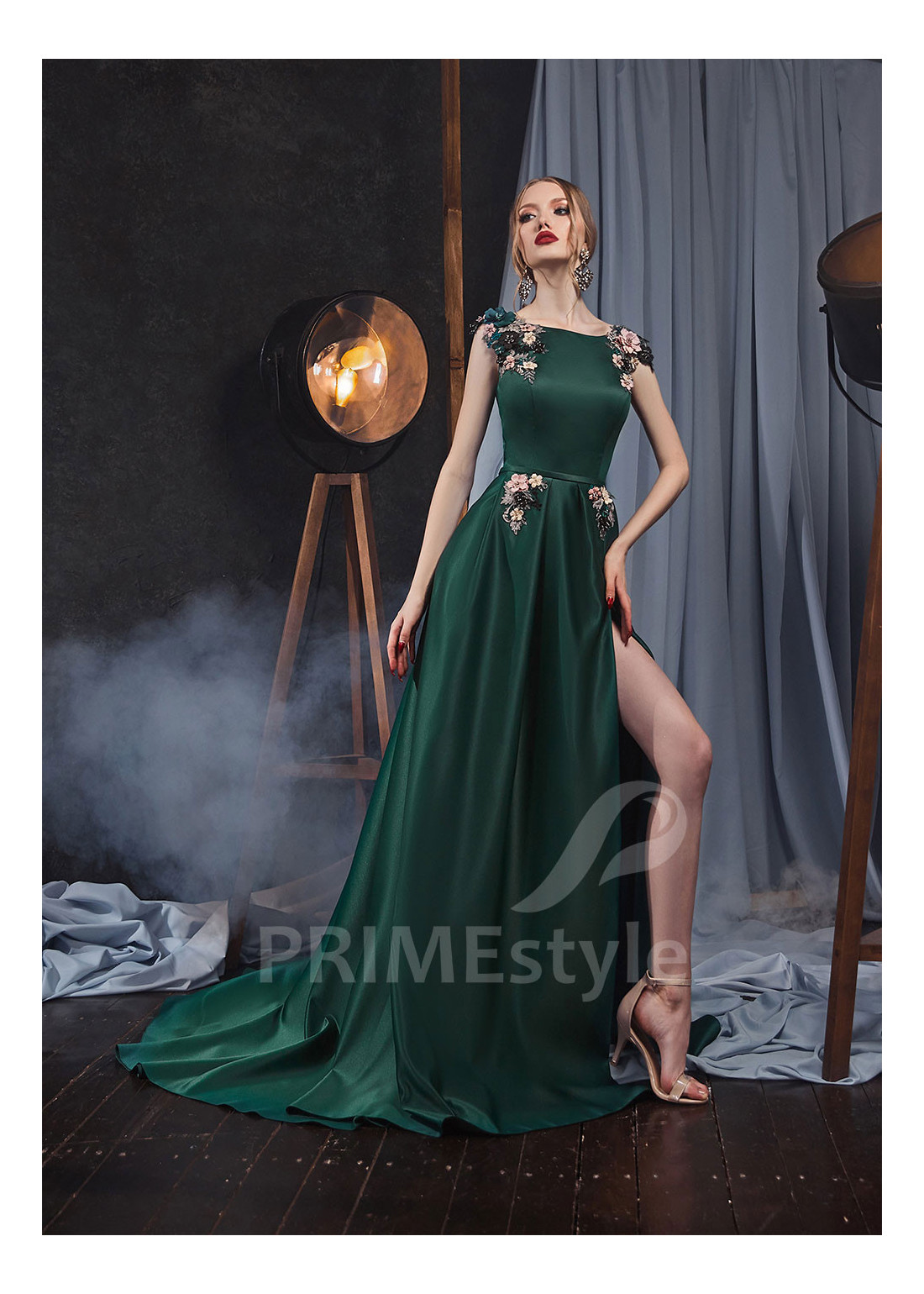 Roztomilé saténové spoločenské šaty s lodičkovým výstrihom na hrudi, mierne otvoreným chrbtom a padavou pekne tvarovanou sukňou. Horné časti korzetu a sukne sú dekorovane rozrošnými farebnými aplikáciami s 3D kvetmi.