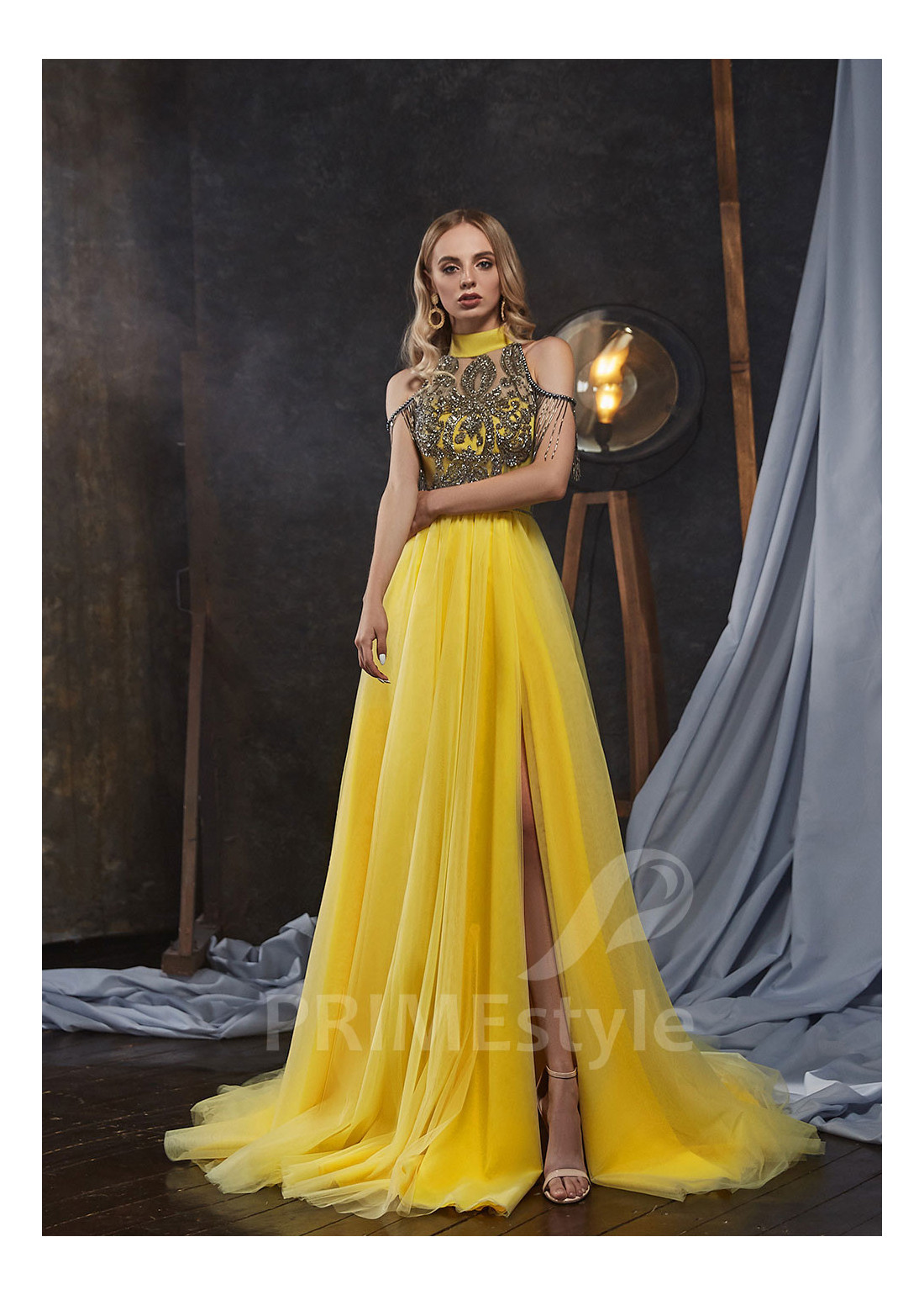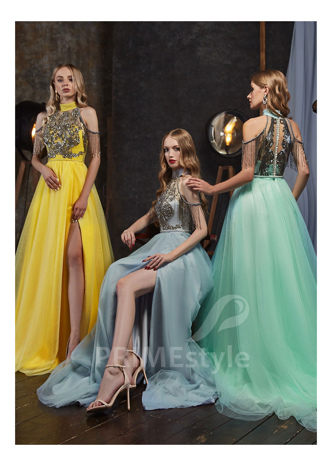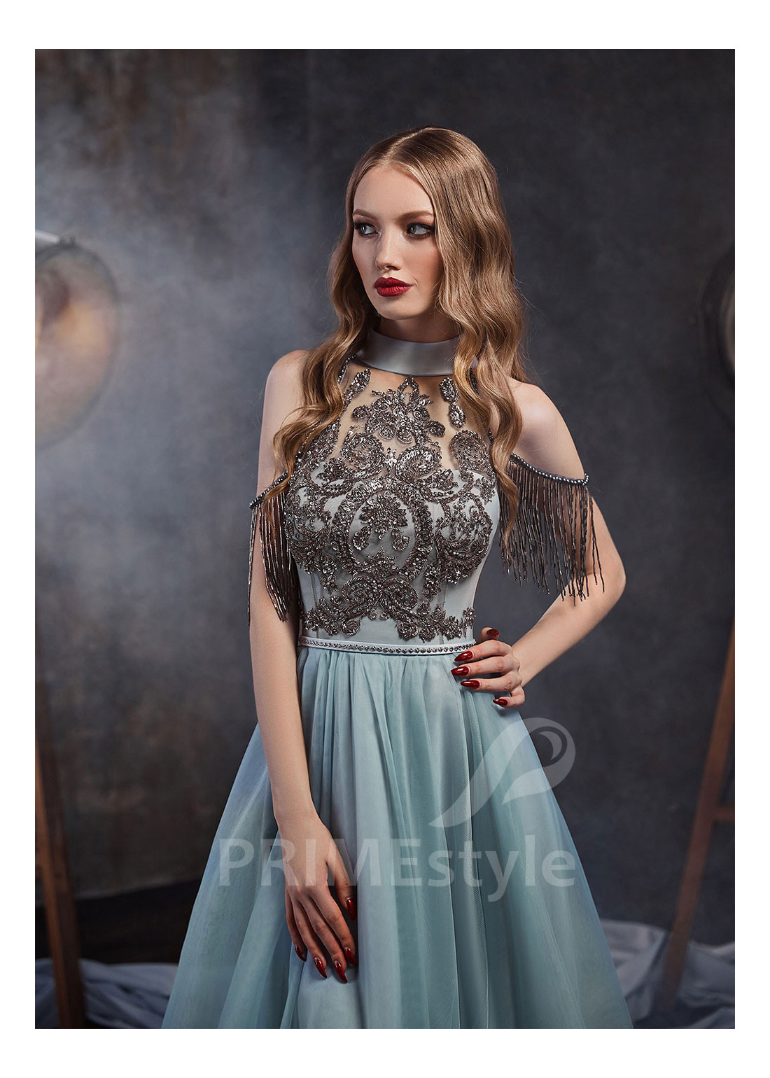 Originálne spoločenské šaty s bohato zdobeným korzetom, padnutými zaujímavo tvarovanými ramienkami, prekrytým chrbtom a ľahkou tylovou sukňou s rázporokom. Vhodné aj ako šaty na stužkovú a popolnočné šaty.