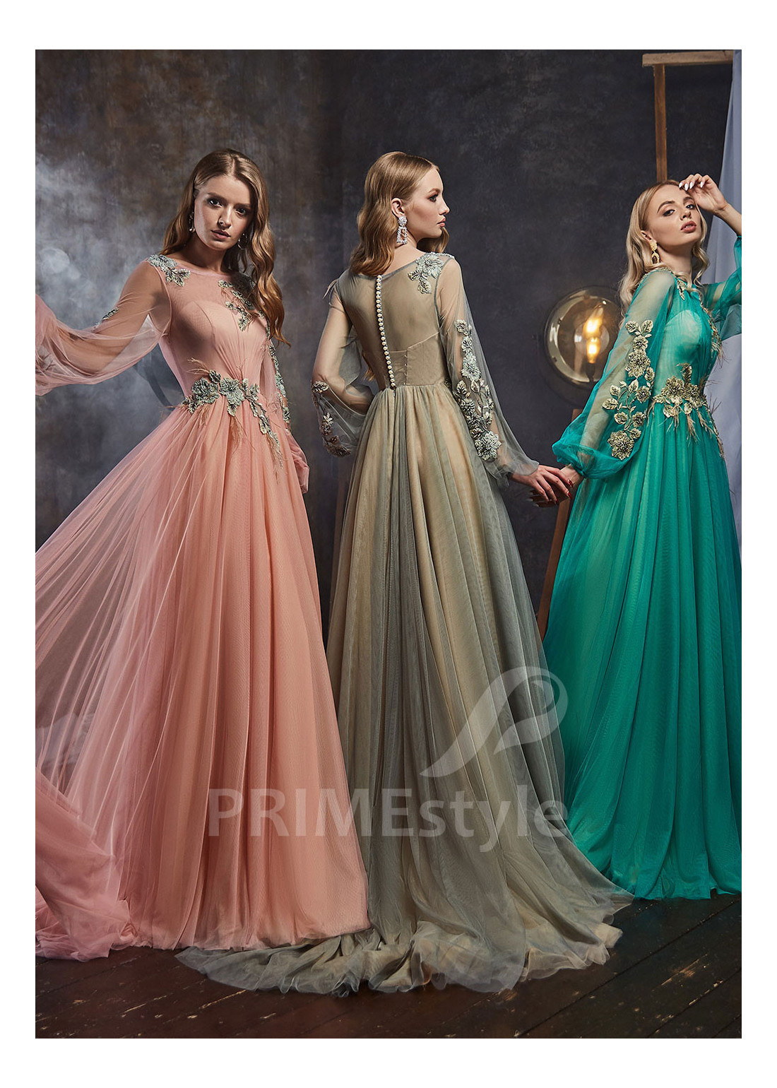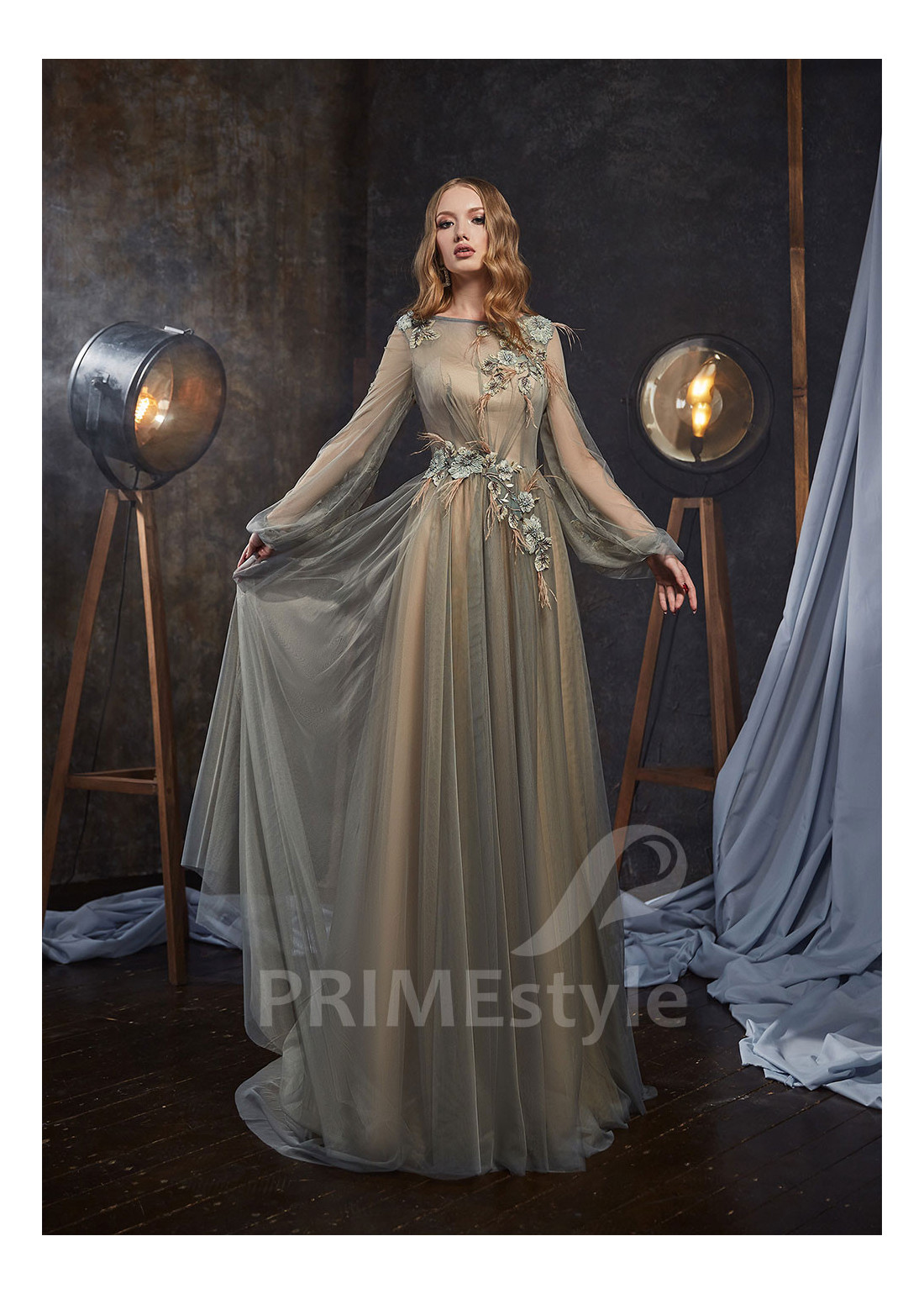 Roztomilé romantické spoločenské šaty s dlhým balónovým rukávom, lodičkovým výstrihom na hrudi, prekrytým chrbtom a padavou tylovou sukňou. Korzet, rukávy a horná časť sukne sú dekorované rozkošnou vyšívanou čipkou. Vhodné aj ako šaty na ples, šaty na stužkovú, šaty na svadbu a popolnočné šaty.