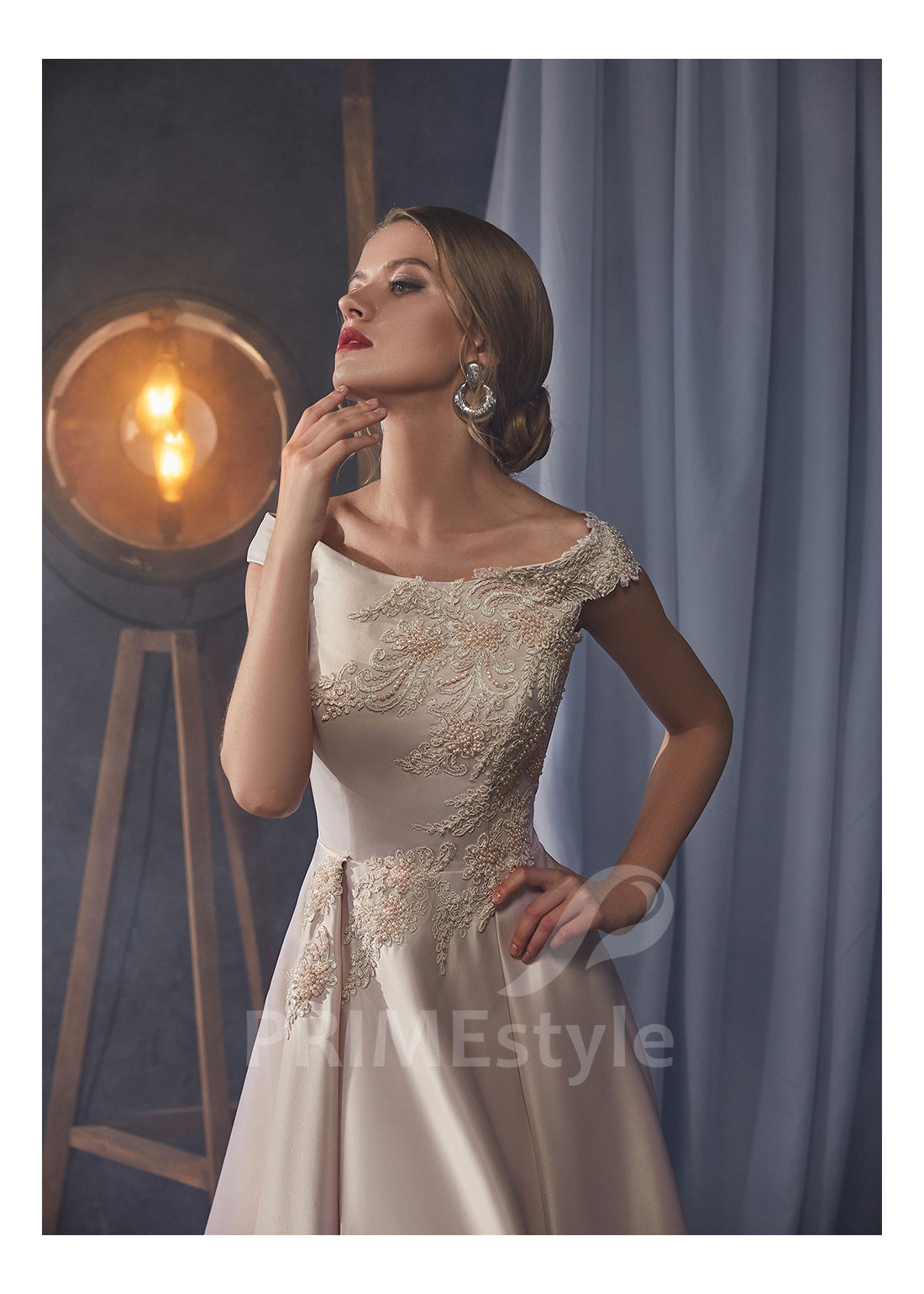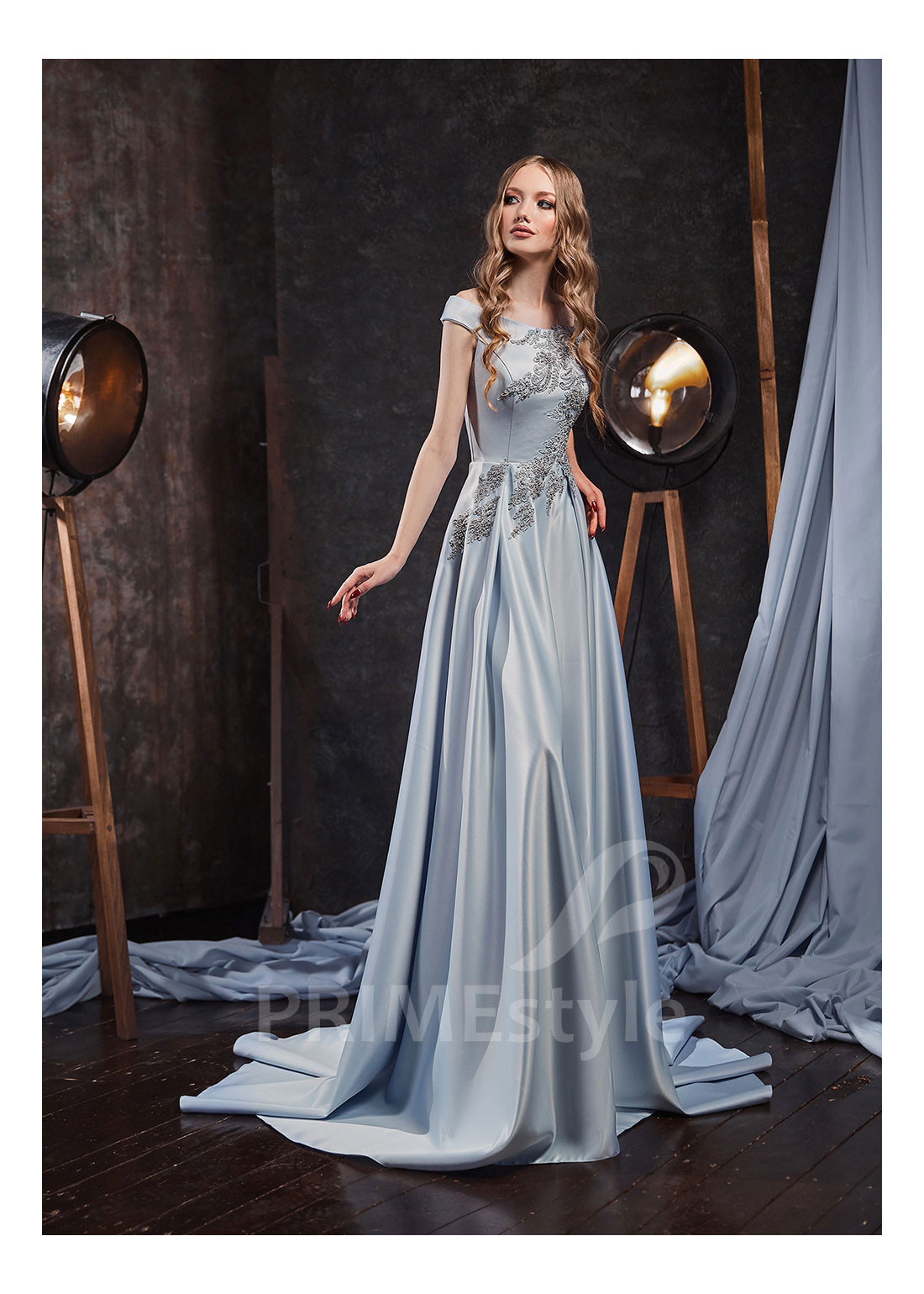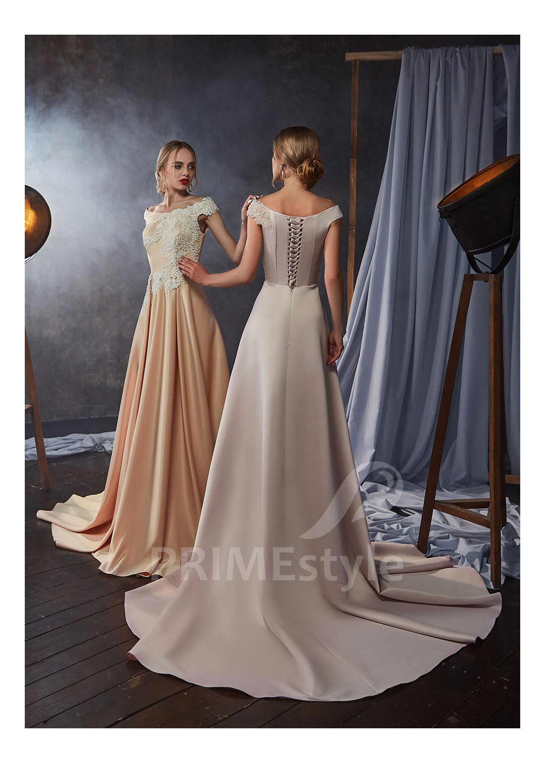 Elegantné saténové spoločenské šaty s padnutými ramienkami, lodičkovým výstrihom na hrudi, mierne odhaleným chrbtom a pekne tvarovanou A-čkovou sukňou. Vhodné aj ako šaty na ples, šaty na stužkovú, šaty na svadbu a popolnočné šaty.