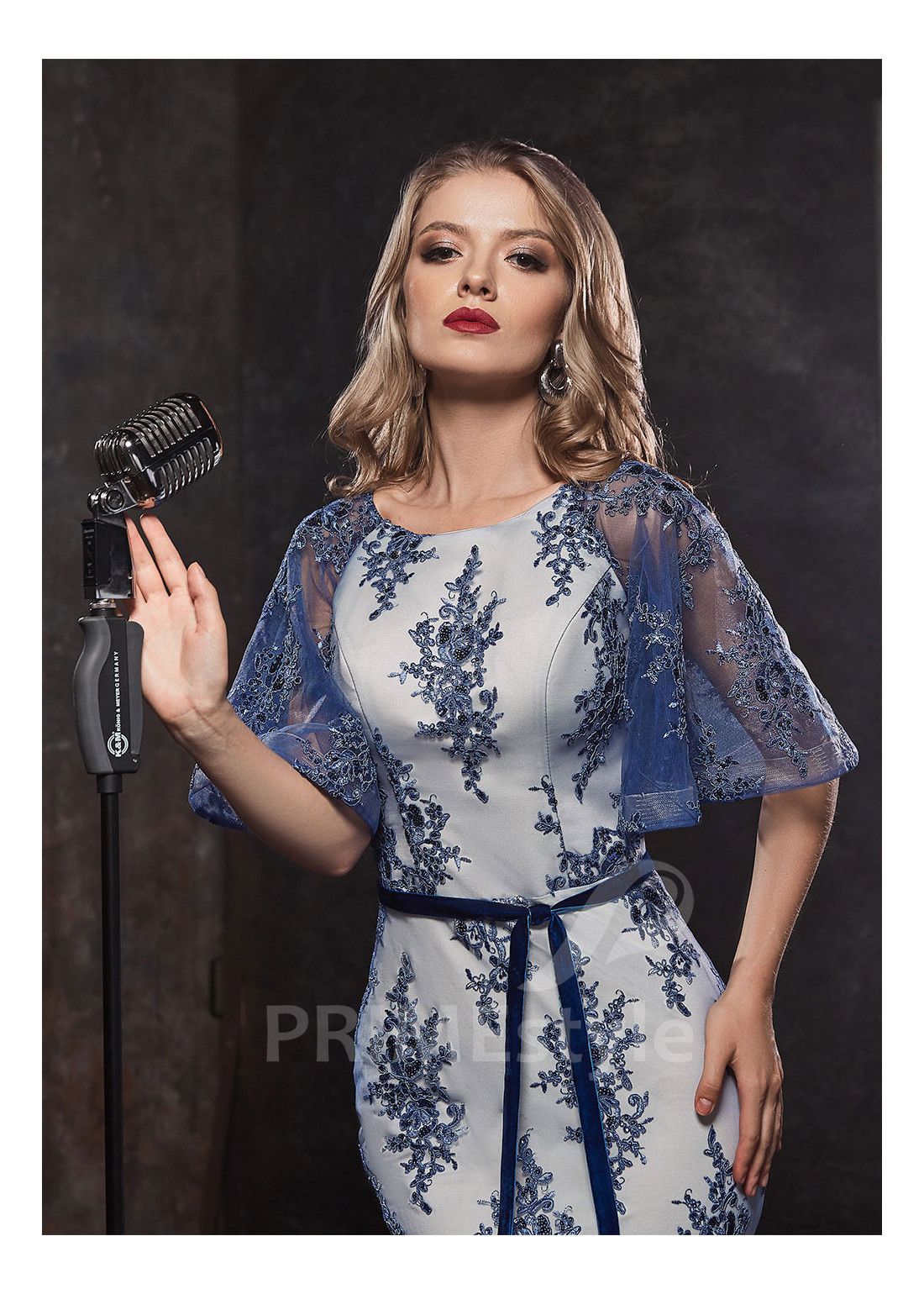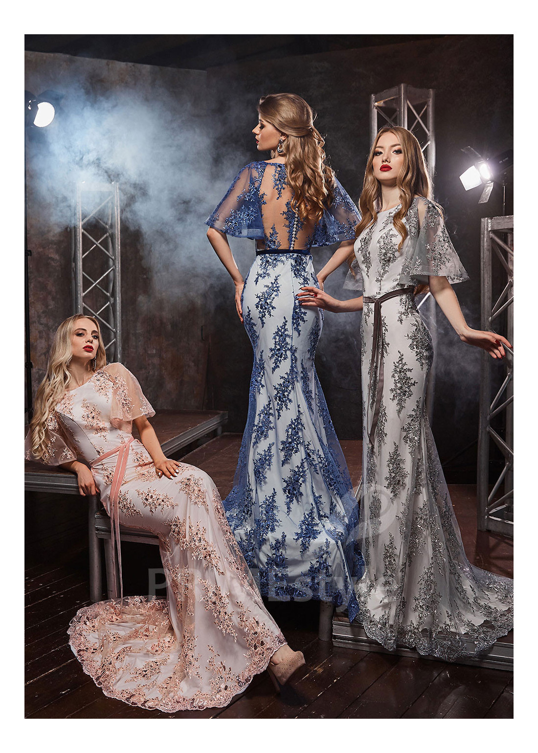 Luxusné celočipkované spoločenské šaty strihu "morská panna" s voľnými otvorenými rukávmi, lodičkovým výstrihom na hrudi a prekrytým chrbtom. Vhodné aj ako šaty na stužkovú, šaty na svadbu a popolnočné šaty.