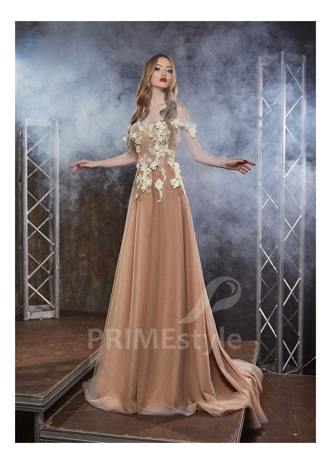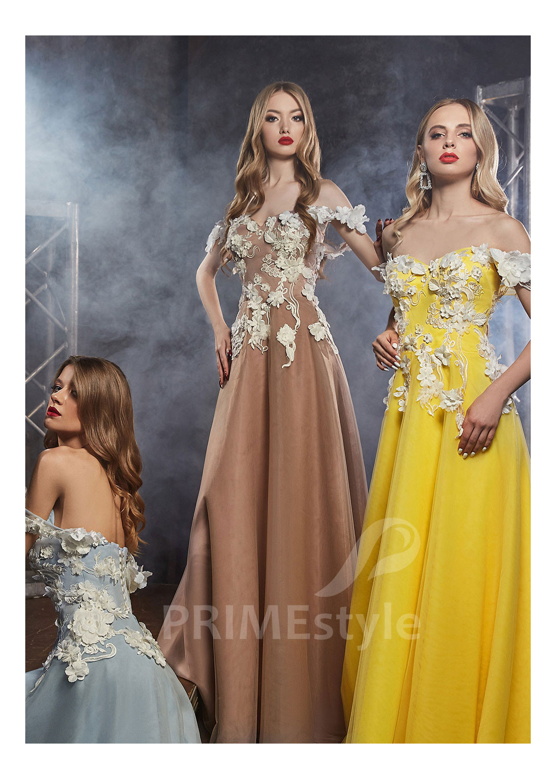 Roztomilé romantické spoločenské šaty s padnutými ramienkami, trendovým srdiečkovým výstrihom na hrudi, odhaleným chrbtom a pekne tvarovanou A-čkovou sukňou. Korzet a horná časť sukne sú dekorované rozkošnými aplikáciami s 3D kvetmi. Vhodné aj ako šaty na ples, šaty na stužkovú a popolnočné šaty.