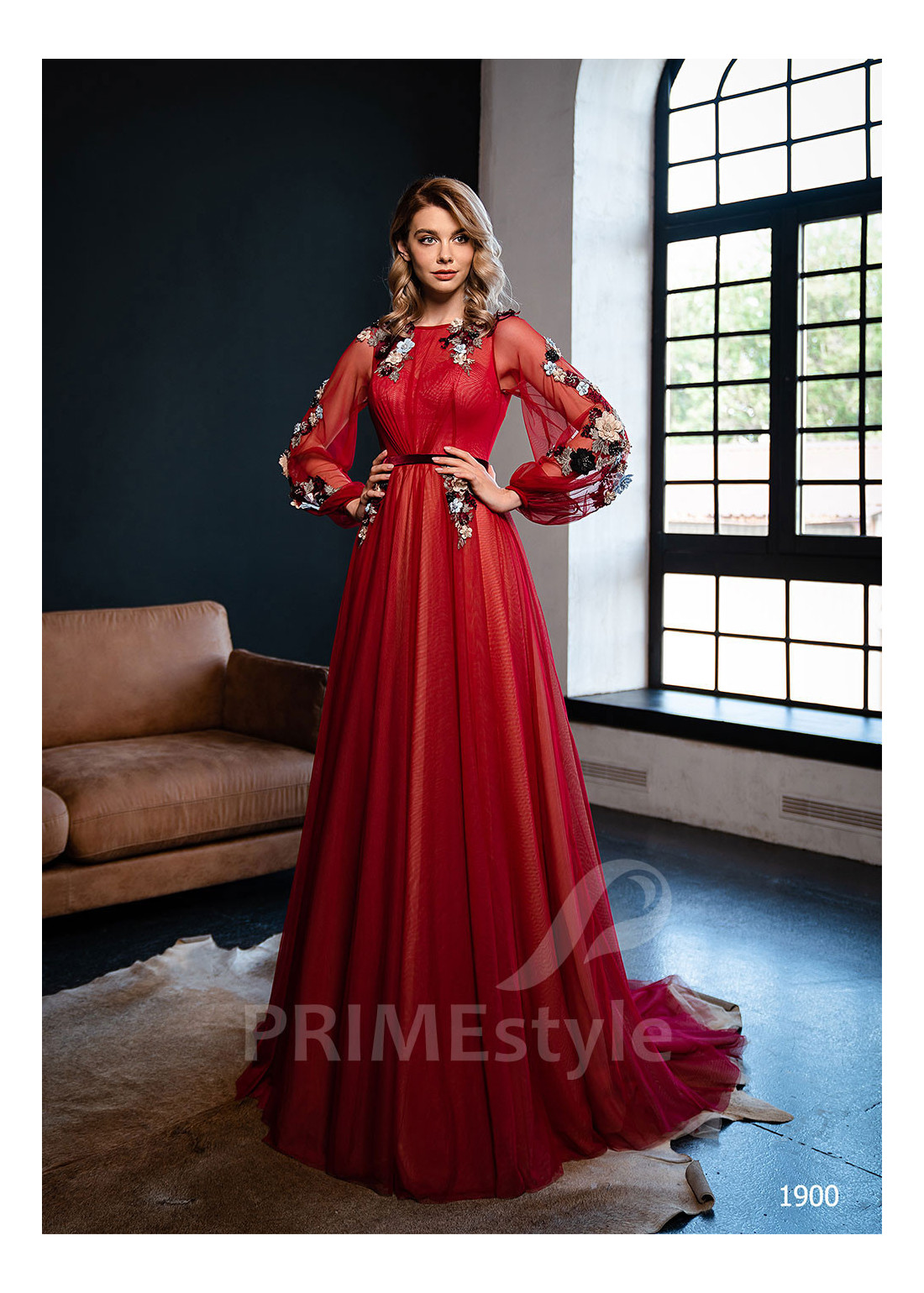 Roztomilé spoločenské šaty s dlhým balónovým rukávom, prekrytým dekoltom s lodičkovým výstrihom na hrudi, zahaleným chrbtom a s ľahkou tylovou sukňou. Horná časť korzetu a rukávy sú dekorované nádhernými aplikáciami čipky s farebnými 3D kvetmi. Vhodné aj ako šaty na ples, šaty na stužkovú, šaty na svadbu a popolnočné šaty.