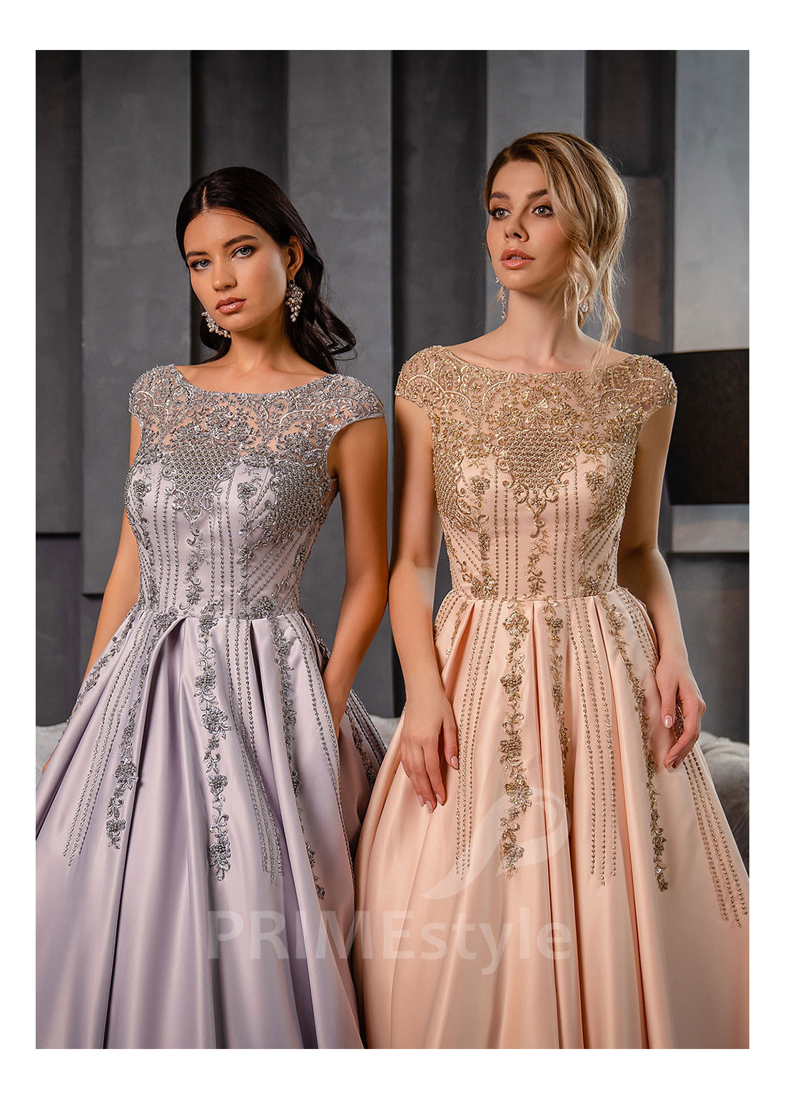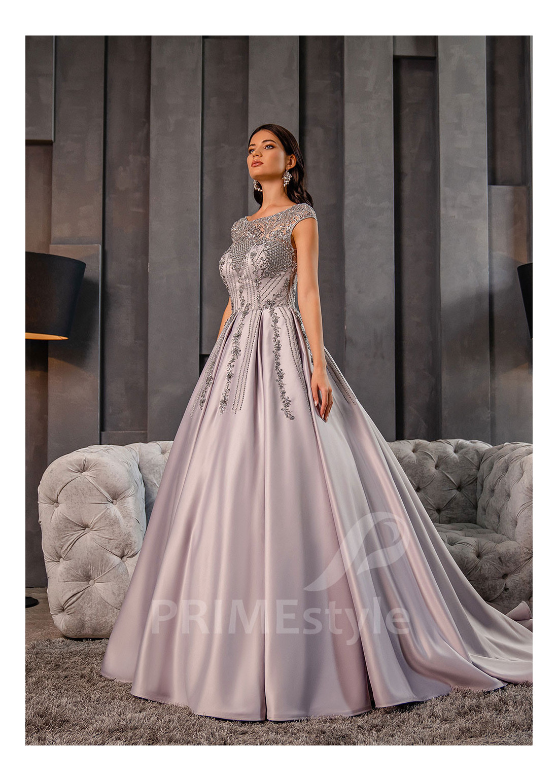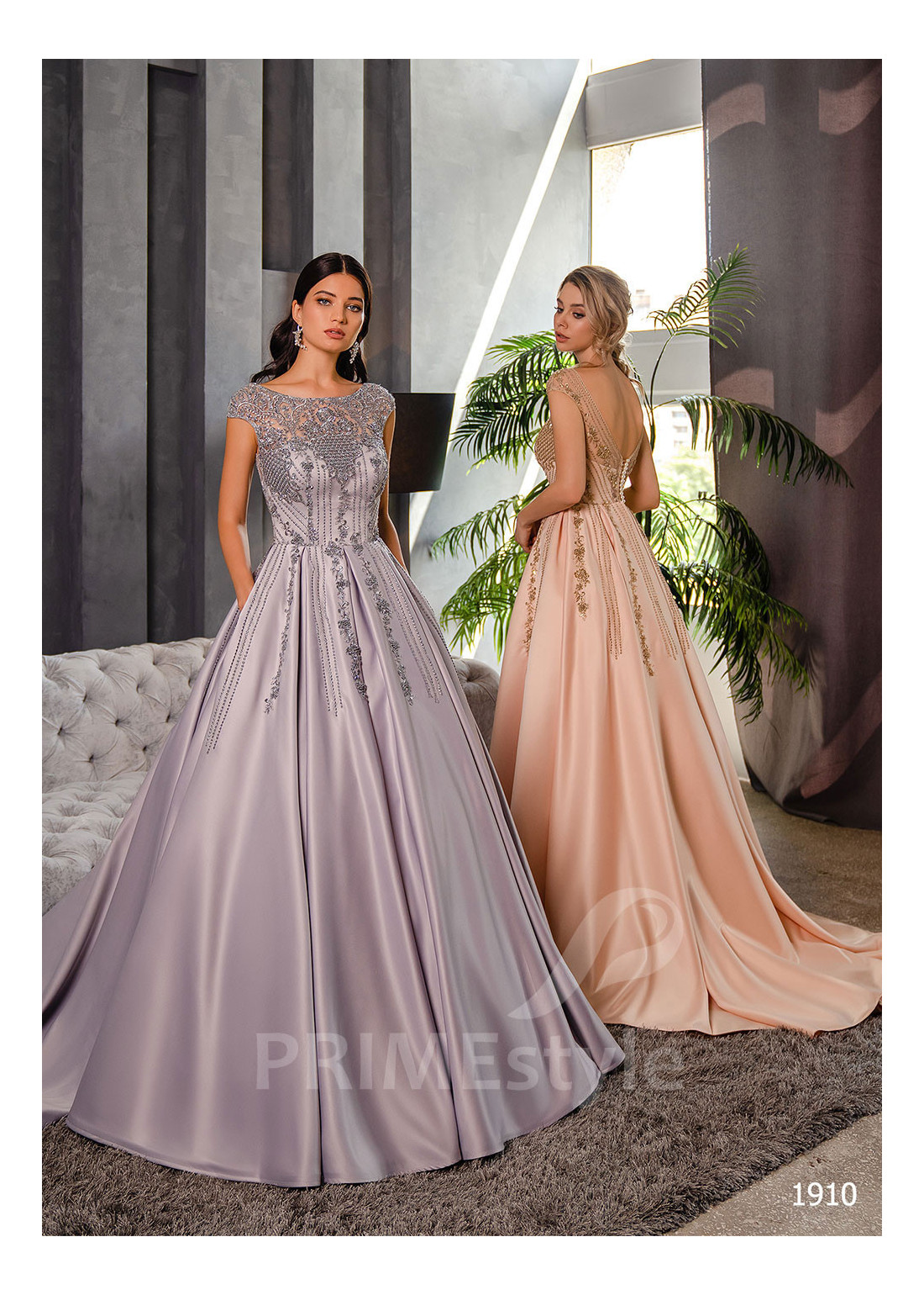 Luxusné spoločenské šaty s bohato zdobeným korzetom, lodičkovým výstrihom an hrudi, odhaleným chrbtom a objemnou padavou saténovou sukňou. Korzet a horná časť sukne sú zdobené bohatou vyšívanou čipkou. Vhodné aj ako šaty na stužkovú, popolnočné šaty, šaty na svadbu a šaty pre svadobné mamy.