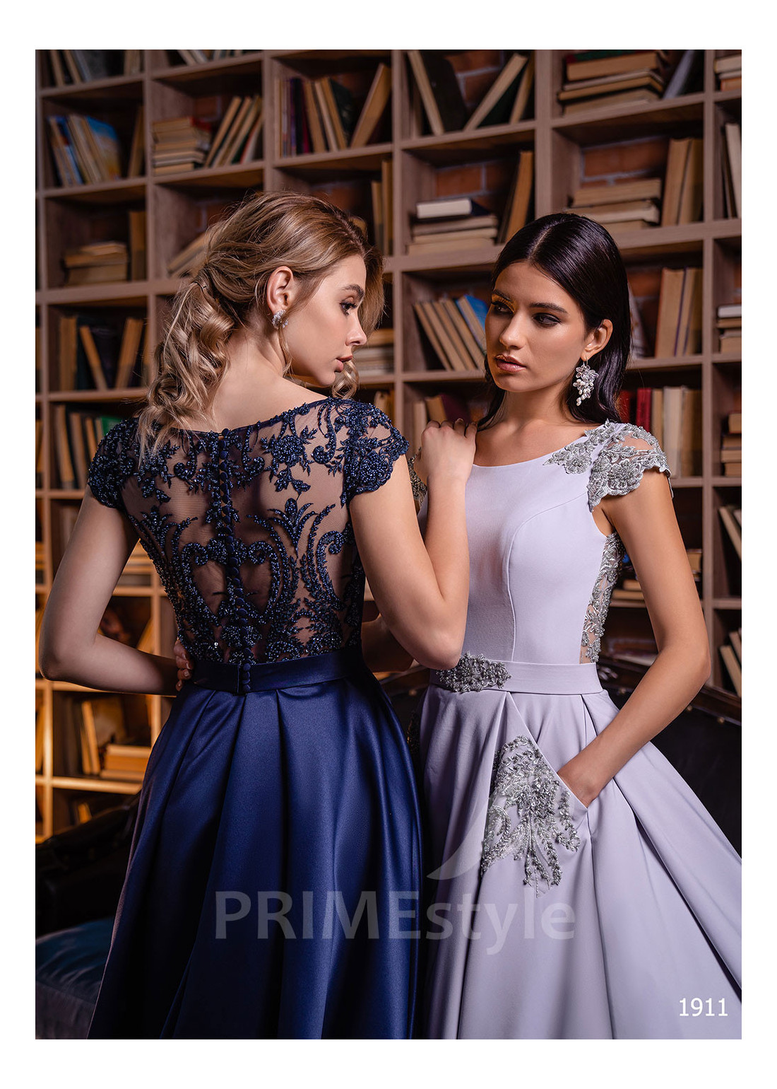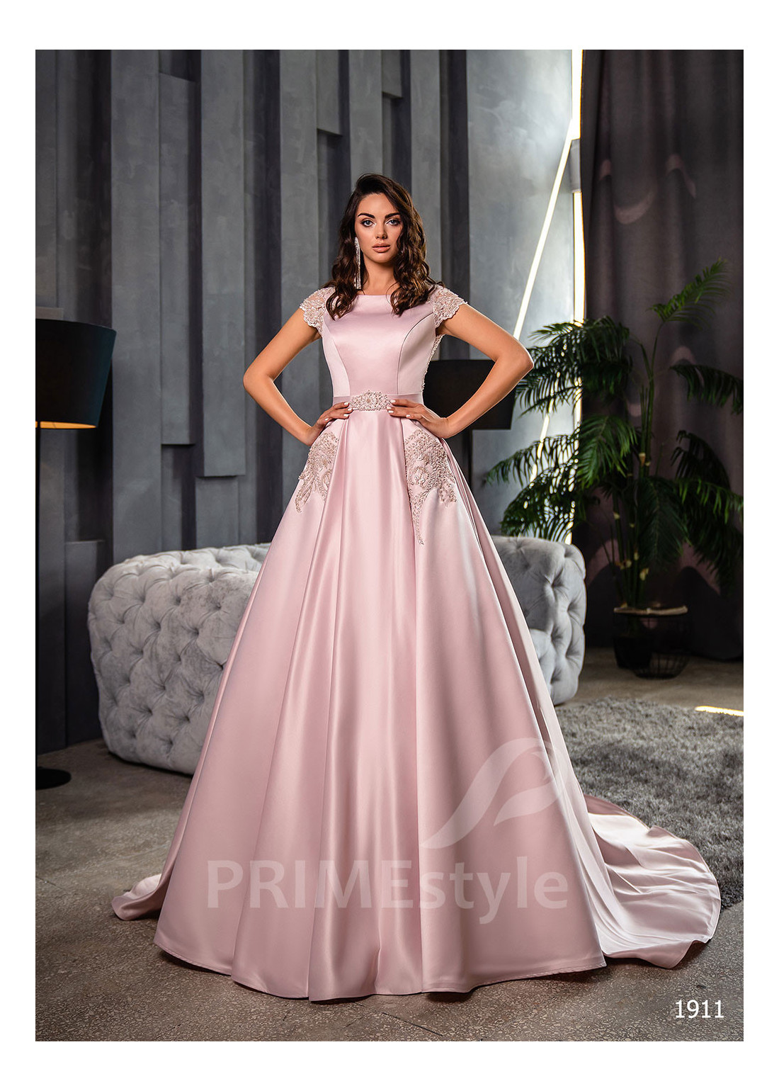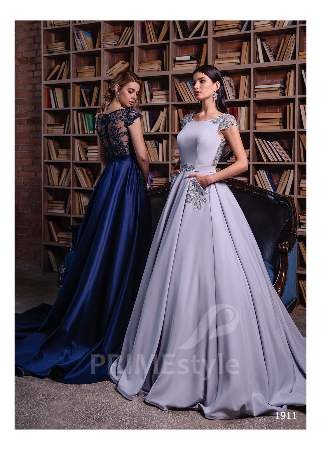 Vkusné saténové spoločenské šaty s krátkym rukávom, zakrytým dekoltom, prekrytým chrbtom a objemnou pekne tvarovanou sukňou. Rukávy a chrbát sú zdobené rozkošnou vyšívanou čipkou. Vhodné aj ako šaty na ples, šaty na stužkovú, popolnočné šaty a šaty na svadbu.