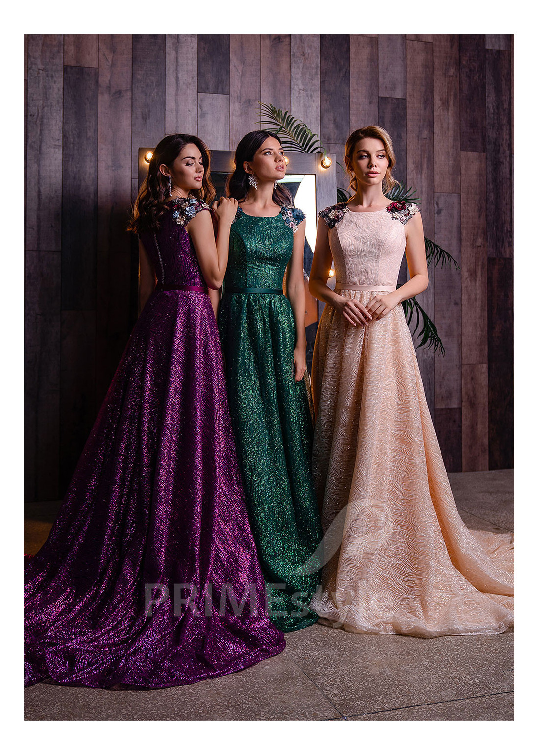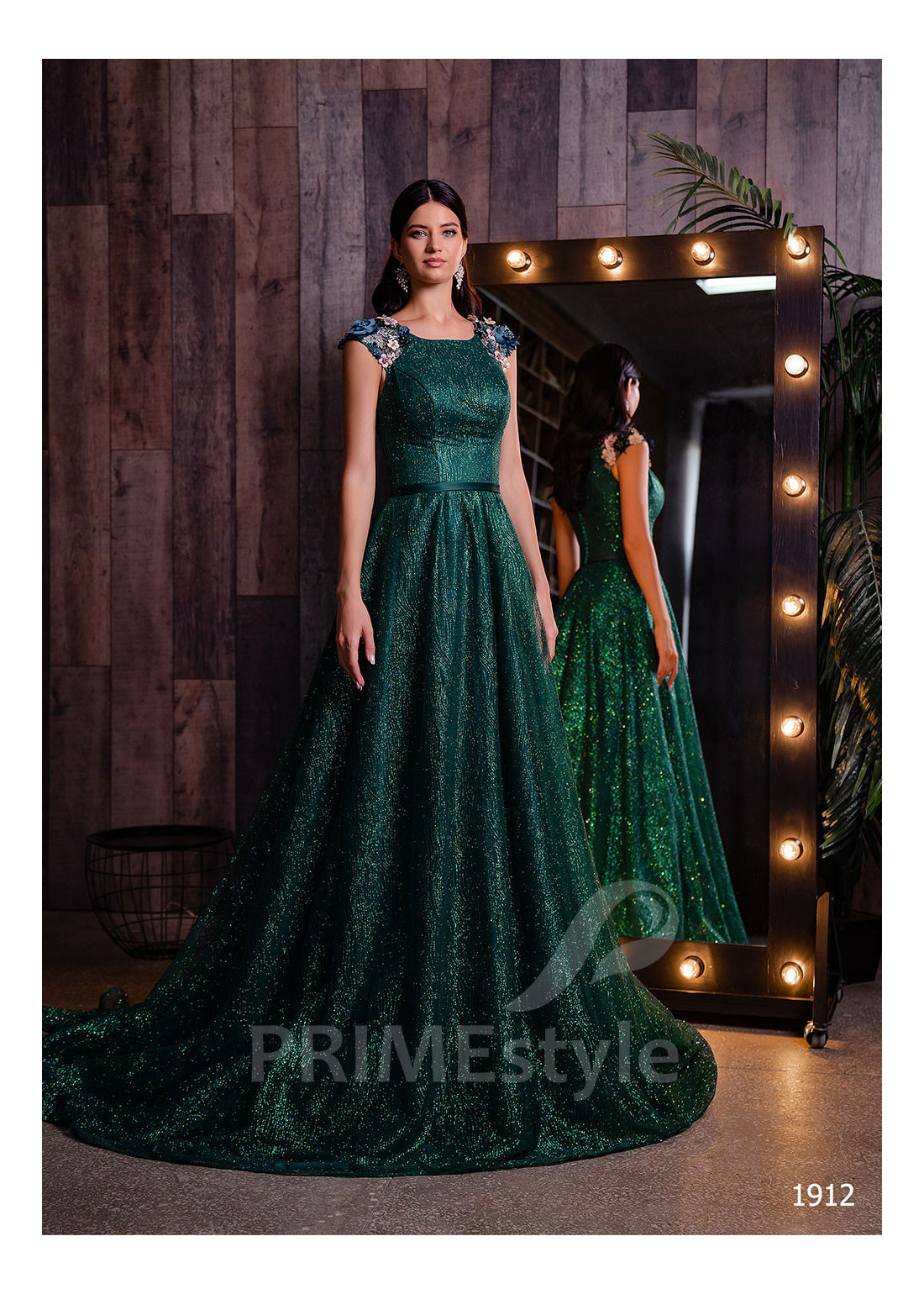 Luxusné celotrblietavé spoločenské šaty so zakrytým dekoltom, lodičkovým výstrihom na hrudi, zahaleným chrbtom a objemnou padavou sukňou. Ramená sú zdobené nádhernými aplikáciami čipky s 3D kvetmi. Vhodné aj ako šaty na stužkovú a popolnočné šaty.