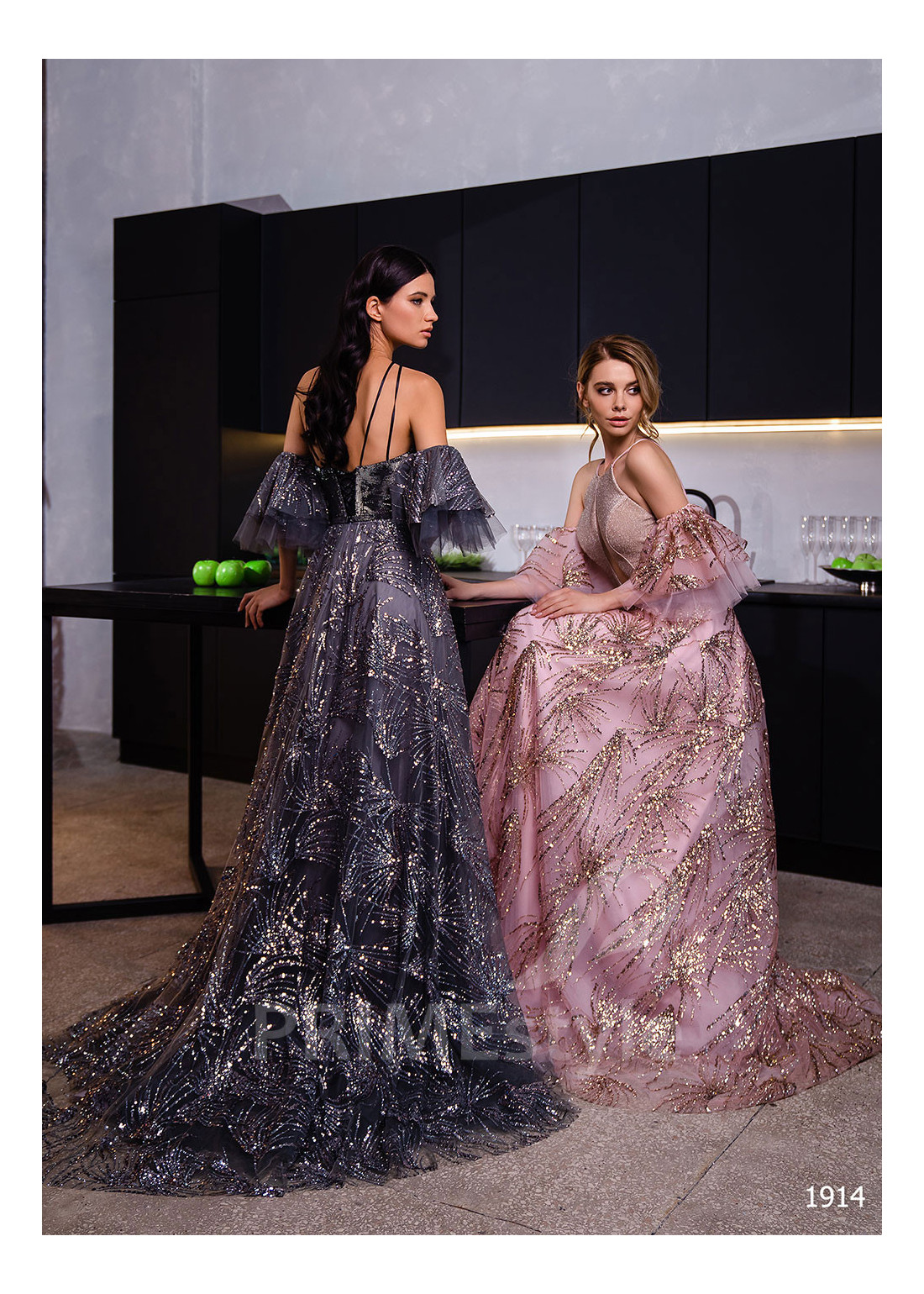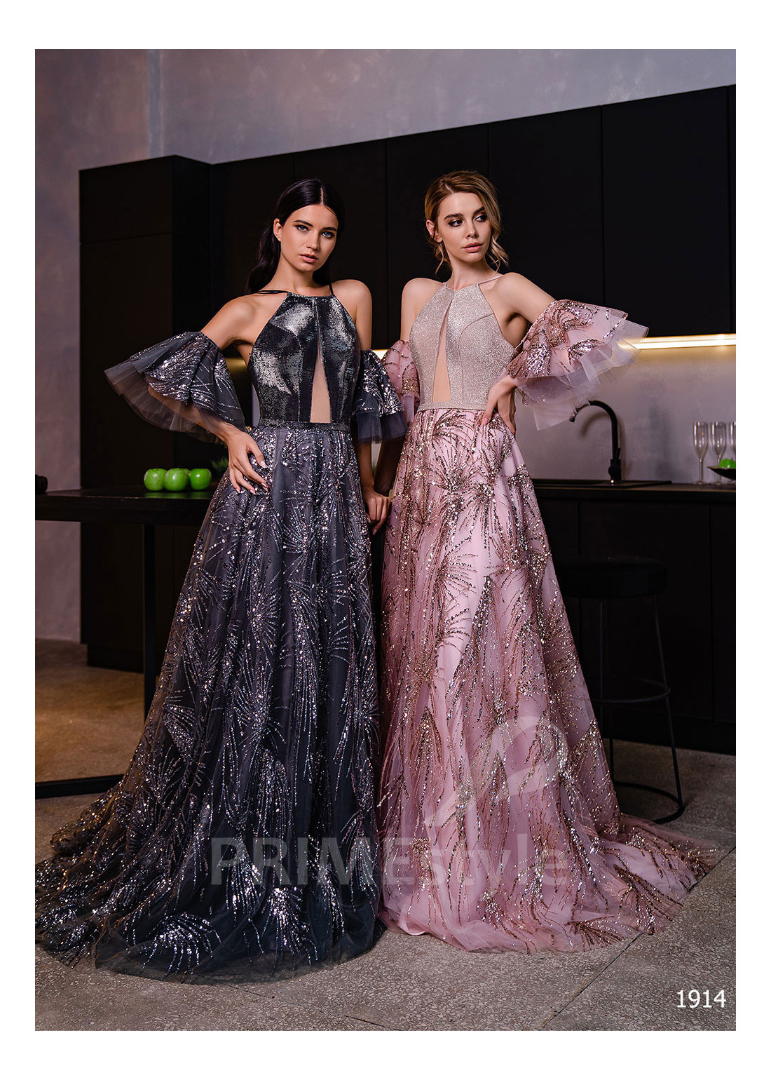 Celotrblietavé spoločenské šaty so samostatným rukávom, prekrytým dekoltom až po krk, odhaleným chrbtom a roškošnou objemnou trblietavou sukňou. Vhodné aj ako luxusné šaty na stužkovú.