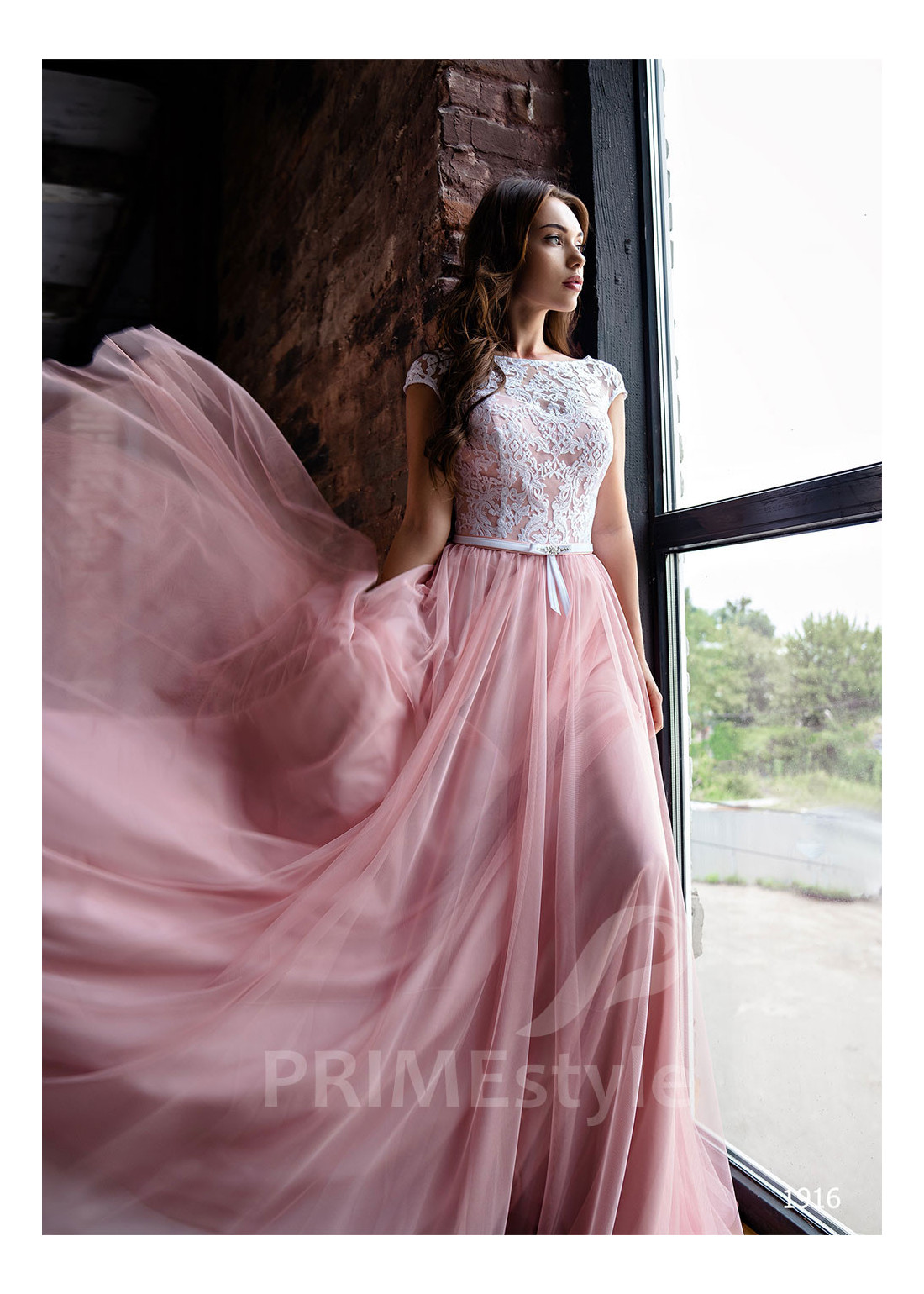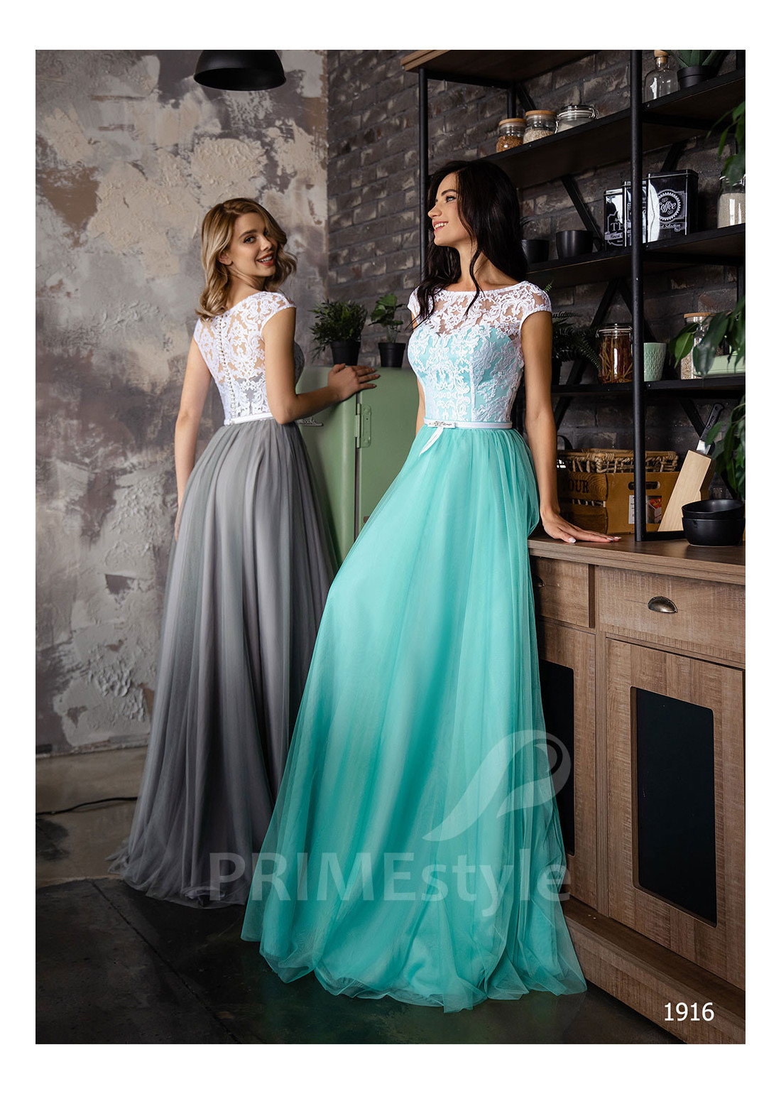Vkusné jednoduché spoločenské šaty s lodičkovým výstrihom na hrudi, zahaleným chrbtom a ľahkou padavou tylovou sukňou. Korzet je zdobený peknou kontrastnou čipkou. Vhodné aj ako šaty na stužkovú, popolnočné šaty, šaty na svadbu, šaty pre družičky a šaty pre svadobné mamy.