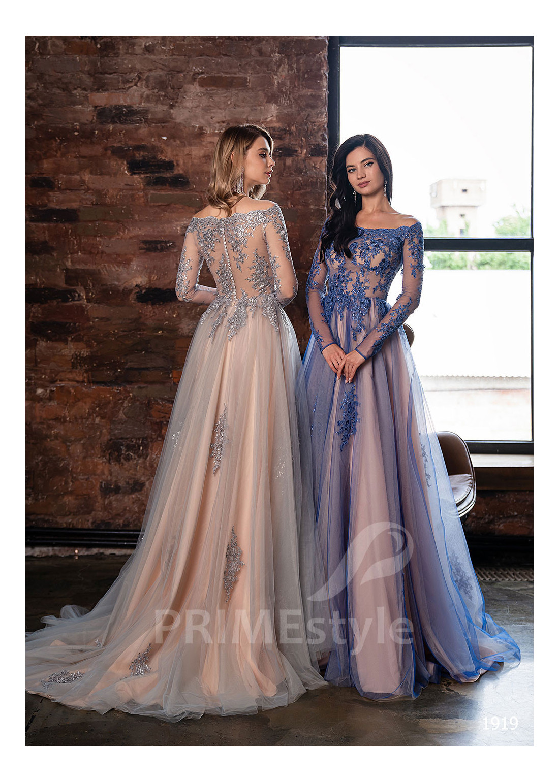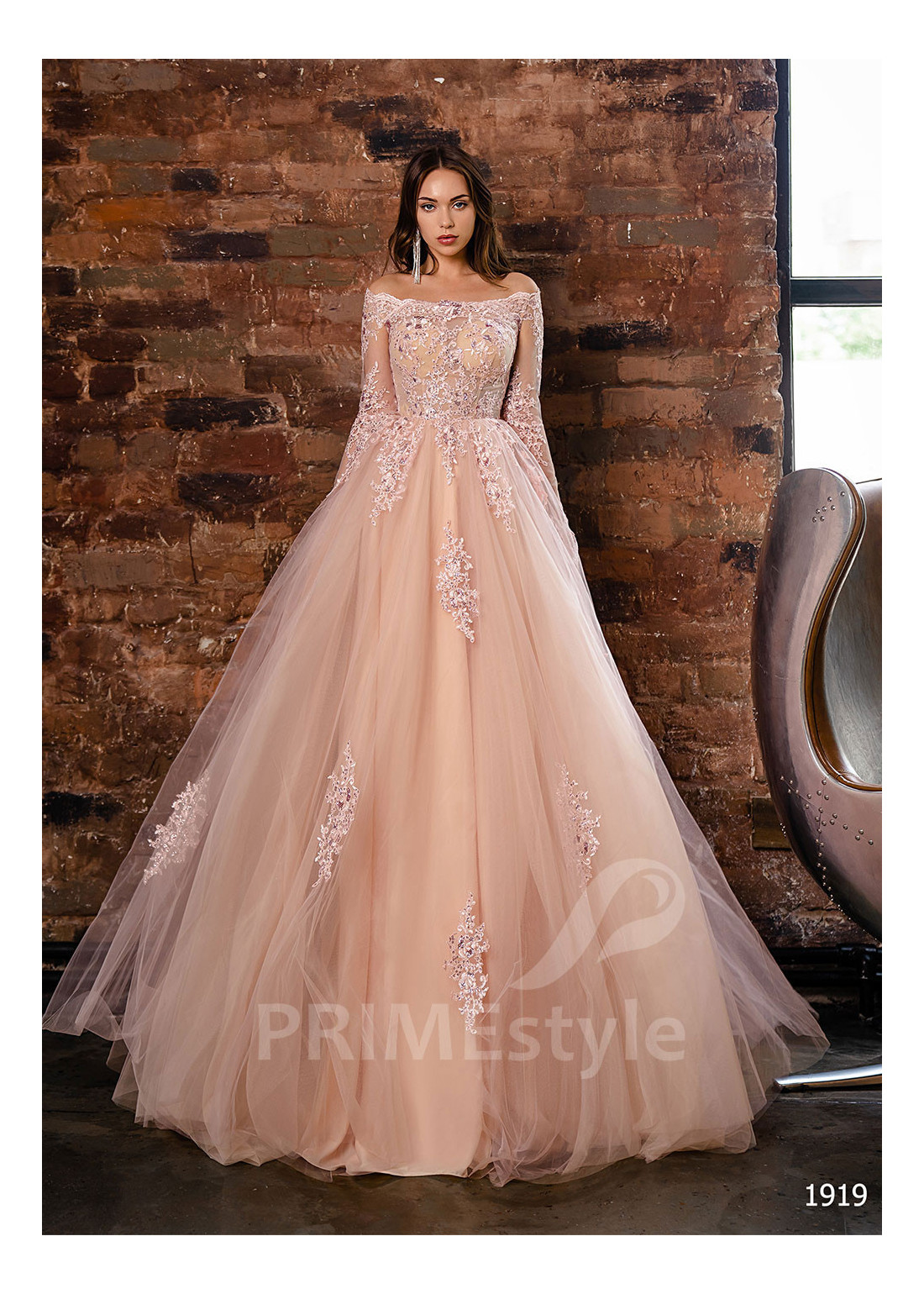 Luxusné tylové spoločenské šaty s dlhým rukávom, odhalenými ramenami a objemnou padavou tylovou sukňou. Korzet, rukávy a horná časť sukne sú zdobené bohatou vyšívanou čipkou. Vhodné aj ako šaty na ples, popolnočné šaty, šaty na svadbu a šaty pre svadobné mamy.