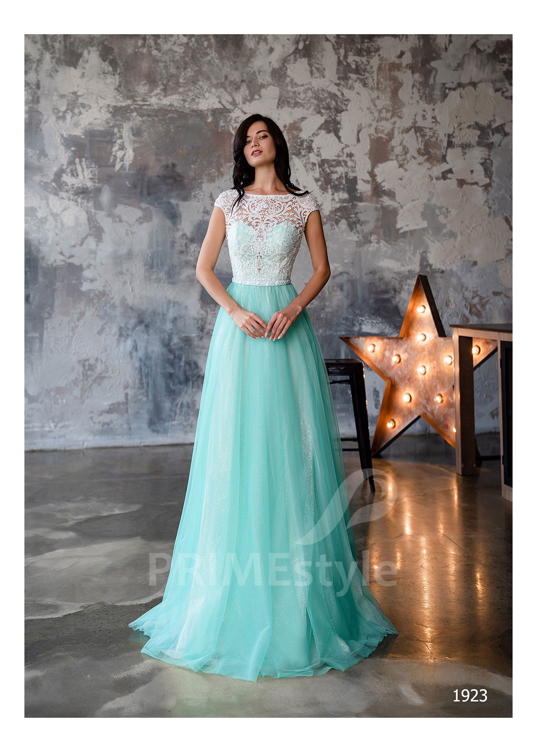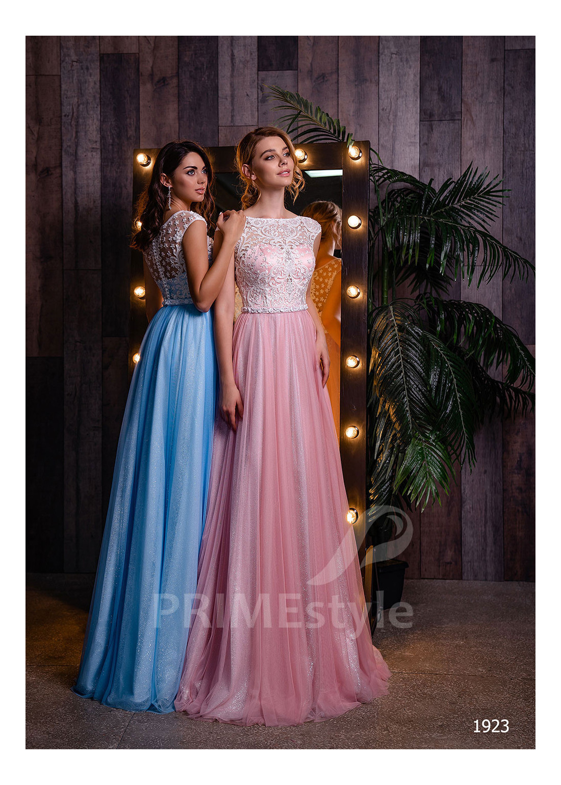 Jednoduché tylové spoločenské šaty s krátkymi rukávmi, lodičkovým výstrihom na hrudi, prekrytým chrbtom a s ľahkou padavou tylovou sukňou. Vhodné aj ako šaty na stužkovú, šaty na svadbu, šaty pre družičky a šaty pre svadobné mamy.