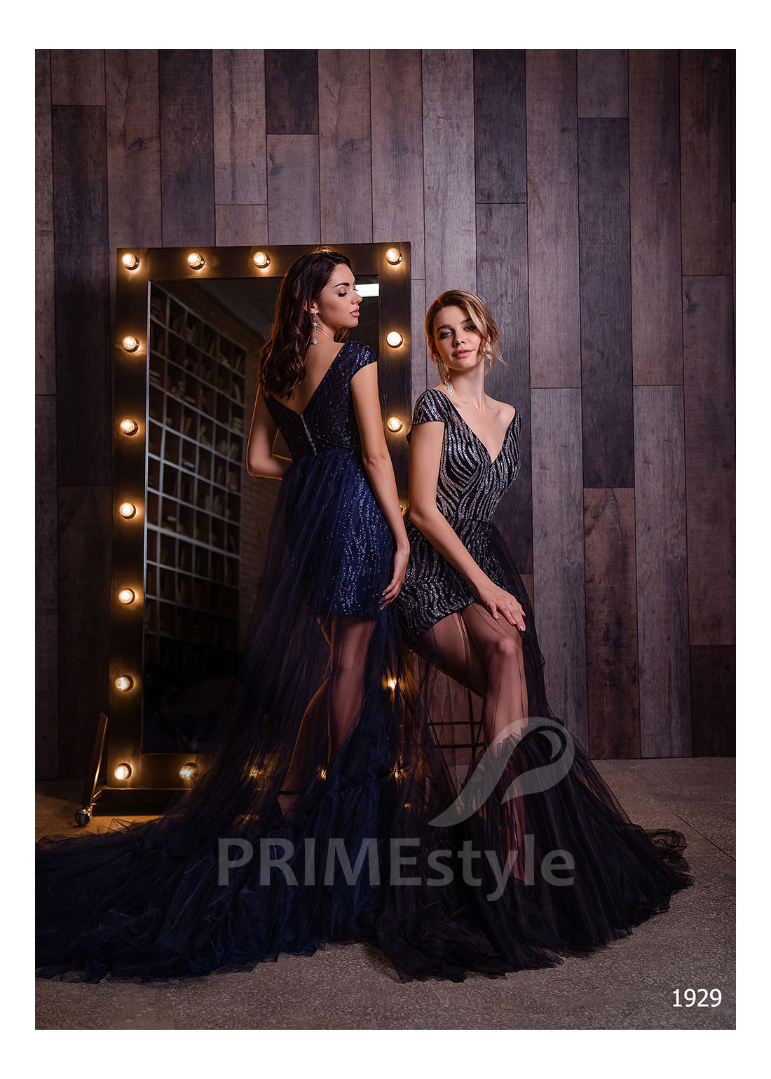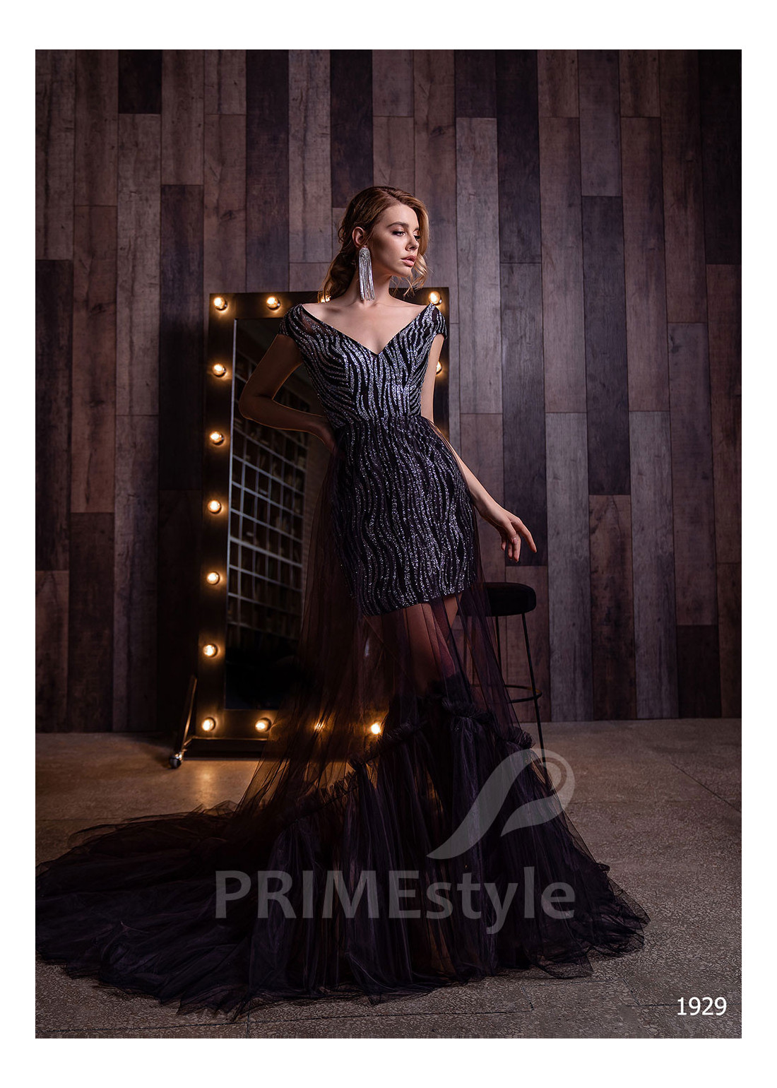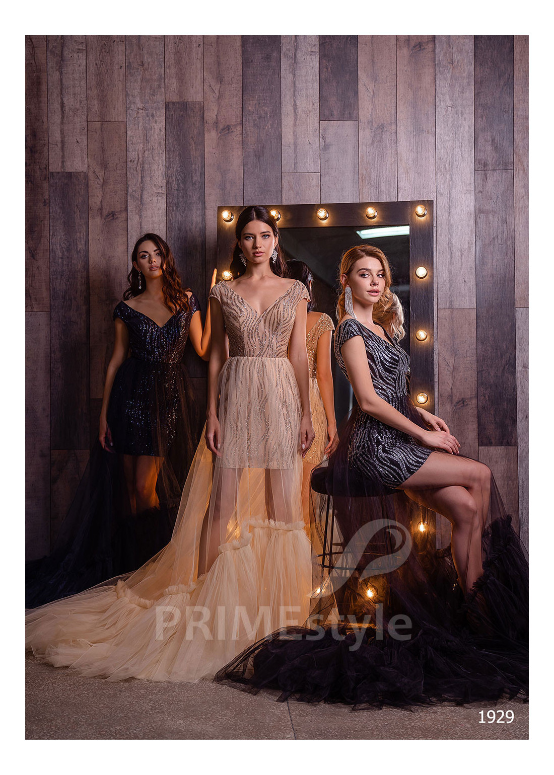 Originálne trblietavé spoločenské šaty s otvoreným dekoltom, výstrihom do V-čka, odhaleným chrbtom a vzdušnou priesvitnou tylovou sukňou s volánom na spodnom okraji. Vhodné aj ako šaty na ples, šaty na stužkovú a popolnočné šaty.