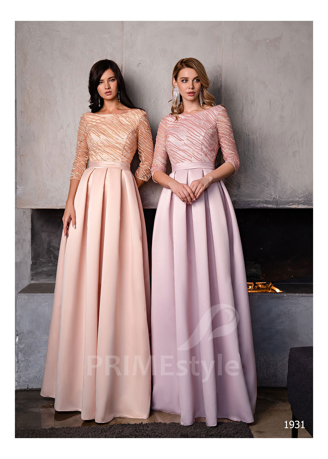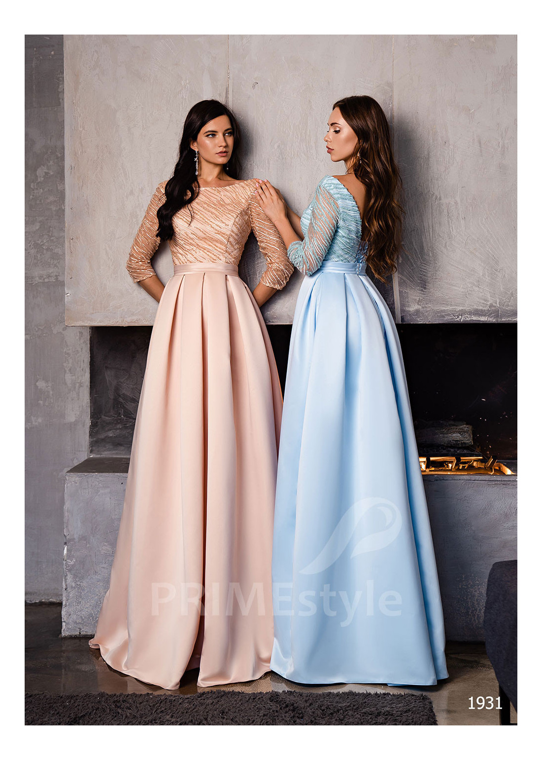 Saténové spoločenské šaty s 3/4 rukávom s lodičkovým výstrihom, odhaleným chrbtom a s objemnou padavou sukňou. Korzet a rukávy sú zdobené trblietavou čipkou. Vhodné aj ako šaty na ples, šaty na stužkovú a popolnočné šaty.
