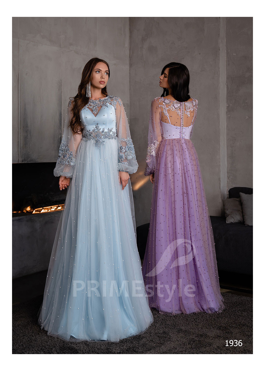 Roztomilé romantické spoločenské šaty s objemným balónovým rukávom, lodičkovým výstrihom, prekrytým chrbtom a ľahkou padavou tylovou sukňou. Korzet, pás a rukávy sú zdobené bohatou vyšívanou čipkou s 3D kvetmi. Vhodné aj ako šaty na ples, šaty na stužkovú a popolnočné šaty.