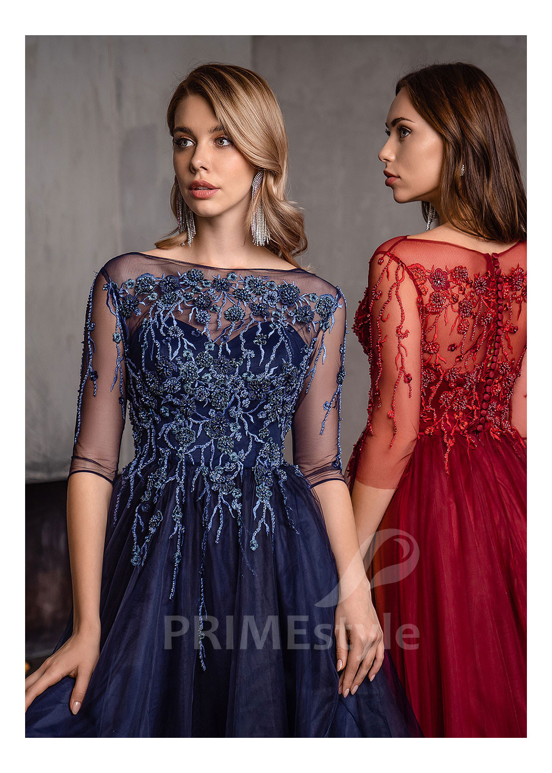 Nádherné spoločenské šaty s 3/4 rukávom, lodičkovým výstrihom, zahaleným chrbtom a objemnou padavou tylovou sukňou. Korzet, rukávy a horná časť sukne sú zdobené bohatou vyšívanou čipkou. Vhodné aj ako šaty na ples, popolnočné šaty, šaty na svadbu a šaty pre svadobné mamy.