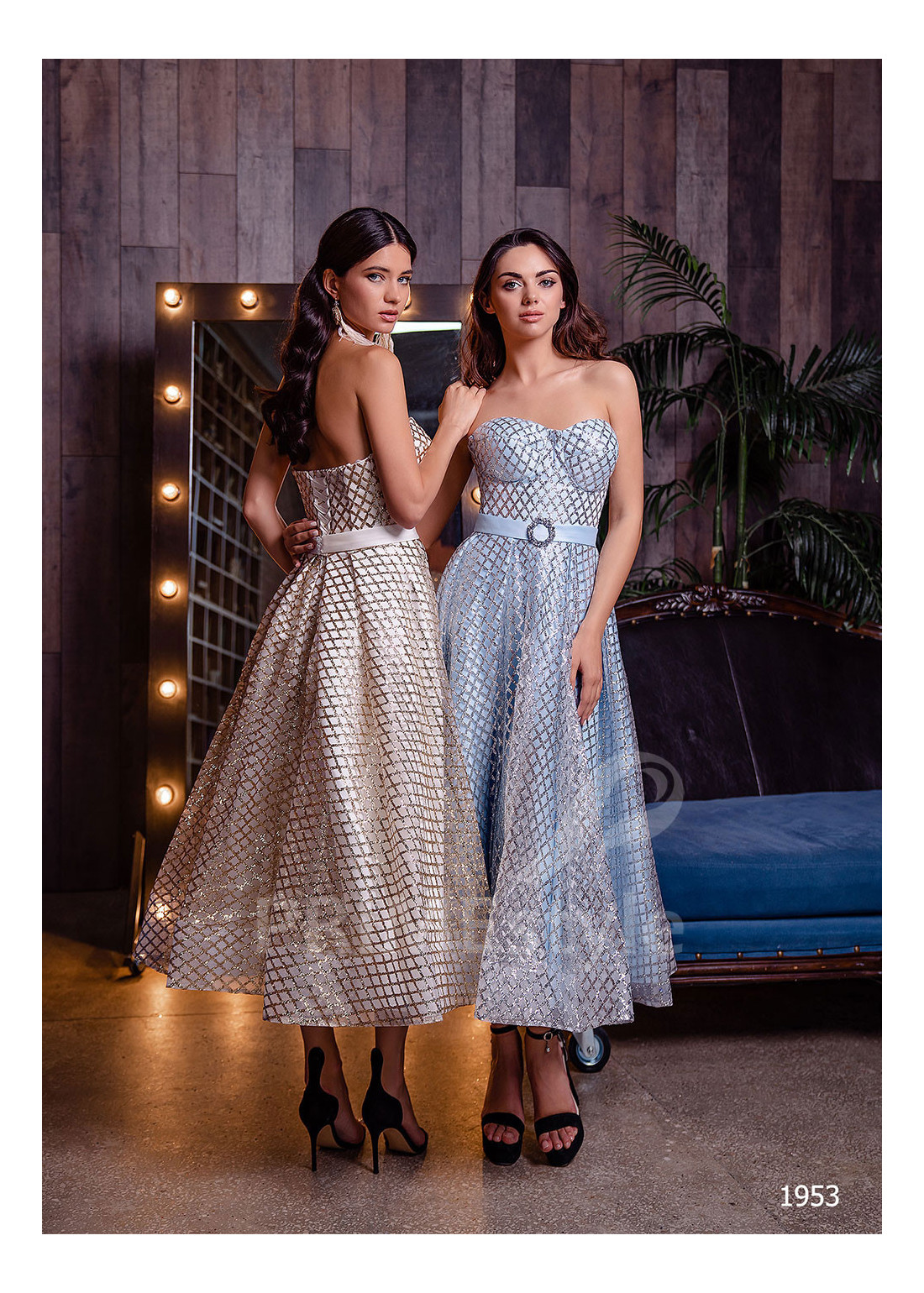 Moderné celotrblietavé midi spoločenské šaty s trendovým srdiečkovým výstrihom na hrudi, odhaleným chrbtom a objemnou padavou sukňou. Vhodné aj ako popolnočné šaty, šaty na svadbu a šaty na party.