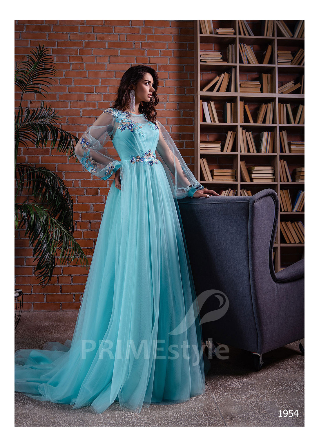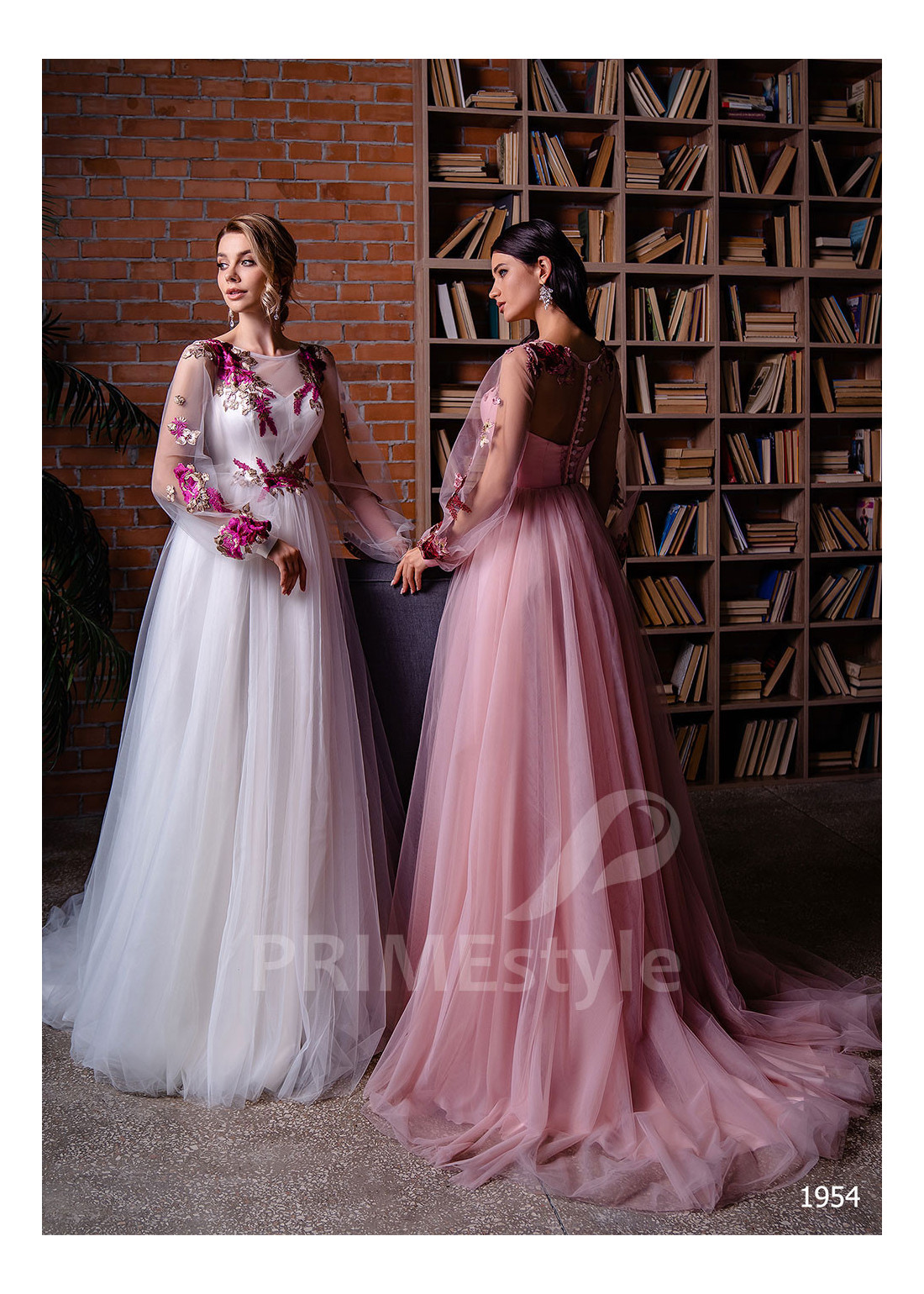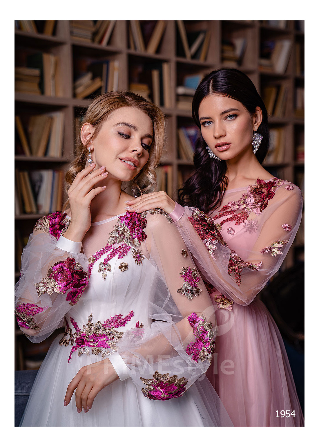 Roztomilé romantické spoločenské šaty s objemnými balónovými rukávmi, prekrytým dekoltom a chrbtom a s ľahkou pekne tvarovanou tylovou sukňou. Korzet, rukávy a pás sú zdobené aplikáaciami nádhernej kvetovanej čipky.