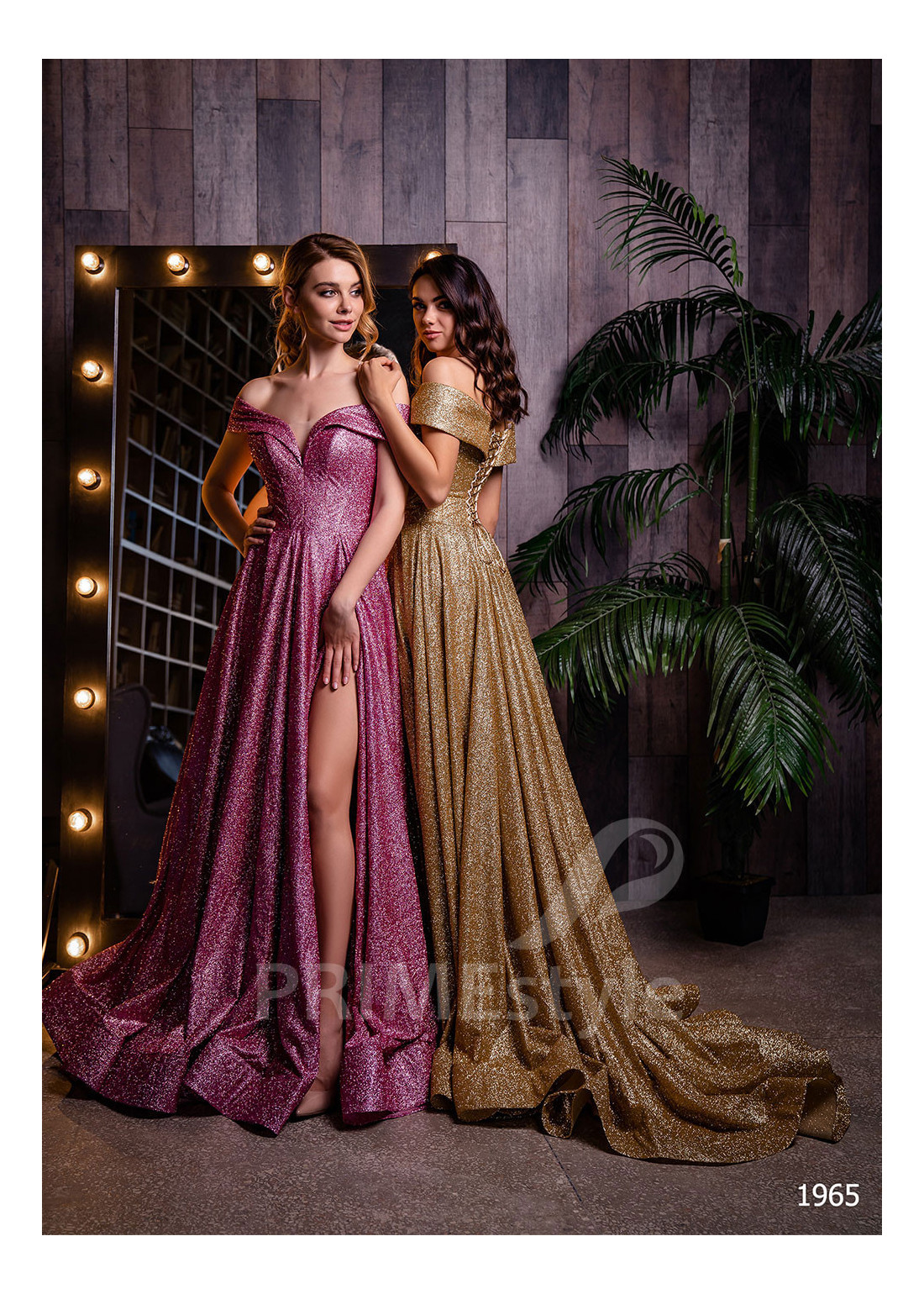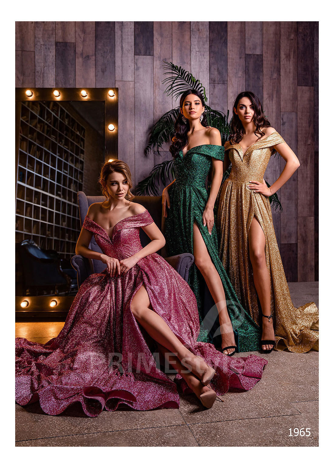 Luxusné celotrblietavé spoločenské šaty s odhalenými ramenami, výstrihom do V-čka a efektnou krásne tvarovanou sukňou s rázporkom na ľavej nohe. Vhodné aj ako šaty na stužkovú, šaty na party a popolnočné šaty.