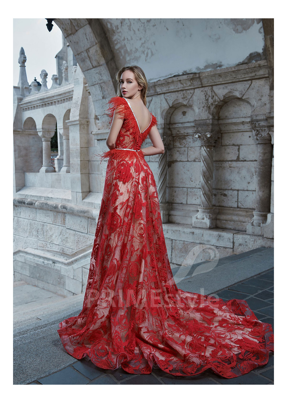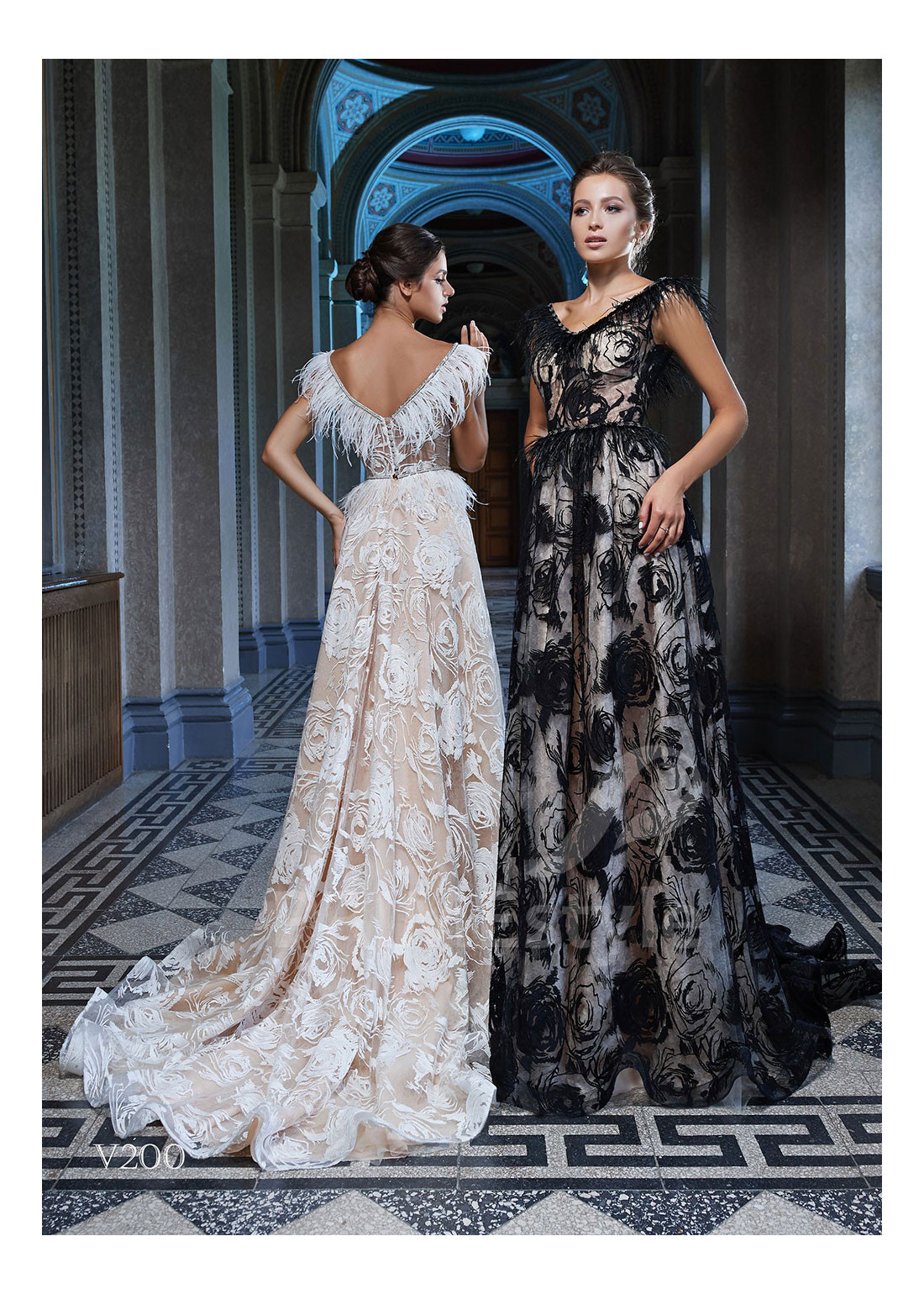 Rozkošné celočipkované spoločenské šaty s výstrihom do V-čka, odhaleným chrbtom a padavou pekne tvarovanou sukňou. Okraje korzetu a pás sú dekorované pierkami. Vhodné aj luxusné šaty na stužkovú a popolnočné šaty.