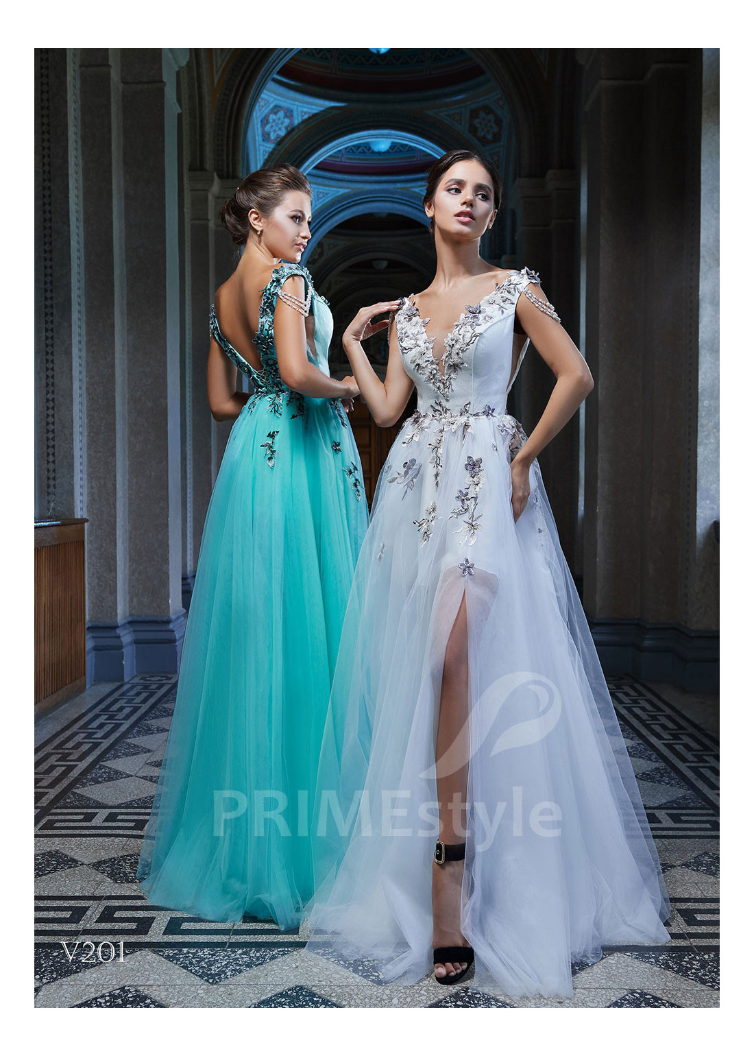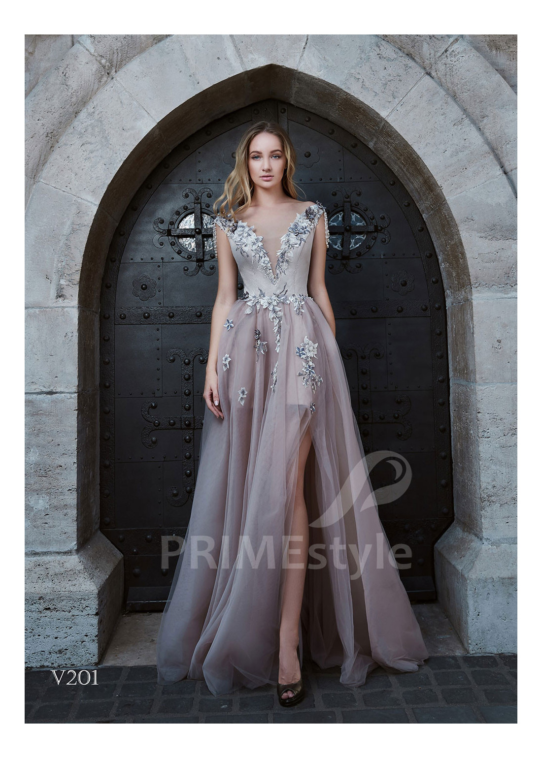 Vkusné romantické spoločenské šaty s otvoreným dekoltom, hlbokým V-výstrihom na hrudi, odhaleným chrbtom a ľahkou padavou tylovou sukňou s rázporkom. Korzet a horná časť sukne sú zdobené aplikáciami krásnej farebnej čipky s 3D kvetmi. Vhodné aj ako šaty na ples, popolnočné šaty, šaty na svadbu a šaty pre svadobné mamy.