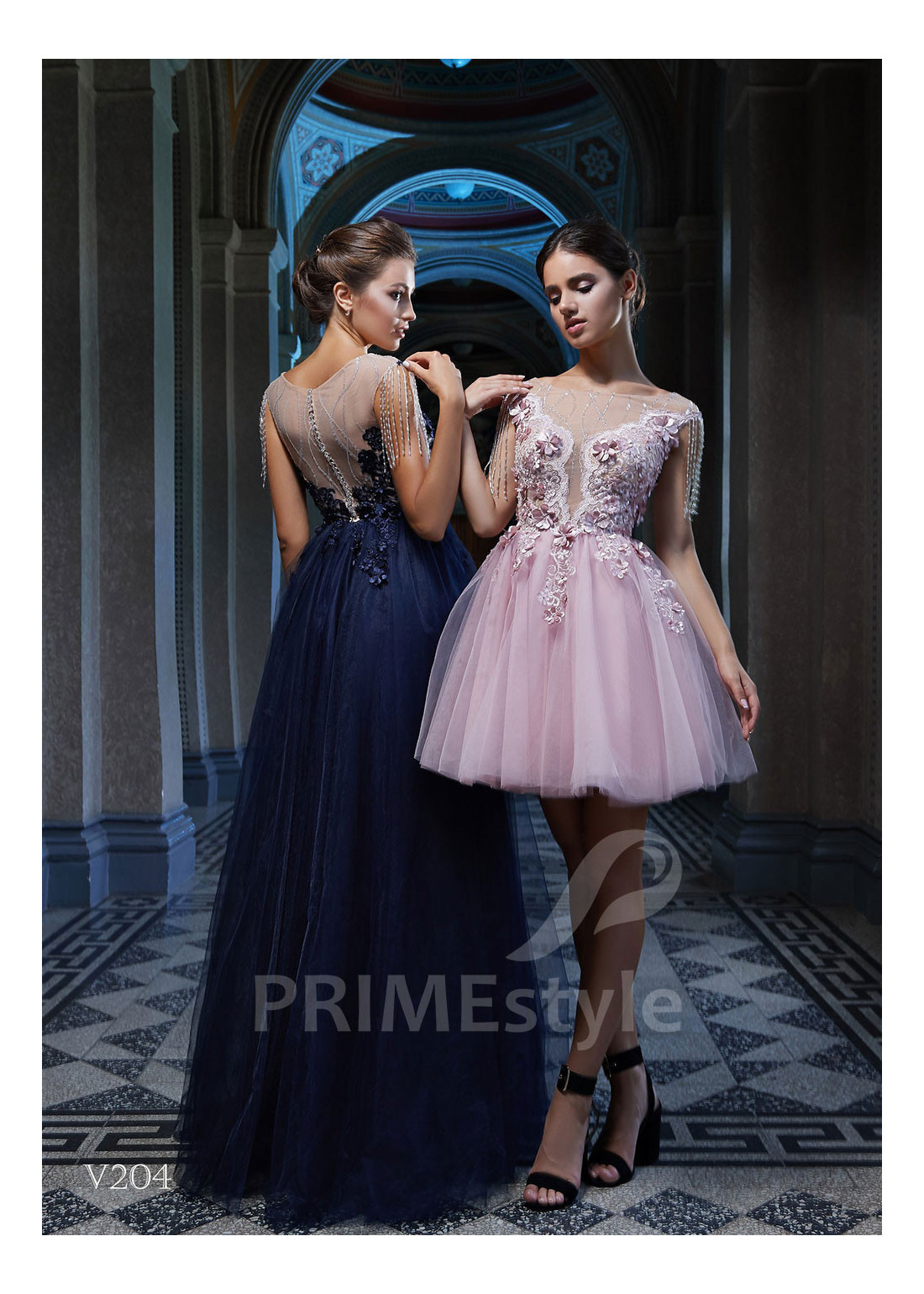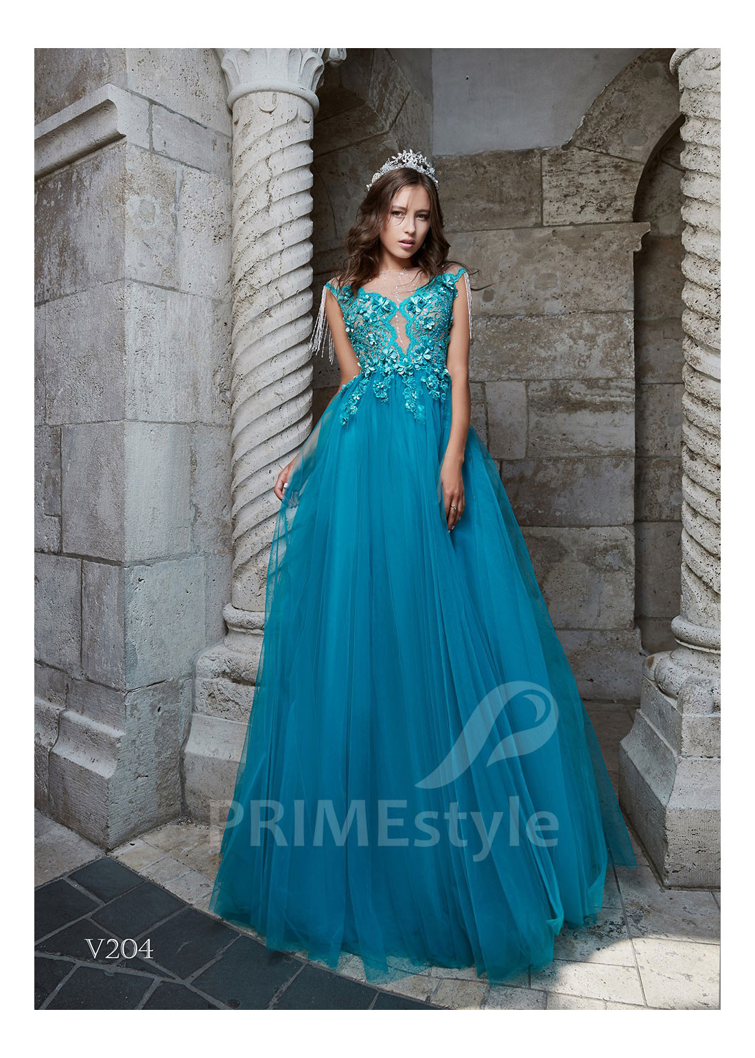 Roztomilé romantické spoločenské šaty s prekrytým dekoltom, výstrihom do V-čka a vzdušnou tylovou sukňou. Korzet a horná časť sukne sú zdobené krásnou vyšívanou čipkou s 3D kvetmi. Možnosť ušitia s midi alebo maxi sukňou. Vhodné aj ako šaty na ples, popolnočné šaty a šaty pre svadobné mamy.