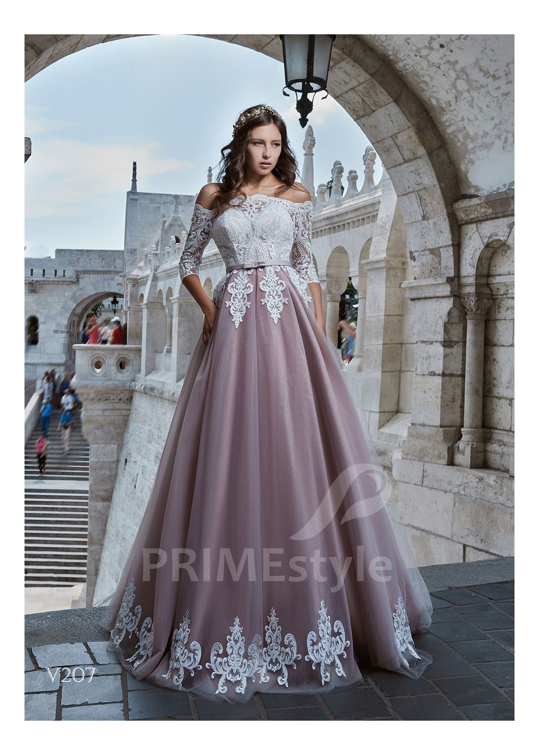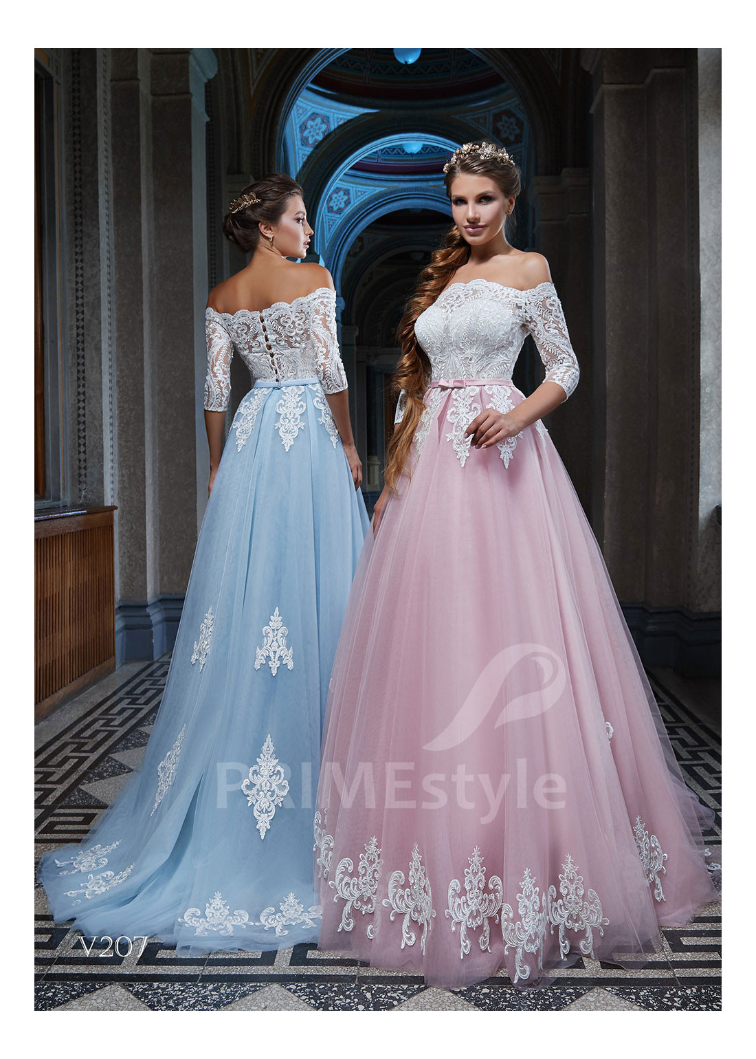 Efektné spoločenské šaty s 3/4 rukávmi, otvoreným dekoltom, odhalenými ramenami a padavou pekne tvarovanou tylovou sukňou. Korzet, rukávy, horná aj spodná časť sukne sú zdobené krásnymi aplikáciami čipky.