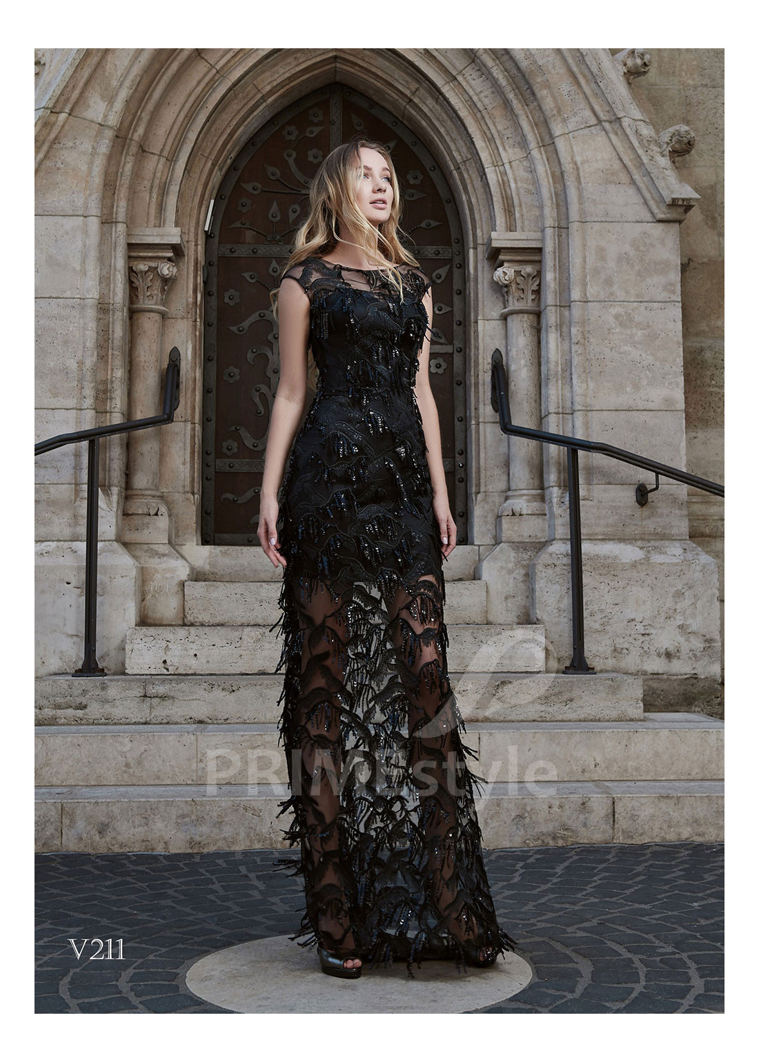 Extravagantné úzke celočipkované spoločenské šaty s lodičkovým výstrihom efektnou priliehavou sukňou. Vhodné ako šaty na ples, šaty na oslavu alebo šaty na party.