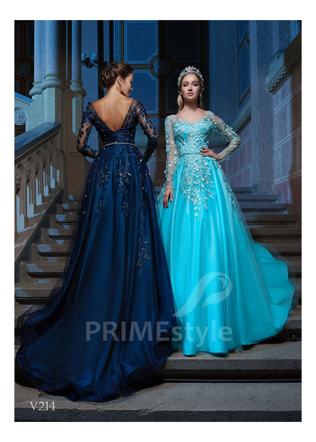 Efektné spoločenské šaty s dlhým rukávom, otvoreným dekoltom, vystrihom do V-čka, odhaleným chrbtom a objemnou pekne tvarovanou padavou sukňou. Korzet, rukávy a horná časť sukne sú zdobené bohatou vyšívanou čipkou. Vhodné aj ako šaty na stužkovú, popolnočné šaty, šaty na svadbu a šaty pre svadobné mamy.