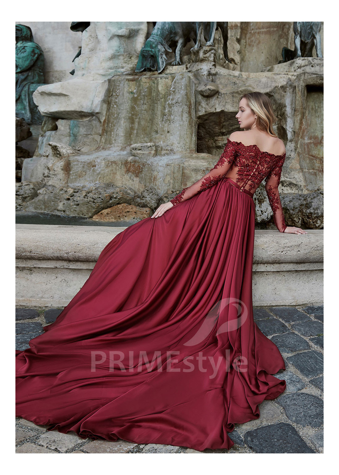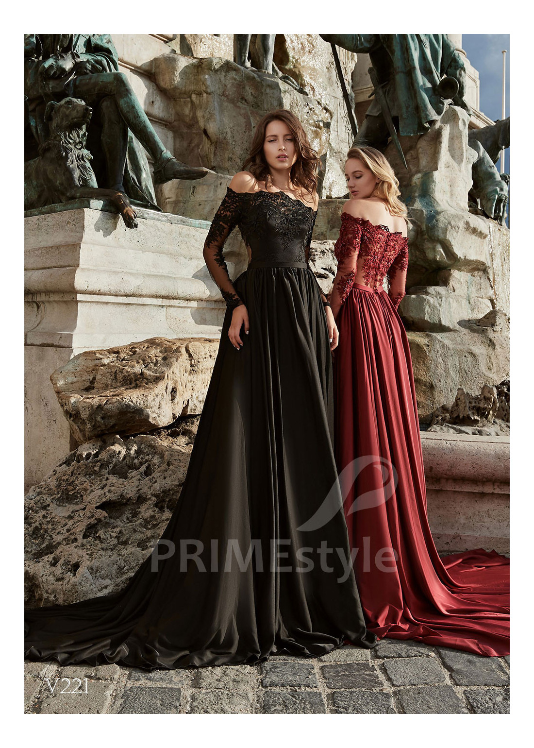 Šarmantné spoločenské šaty s dlhým rukávom, odhalenými ramenami, prekrytým chrbtom a padavou krásne tvarovanou sukňou. Vhodné aj ako luxusné šaty na stužkovú, popolnočné šaty a šaty pre svadobné mamy.