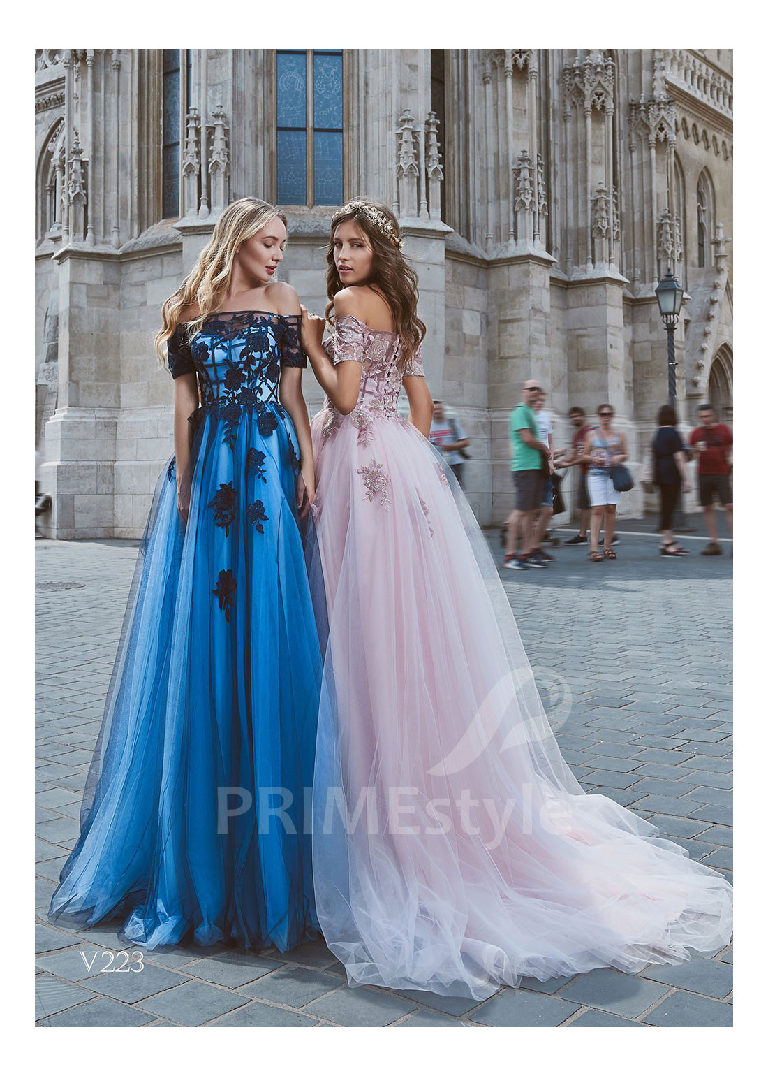 Moderné spoločenské šaty s padnutými rukávmi, trendovým rovným výstrihom na hrudi, mierne odhaleným chrbtom a ľahkou objemnou tylovou sukňou. Korzet, rukávy a horná časť sukne sú zdobené bohatou kvetovanou vyšívanou čipkou.