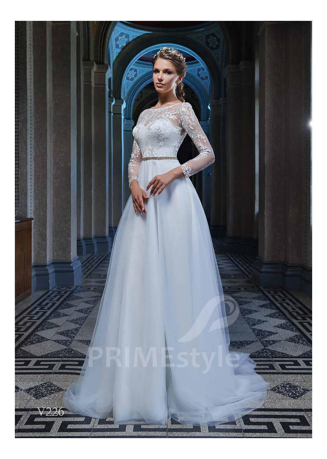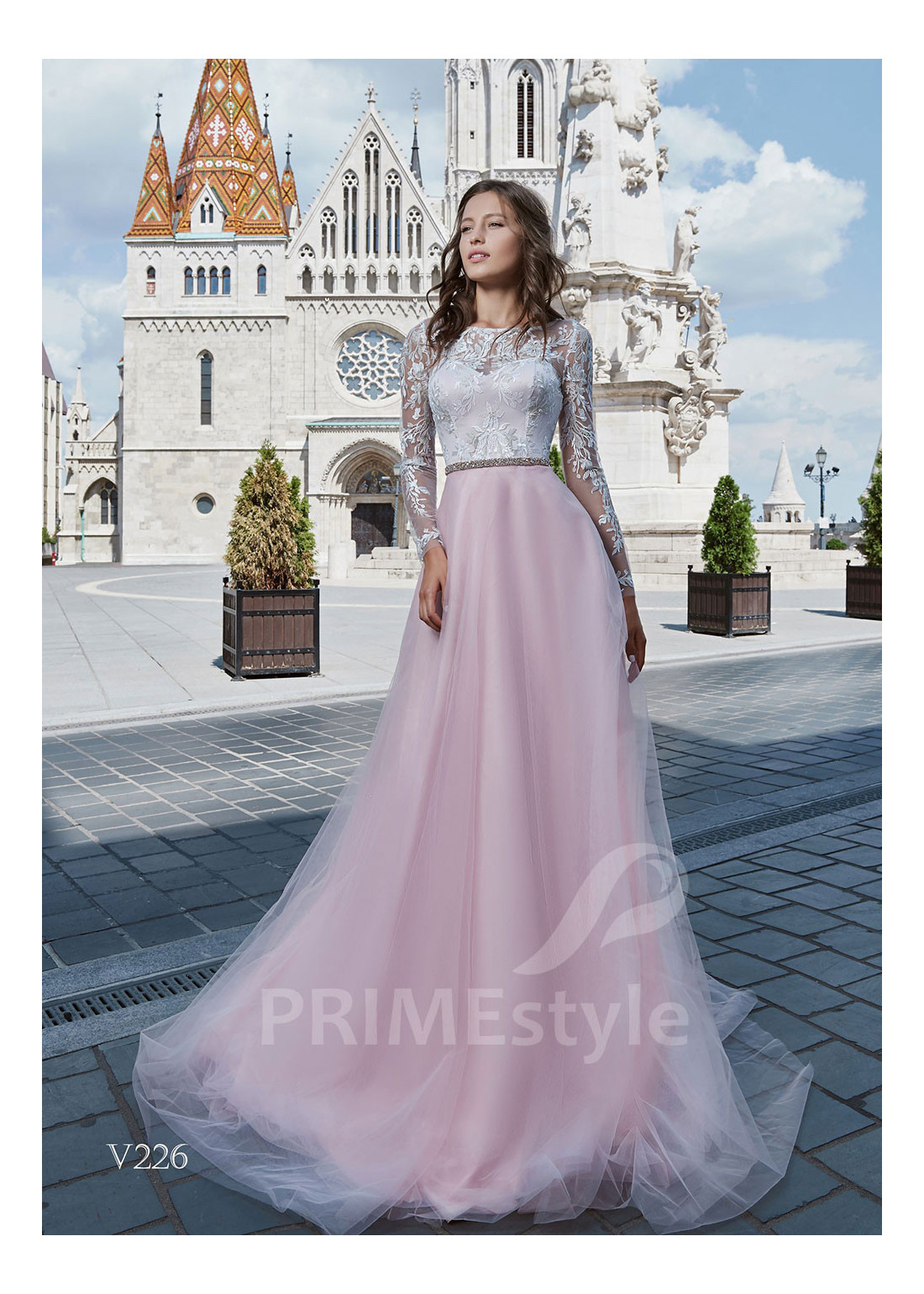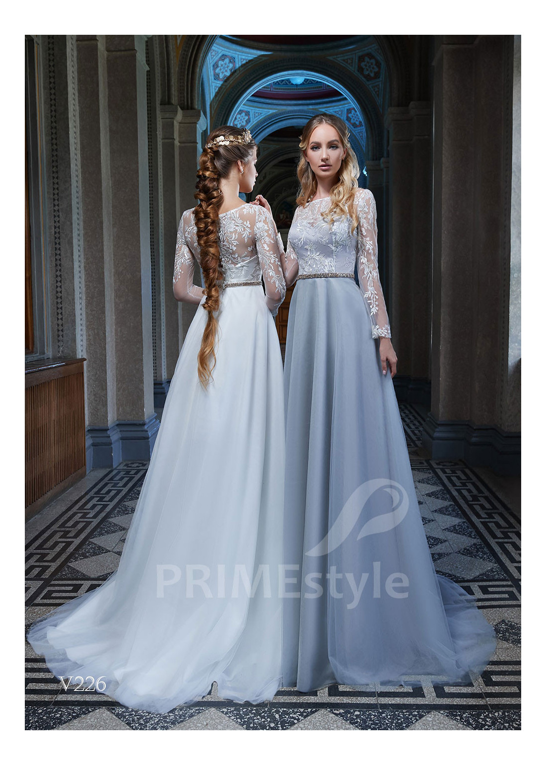 Nádherné spoločenské šaty s dlhým rukávom, lodičkovým výstrihom, prekrytým chrbtom a ľahkou pekne tvarovanou tylovou sukňou. Korzet a rukávy sú zdobené krásnou vyšívanou čipkou. Vhodné aj ako šaty na ples, šaty na stužkovú a popolnočné šaty.