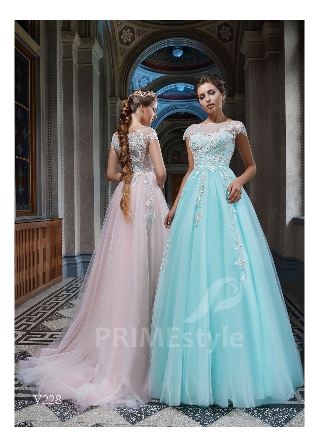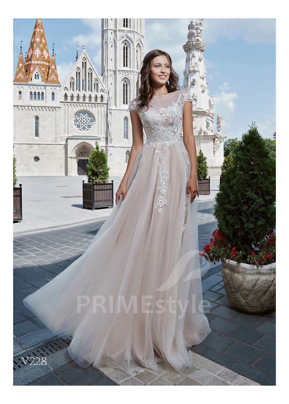 Vkusné spoločenské šaty s krátkym rukávom, lodičkovým výstrihom na hrudi, prekrytým chrbtom a ľahkou obejmnou tylovou sukňou. Korzet, rukávy a horná časť sukne sú zdobené bohatou vyšívanou čipkou. Vhodné aj ako šaty na ples, luxusné šaty na stužkovú, popolnočné šaty a šaty pre svadobné mamy.