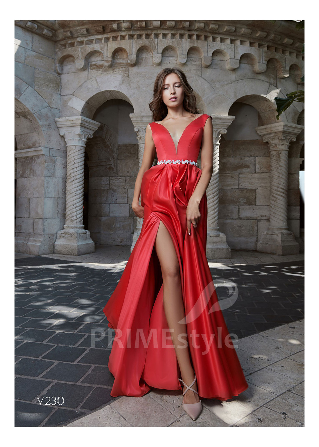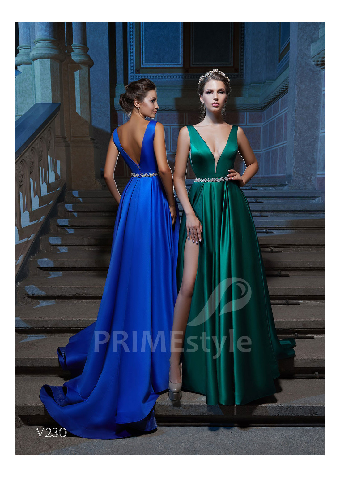 Graciózne saténové spoločenské šaty s otvoreným dekoltom, hlbokým V-výstrihom na hrudi, odhaleným chrbtom a objemnou pekne tvarovanou sukňou s rázporkom. Vhodné aj ako šaty na ples, popolnočné šaty, šaty na svadbu, šaty pre družičky a šaty pre svadobné mamy.