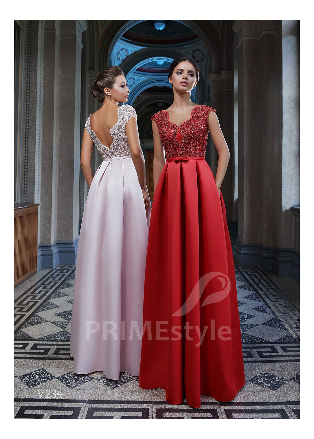Vkusné dlhé spoločenské šaty s bohato zdobeným korzetom, mierne otvoreným dekoltom s výstrihom do V-čka, odhaleným chrbtom a objemnou padavou saténovou sukňou. Vhodné aj ako šaty na ples, popolnočné šaty, šaty na svadbu a šaty pre svadobné mamy.