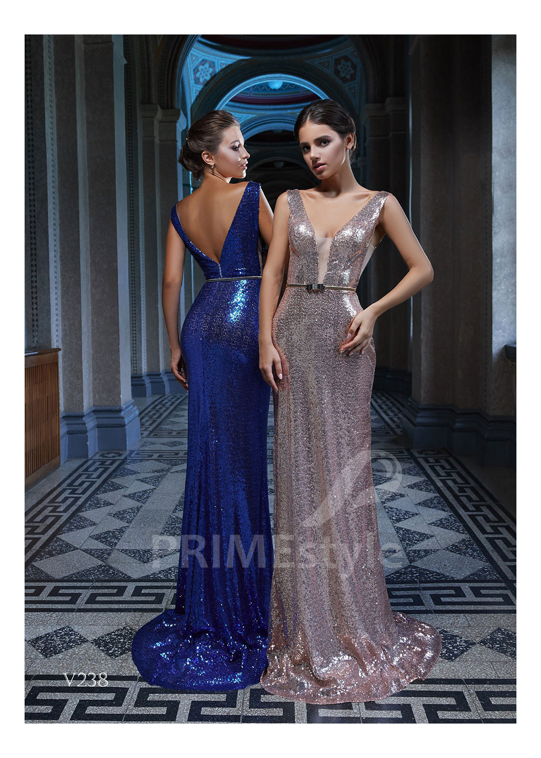 Luxusné úzke celotrblietavé spoločenské šaty s otvoreným dekoltom, hlbokým výstrihom do V-čka, odhaleným chrbtom a krásne tvarovanou priliehavou sukňou. Vhodné aj ako luxusné šaty na stužkovú, popolnočné šaty a šaty na svadbu.