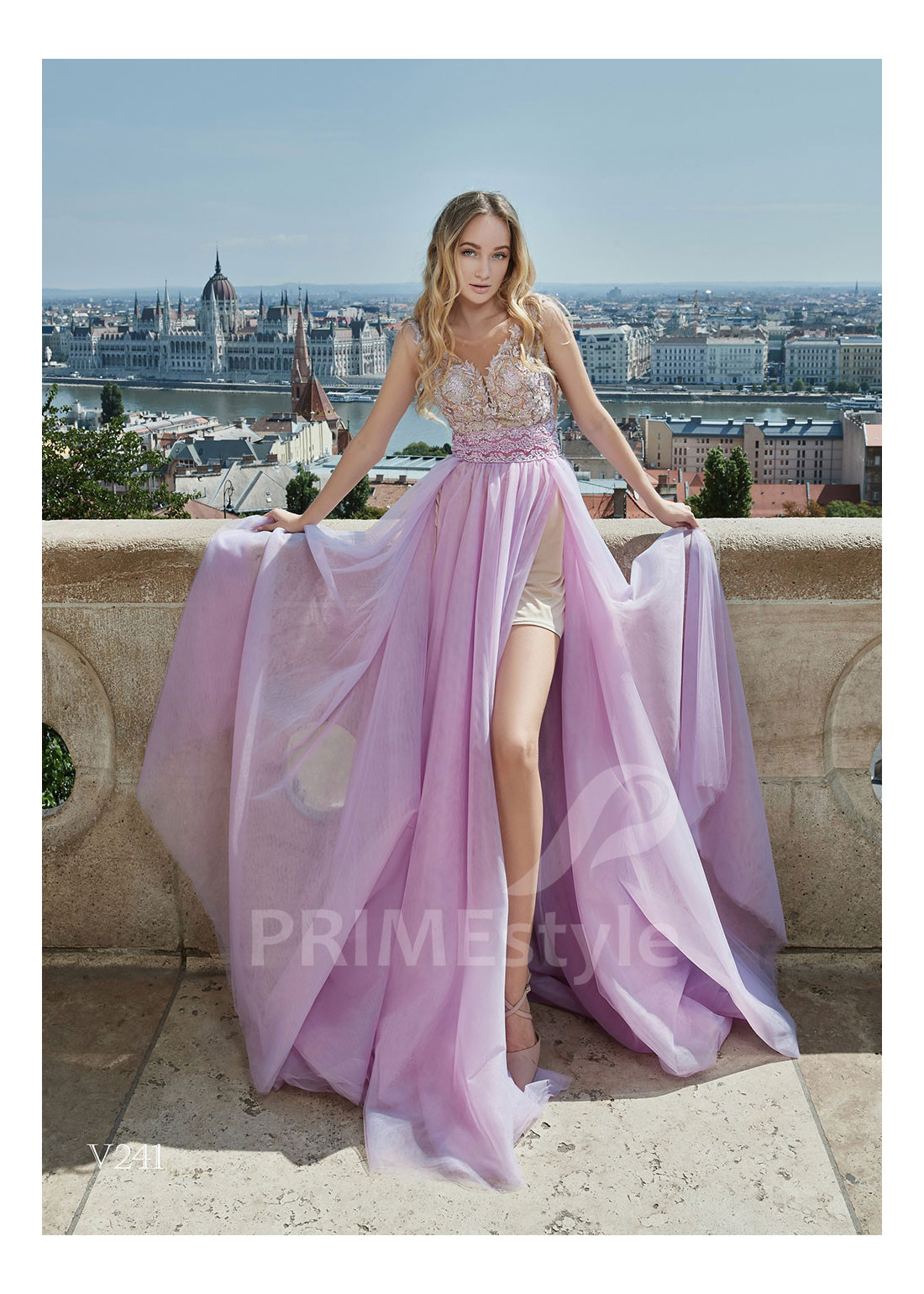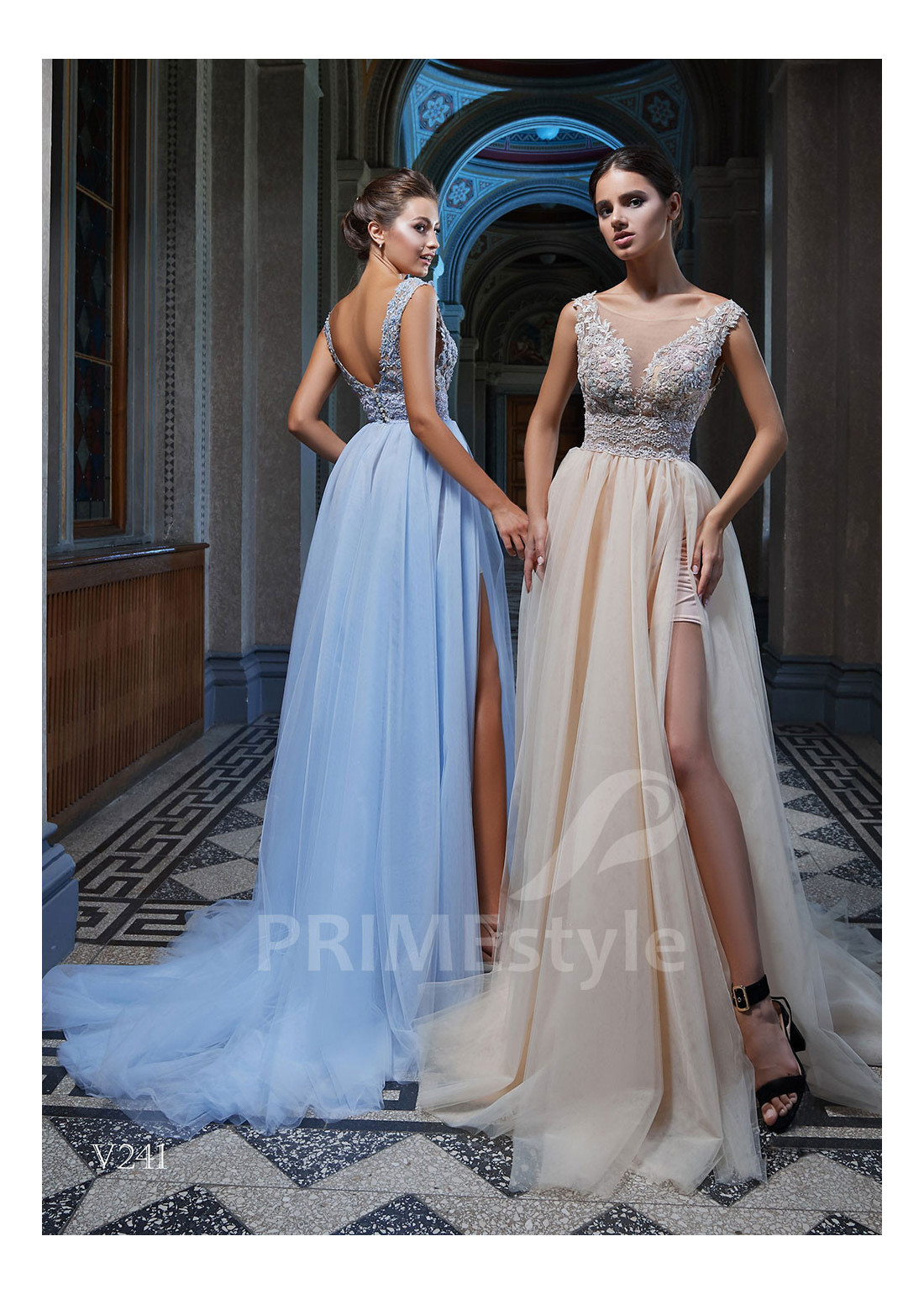 Dlhé luxusné spoločenské šaty s bohato zdobeným korzetom, zvýrazneným pásom, výstrihom do V-čka, odhaleným chrbtom a ľahkou padavou tylovou sukňou s rázporkom. Vhodné aj ako šaty na ples, popolnočné šaty, šaty na svadbu a šaty pre svadobné mamy.