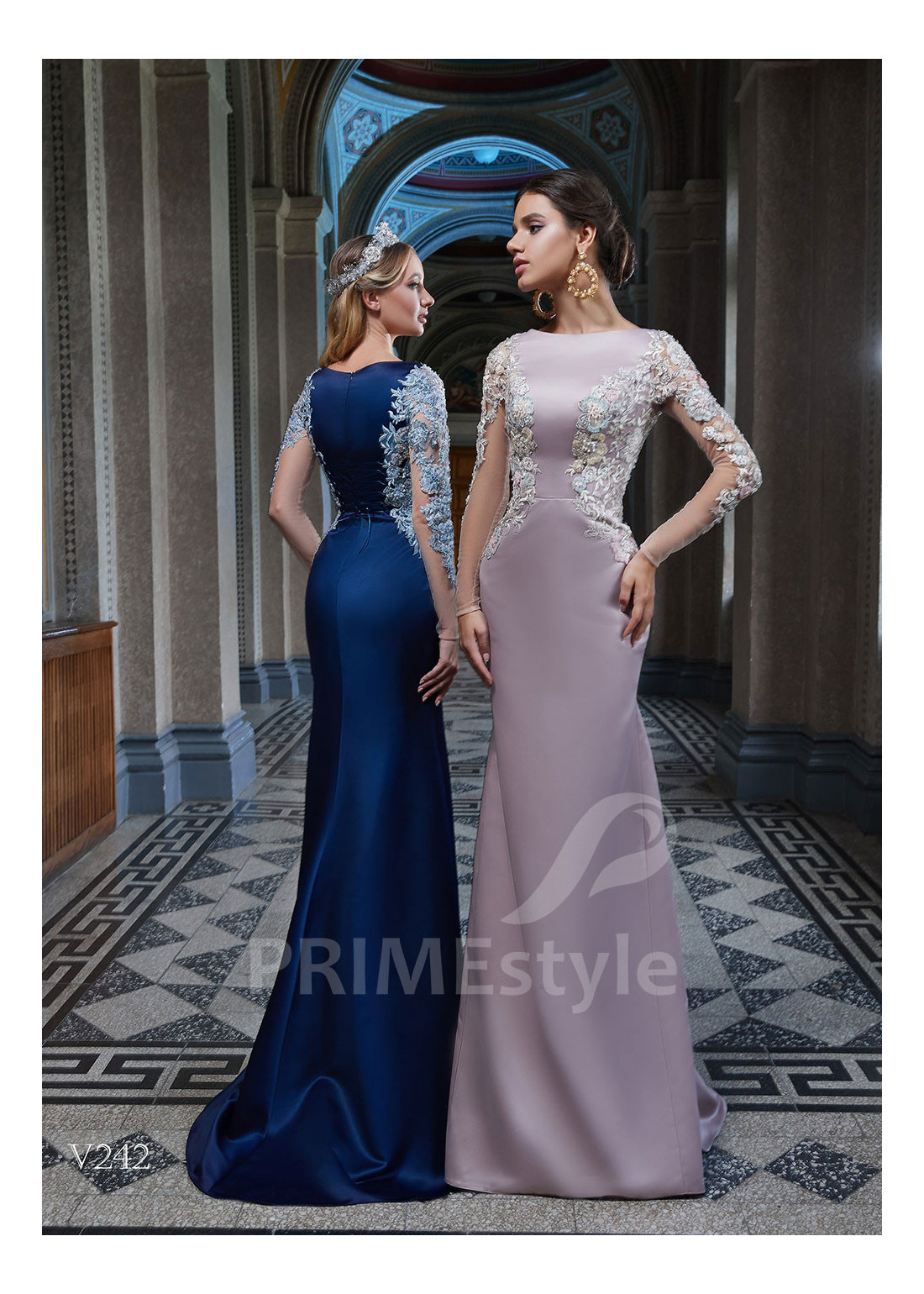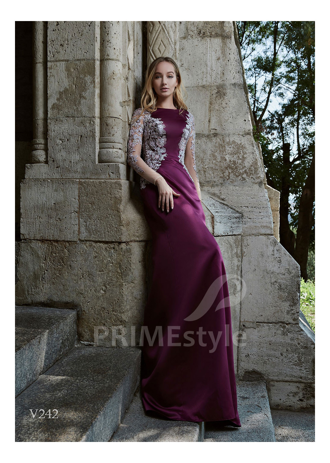 Elegantné úzke spoločenské šaty s dlhým rukávom, zakrytým dekoltom, lodičkovým výstrihom, zahaleným chrbtom a krásne tvarovanou priliehavou sukňou. Korzet, rukávy a horná časť sukne sú zdobené rozkošnou vyšívanou čipkou s 3D kvetmi.