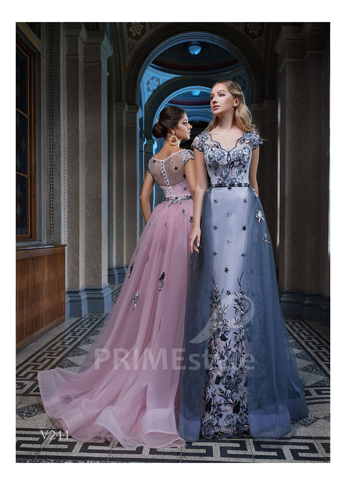 Luxusné spoločenské šaty bohato dekorované spoločenské šaty s výstrihom do V-čka, prekrytým chrbtom a úzkou pekne tvarovanou sukňou s vzdušnou tylovou vlečkou. Korzet, sukňa a vlečka sú zdobené rozkošnou vyšívanou kvetovanou čipkou. Vhodné aj ako šaty na ples, šaty na stužkovú a popolnočné šaty.