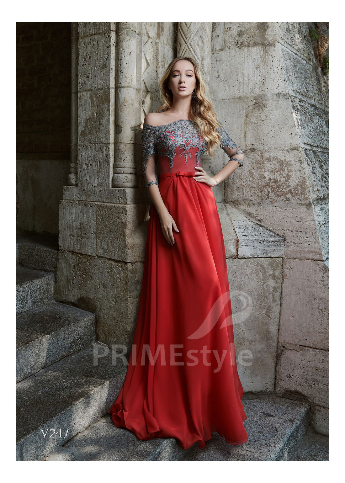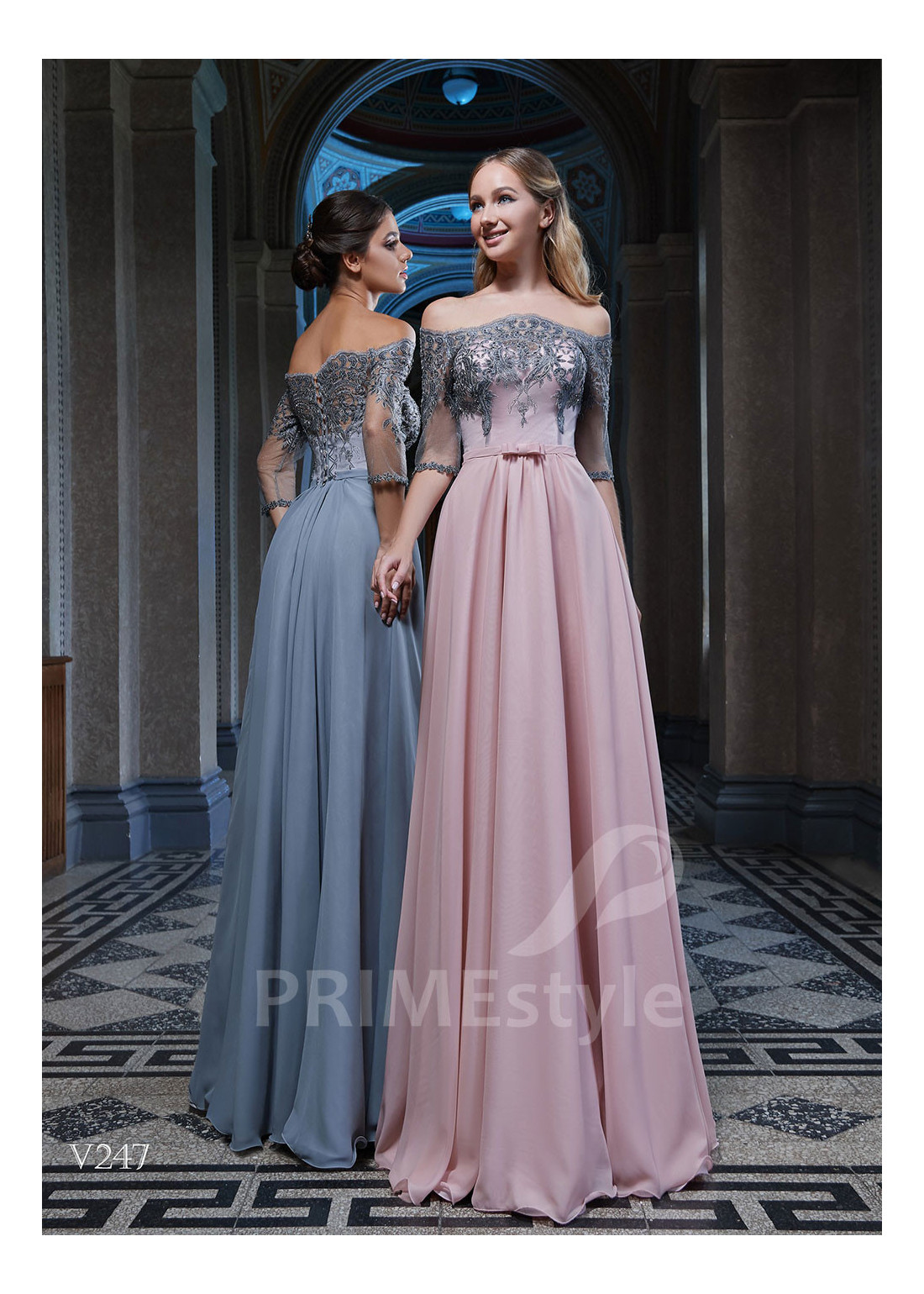 Elegantné spoločenské šaty s 3/4 rukávom, bohato zdobeným korzetom, odhalenými ramenami a krásne tvarovanou padavou A-čkovou sukňou. Vhodné aj ako šaty na stužkovú, popolnočné šaty, šaty na svadbu a šaty pre svadobné mamy.