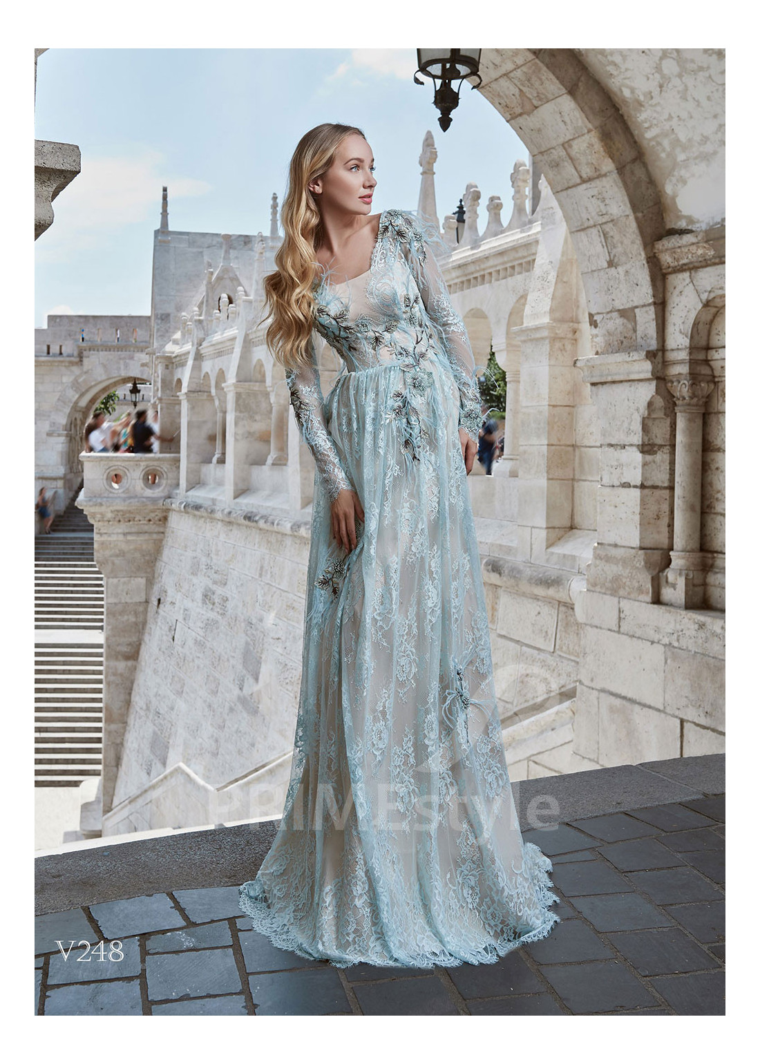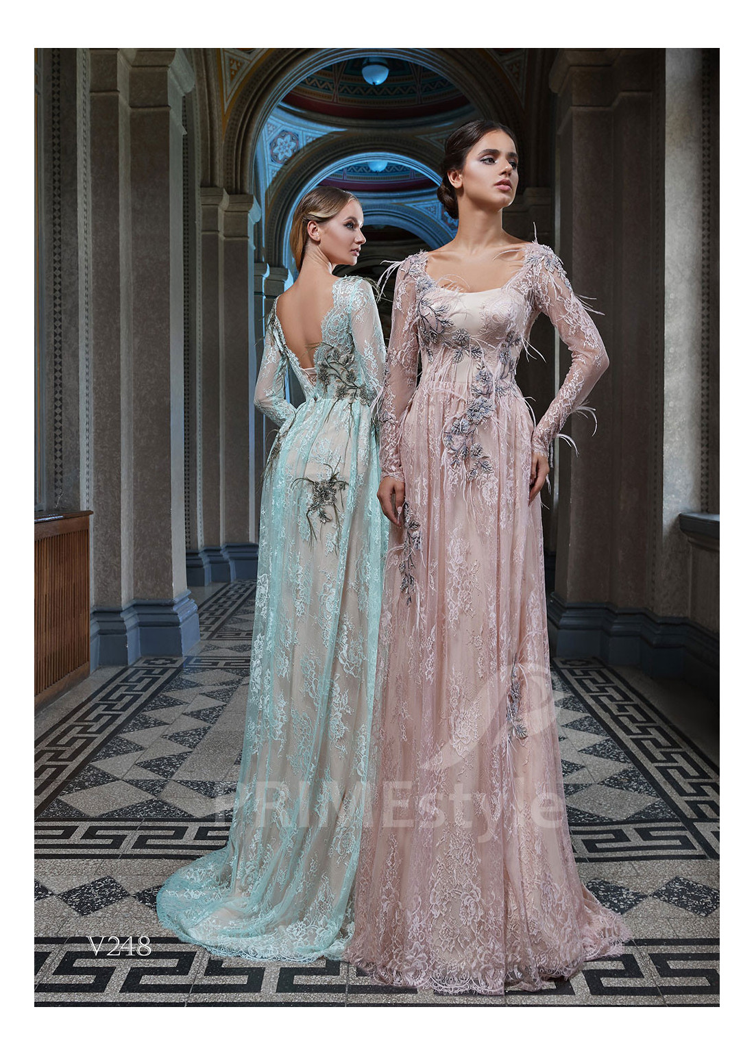 Luxusné celočipkované spoločenské šaty s dlhým rukávom, otvoreným dekoltom, trendovým rovným výstrihom, odhaleným chrbtom a ľahkou padavou sukňou. Korzet, rukávy a horná časť sukne sú zdobené bohatou vyšívanou čipkou a pierkami. Vhodné aj ako luxusné šaty na stužkovú, šaty na svadbu a šaty pre svadobné mamy.