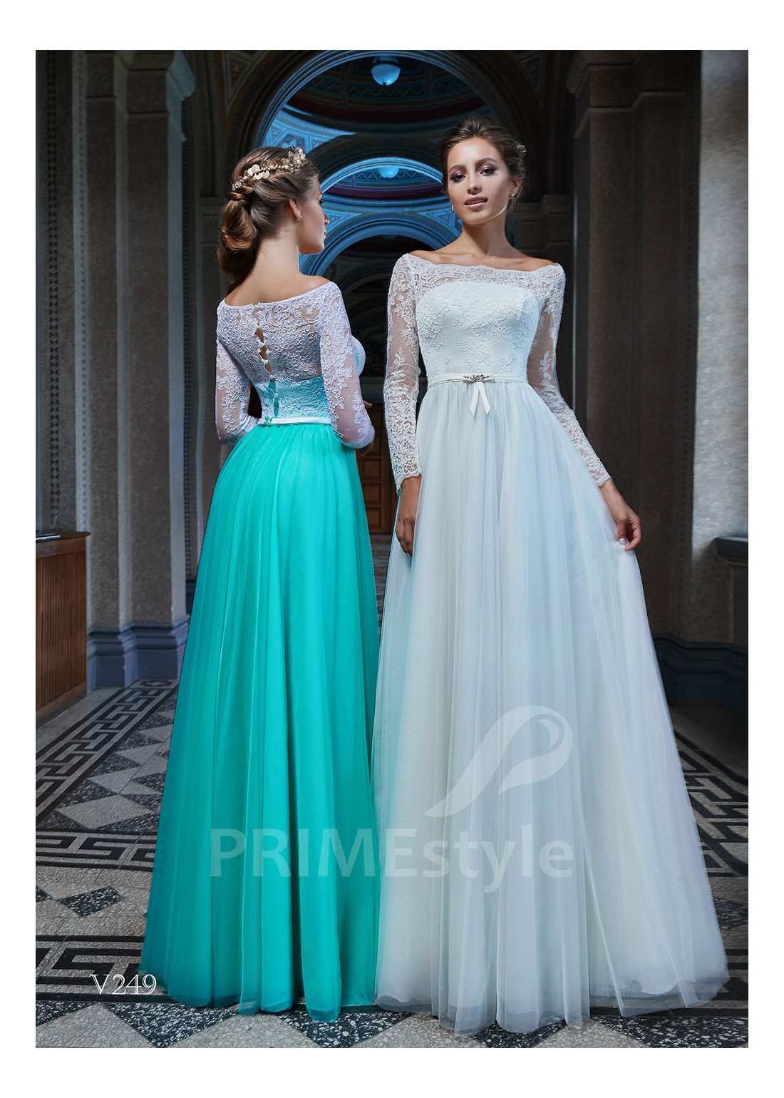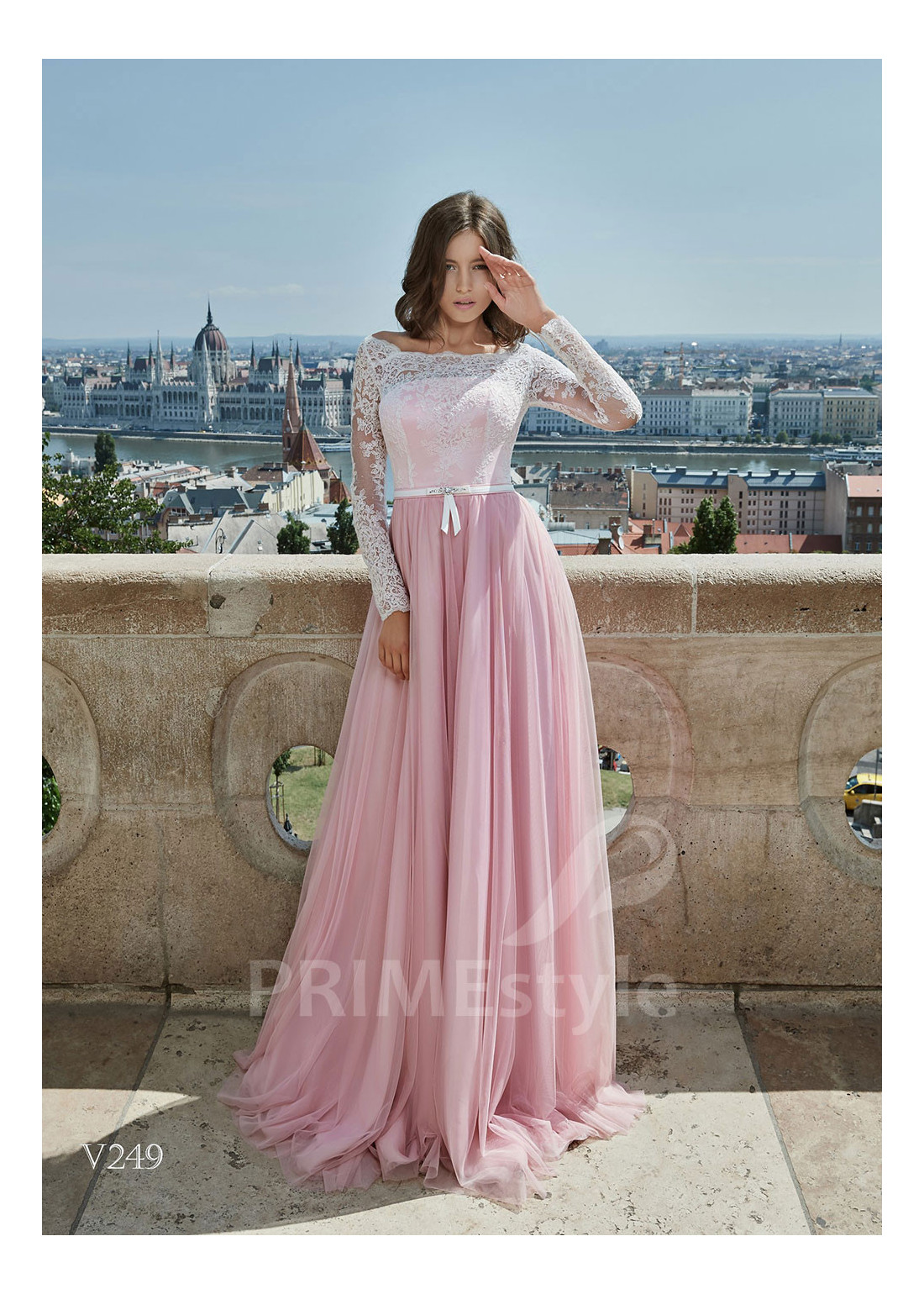 Vkusné decentné spoločenské šaty s dlhým rukávom, lodičkovým výstrihom, prekrytým chrbtom a vzdušnou pekne tvarovanou tylovou sukňou. Vhodné aj ako šaty na ples, šaty na stužkovú a popolnočné šaty.