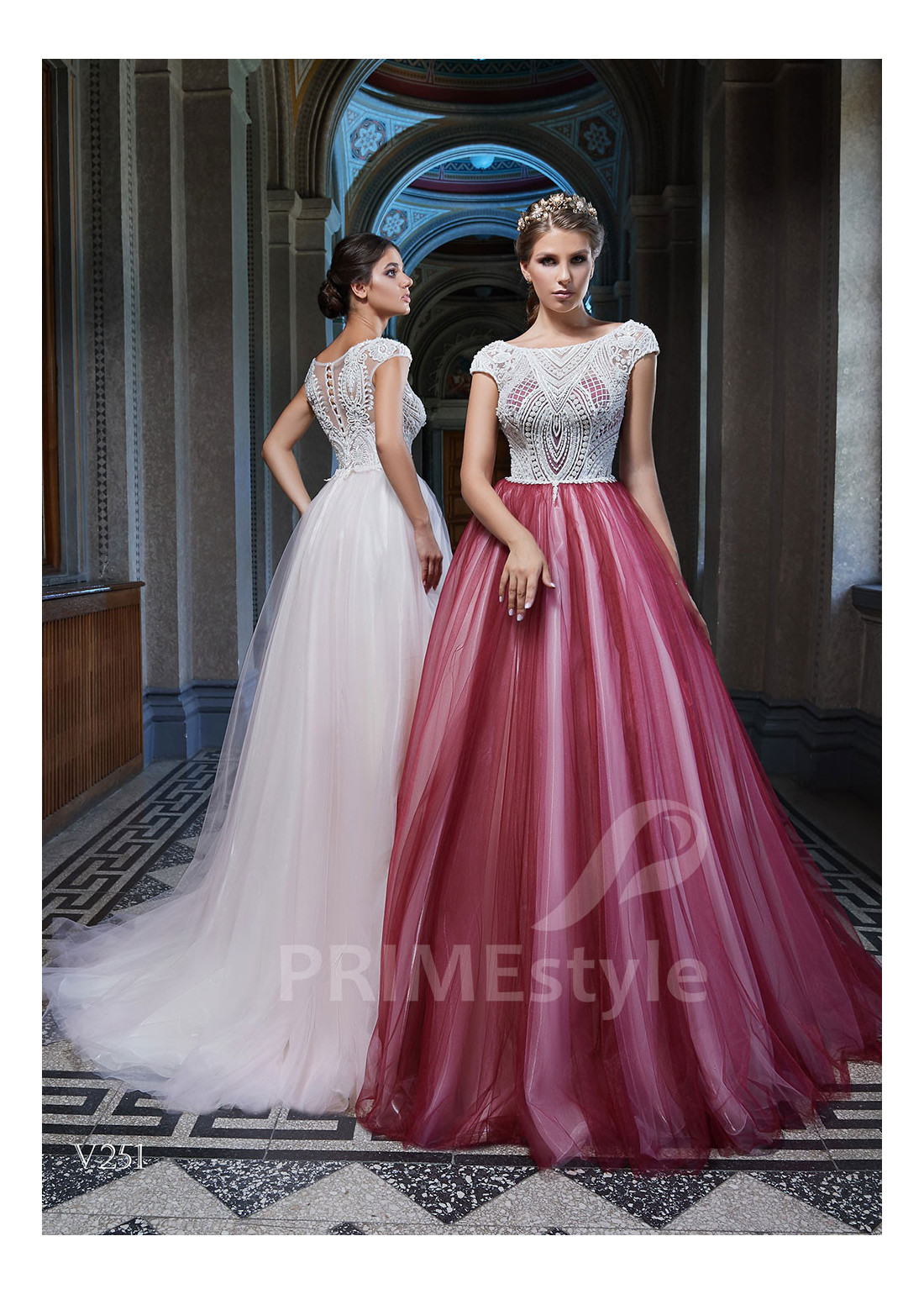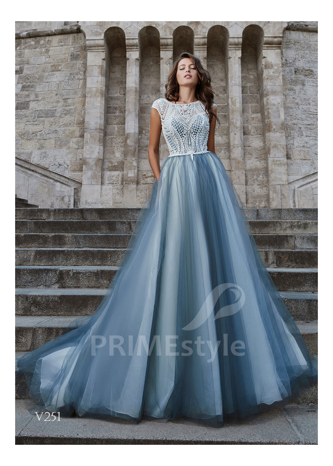 Krásne dlhé spoločenské šaty s lodičkovým výstrihom, prekrytým chrbtom a ľahkou farebnou tylovou sukňou. Korzet je zdobený bohatou vyšívanou čipkou. Vhodné aj ako šaty na ples, šaty na stužkovú a popolnočné šaty.